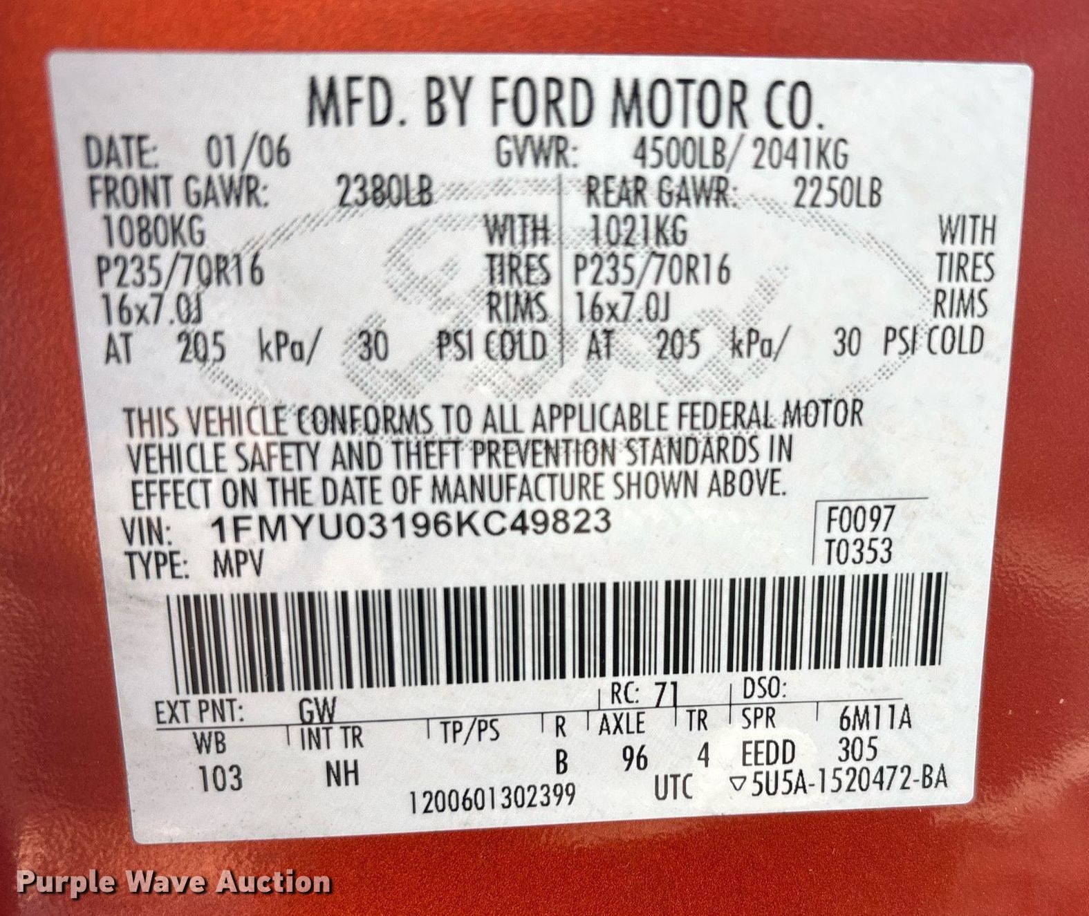 - VIN: 1FMYU03196KC49823