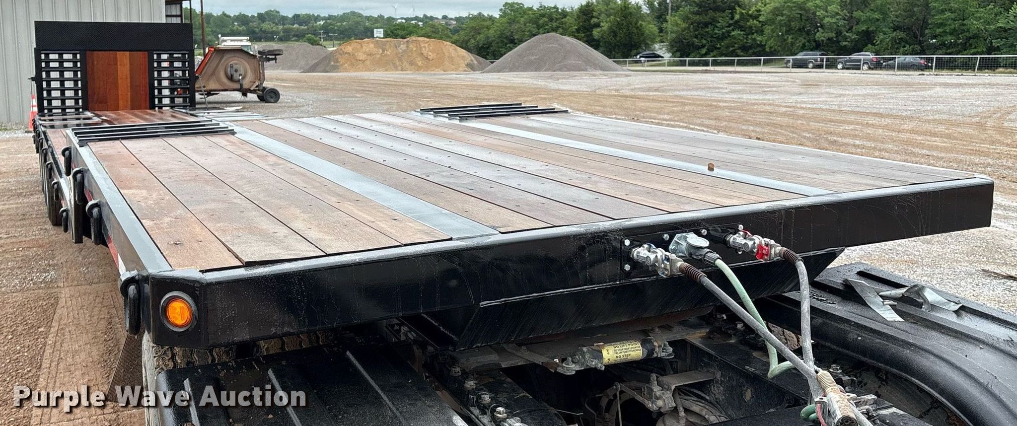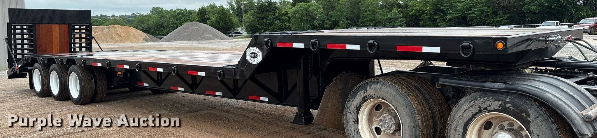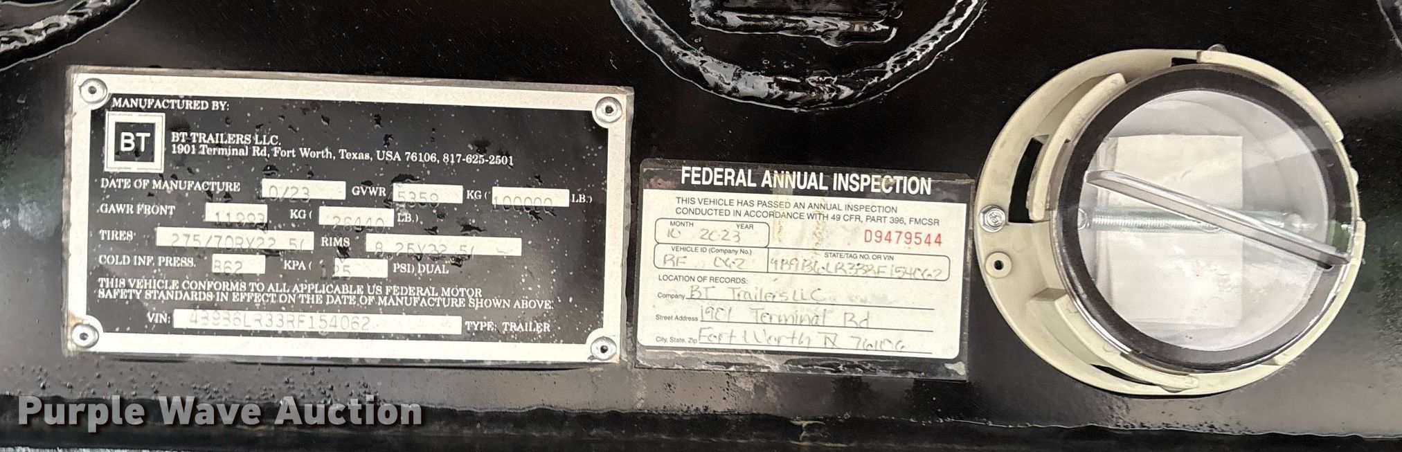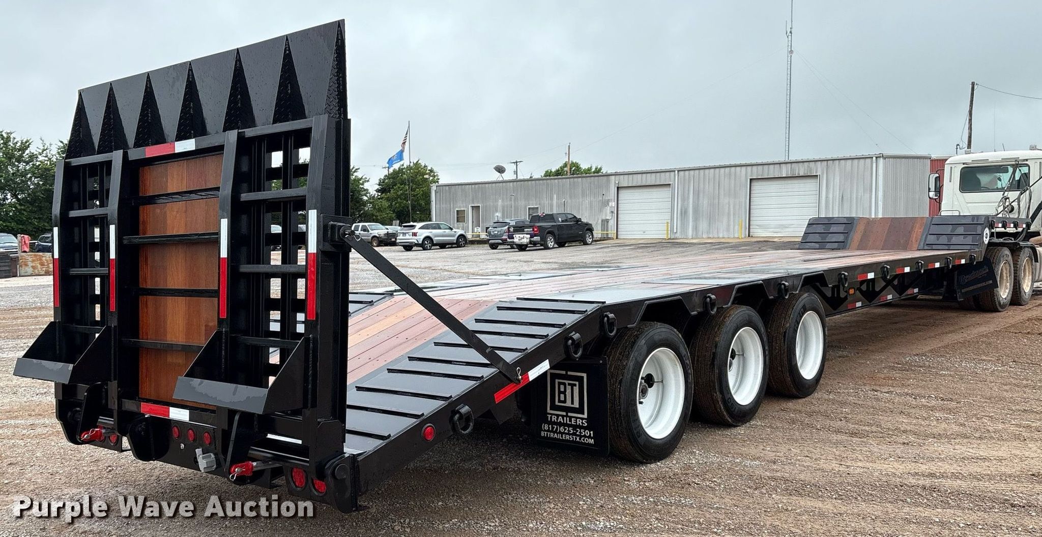 2024 BT Trailers drop deck equipment trailer. VIN: 4B9B6LR33RF154062. Dimensions Overall: 46' L x 102" W, Deck: 30' L x 102" W, Top deck length: 10', Deck height: 43", Tail length: 6', Ramps: Hydraulic Length: 6'. Features Deck type: Wood, Self-contained hydraulics, Hydraulic controls: Remote control. Chassis Landing gear: Dual, Suspension: Air, Brakes: Air, Axles: Triple, GVWR: 100,000 lbs. Tires Steel wheels, Size: 255/70R22.5. Oklahoma title. Title distribution may be delayed up to 30 days from verification of funds. Grady County. Rush Springs, OK 73082
