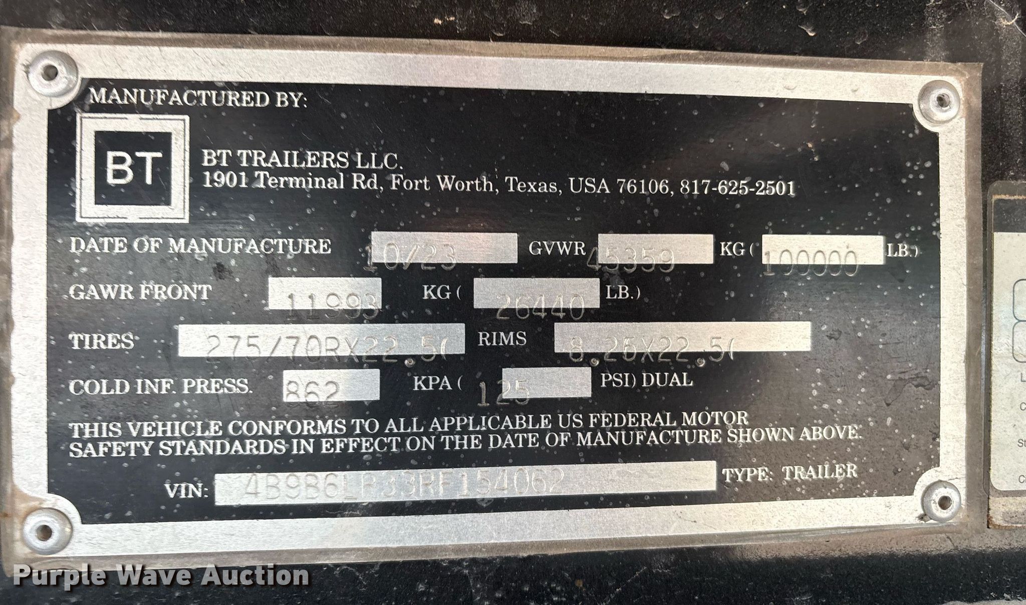 Purple Wave is selling a used Flat or Drop Deck Trailer in Oklahoma. This item is a 2024 BT Trailers drop deck equipment trailer with the following: VIN: 4B9B6LR33RF154062