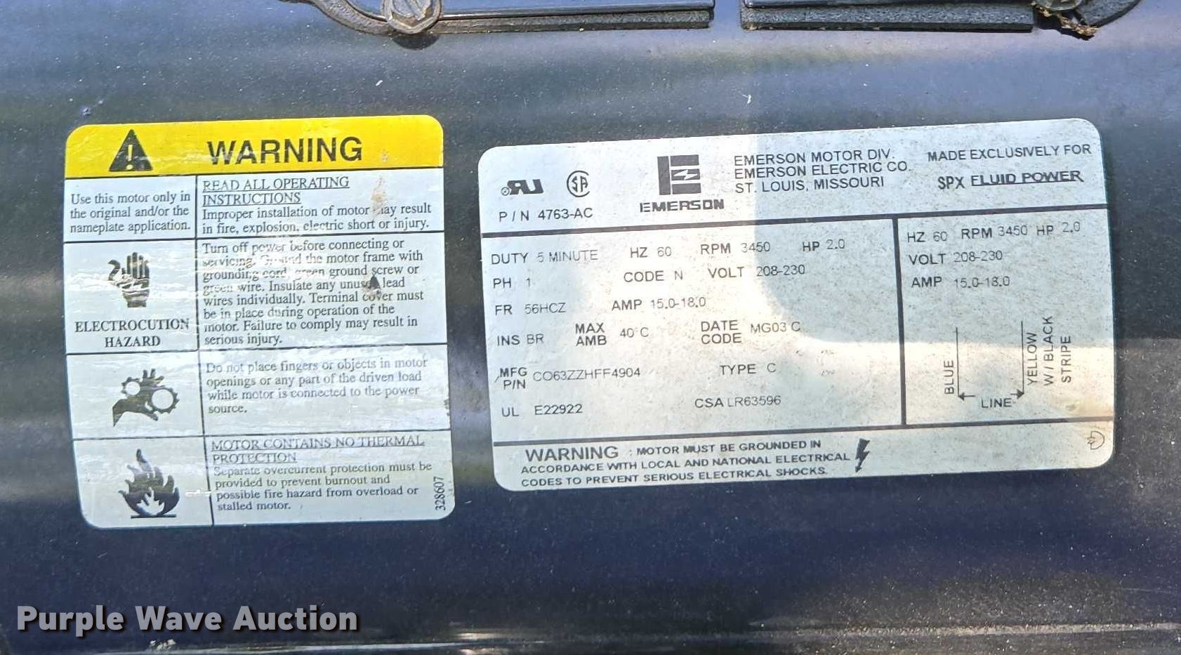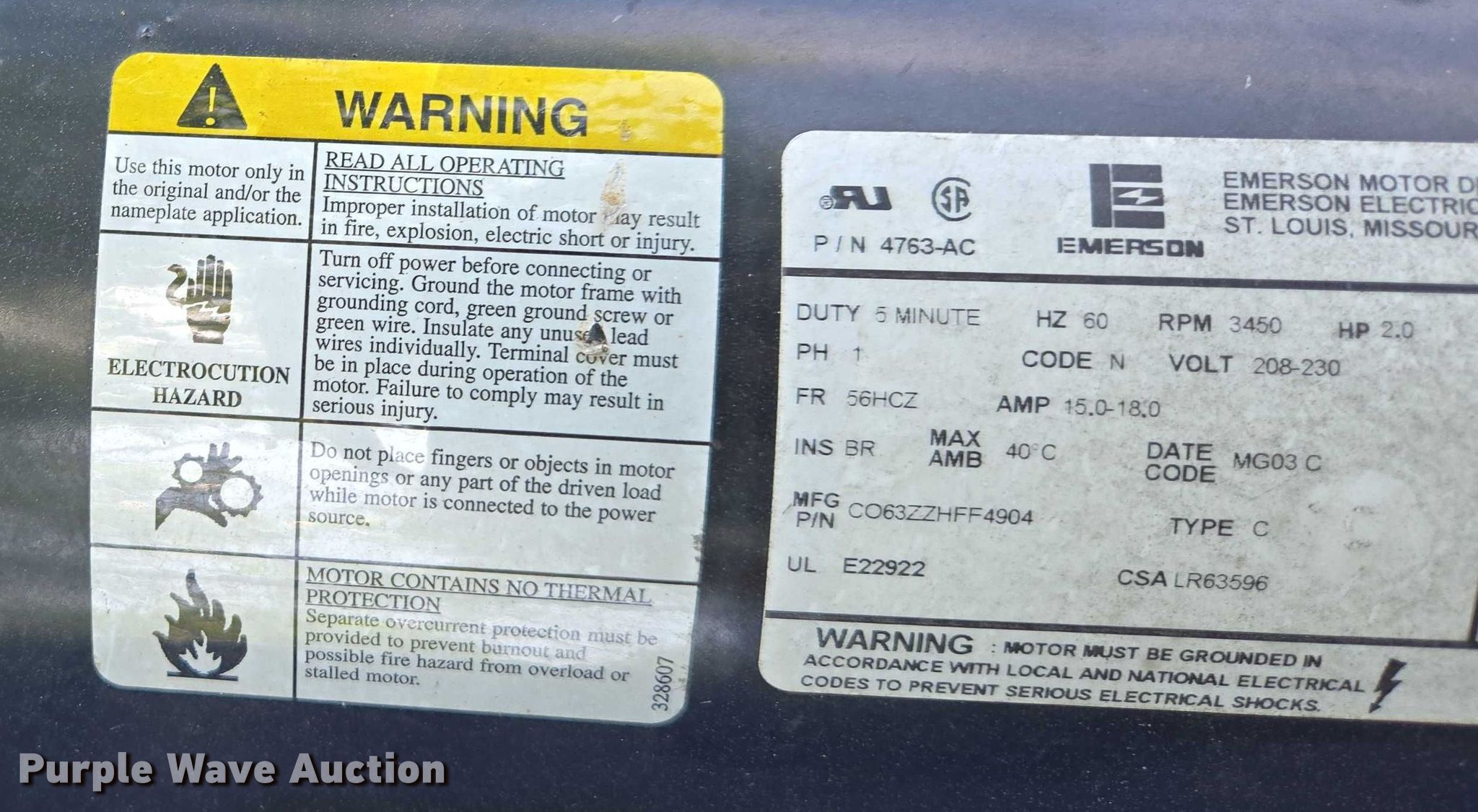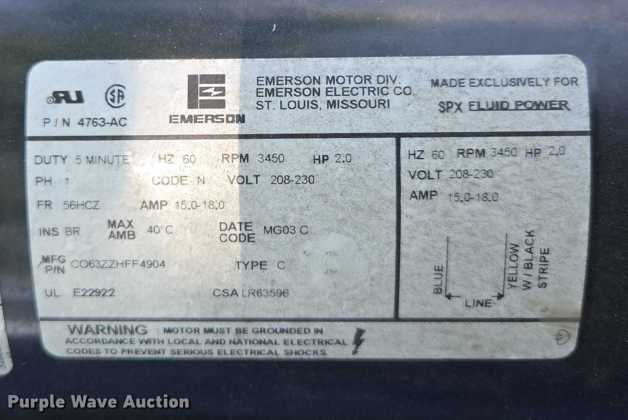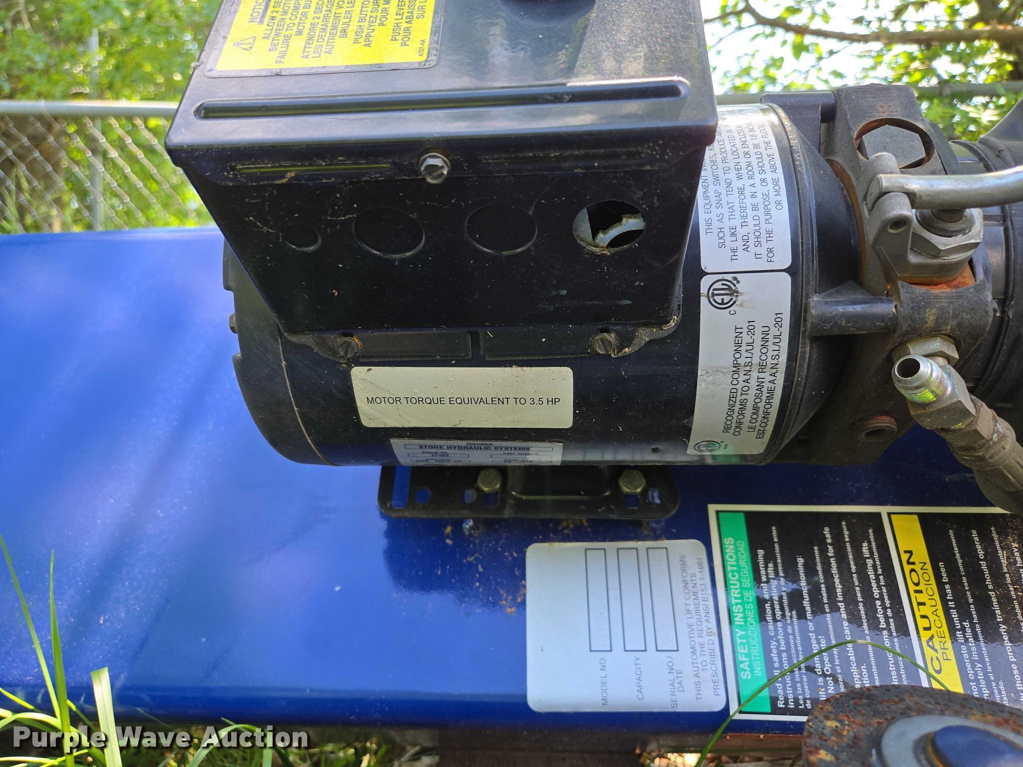 Automotive lift. Capacity: 9,000 lbs. Electric motor Emerson, HP: 2, Volts: 208-230, Phase: Single. Stone County, MO Sheriffs Office. Galena, MO 65656