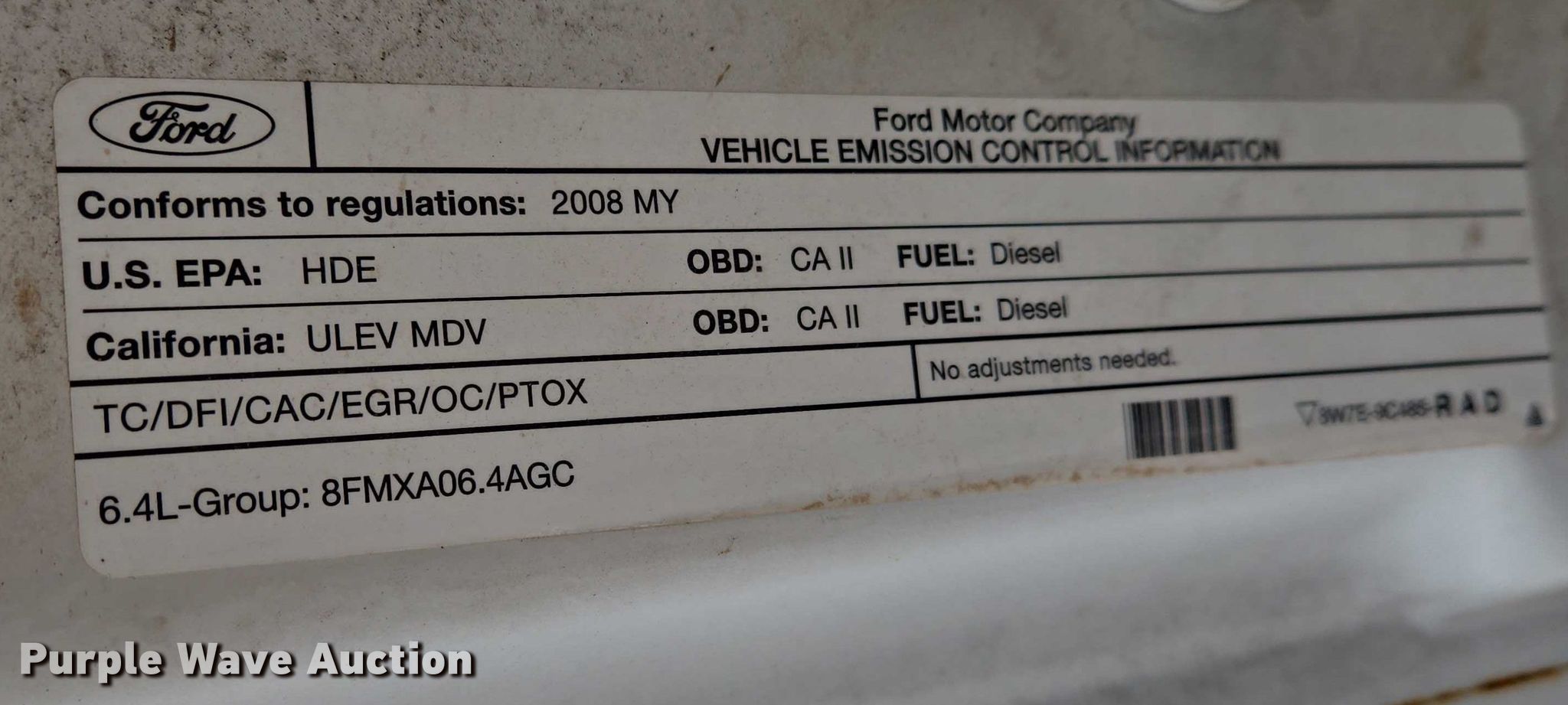 2008 Ford F250 Super Duty XL pickup truck. Miles: 98,373 on odometer, Miles or hours may vary, unit still in use, VIN: 1FTSF20R08EC00814. Engine Displacement: 6.4L V8 OHV, Cylinders: 8, Fuel type: Diesel. Transmission Automatic. Interior AC, Heat. Tires Size: 245/75R17. Kansas title. Title distribution may be delayed up to 14 days from verification of funds. City of Derby. Derby, KS 67037