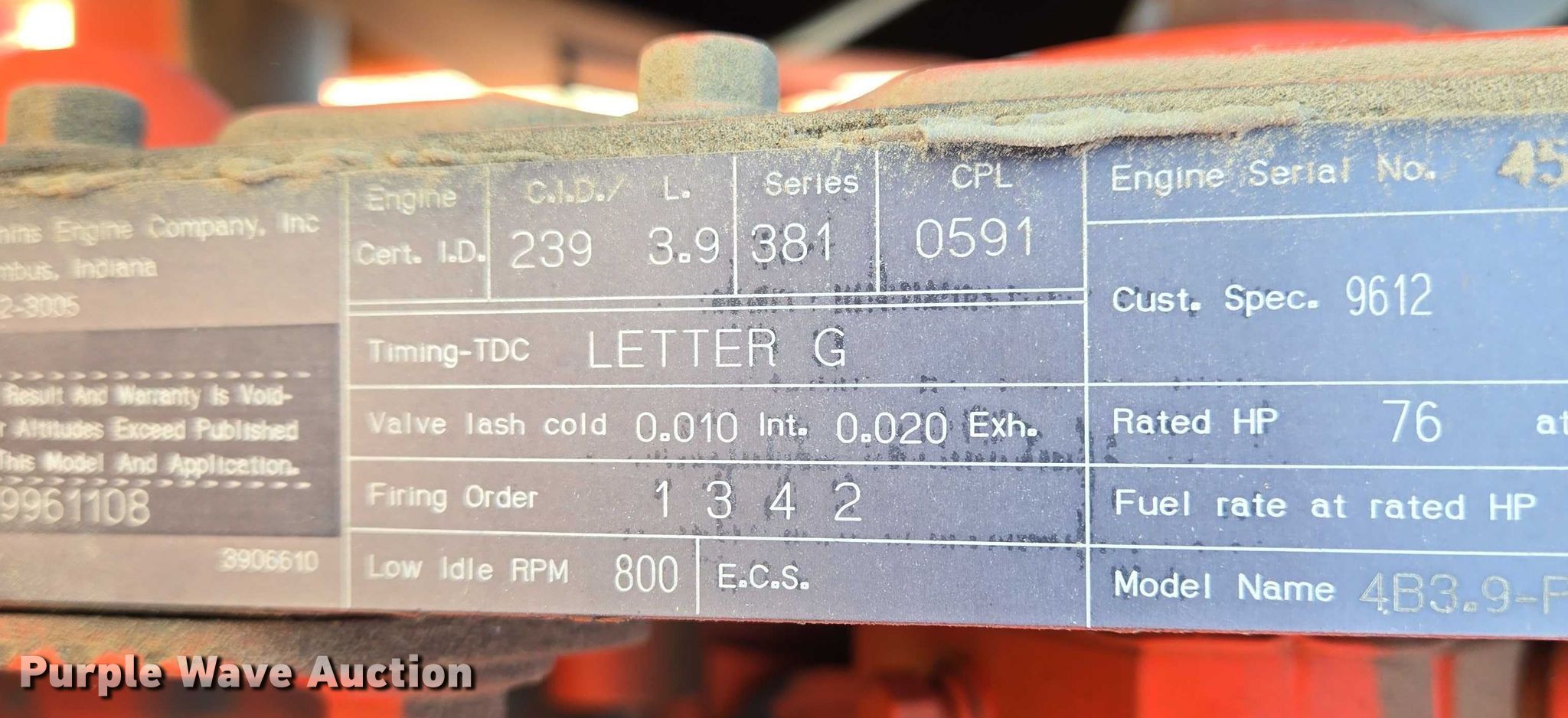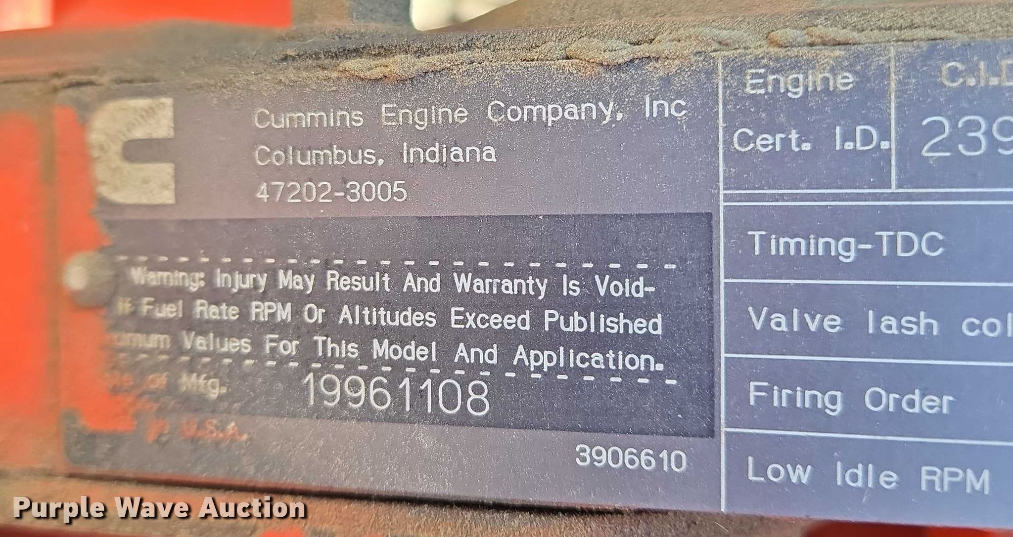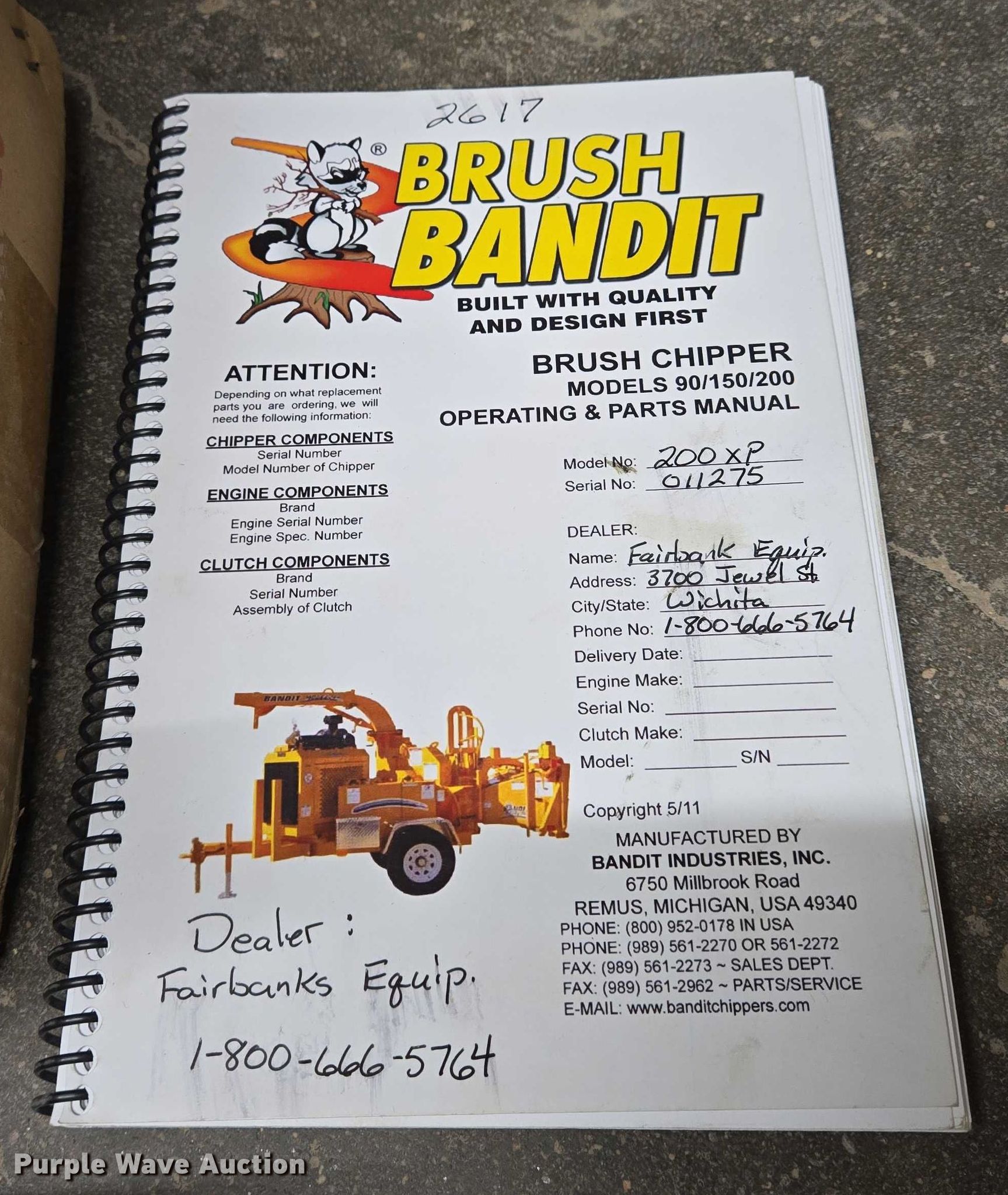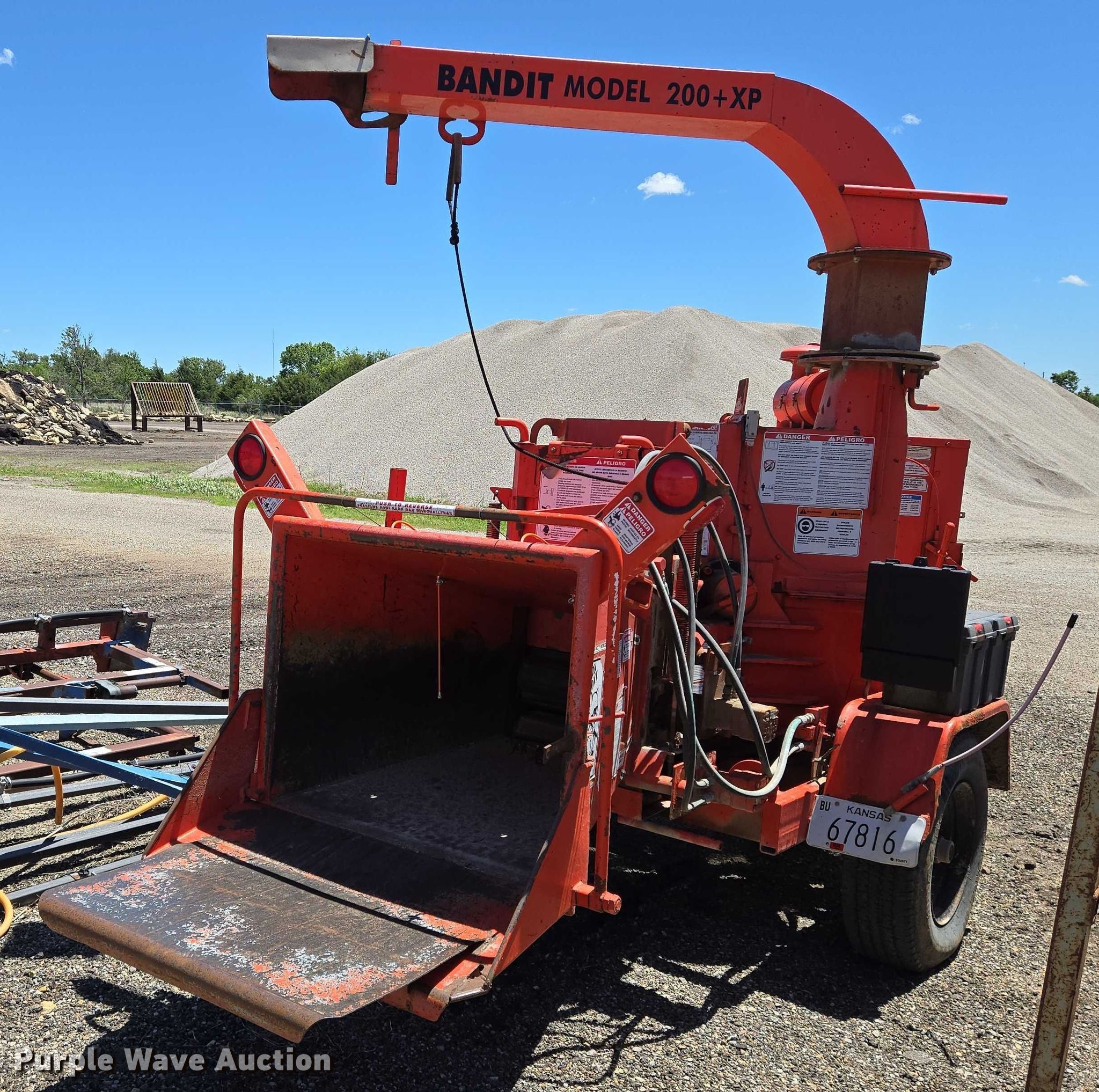 1997 Brush Bandit 200 XP wood chipper. Hours: 1,791 on meter, VIN: 011275, Serial: 97A240032. Engine Cummins, Serial: 45434780, Displacement: 3.9L, Cylinders: 4, Fuel type: Diesel. Features Capacity: 12", Throat opening: 18" x 18". Trailer 14' L x 72" W, Suspension: Torsion, Brakes: Electric, Axles: Single, Tire size: 9.5R16.5LT. Notes Dead battery. This is worksite support equipment and will not come with a title. Transfer of ownership documentation will be a bill of sale. Butler County. El Dorado, KS 67042