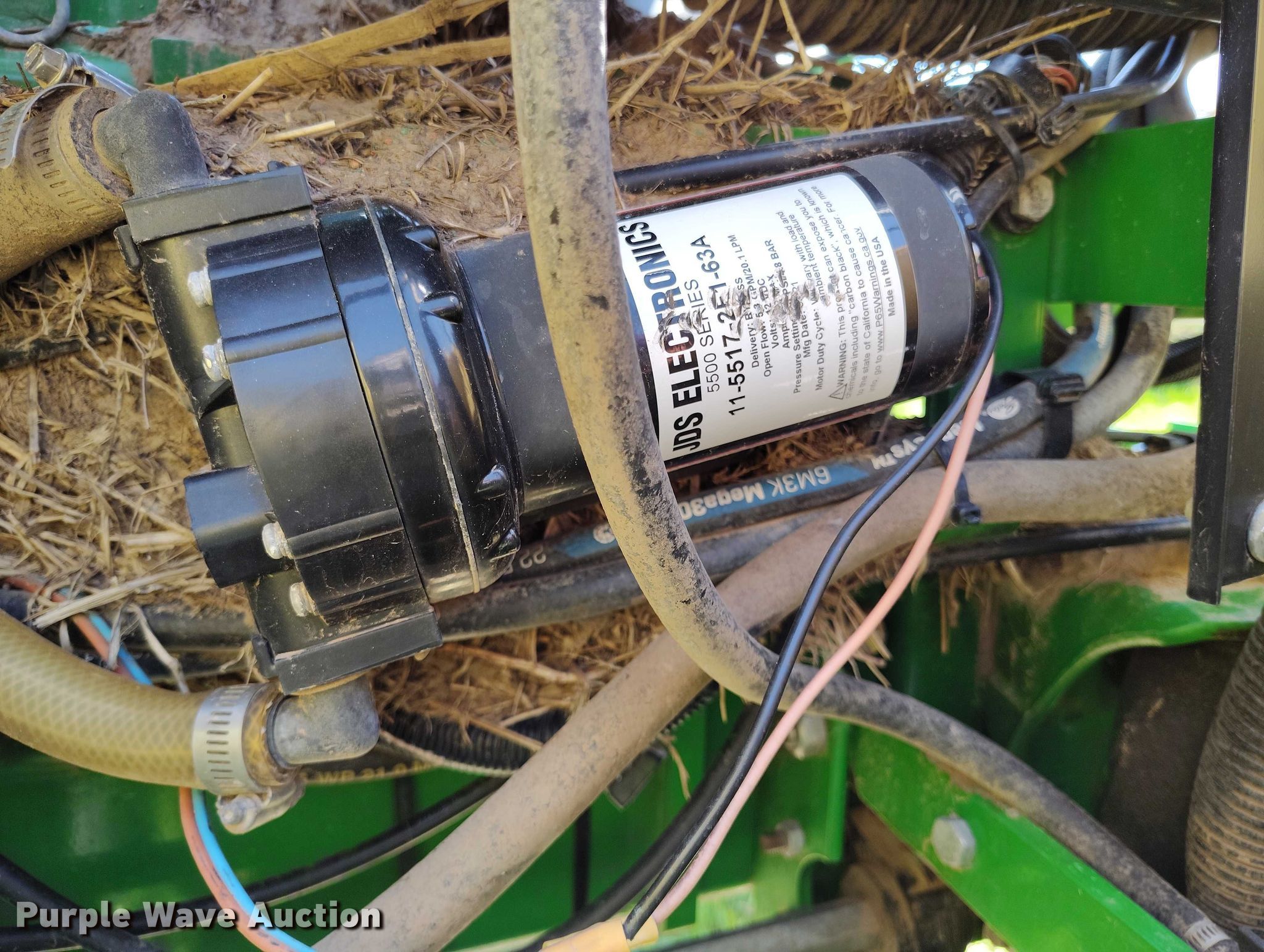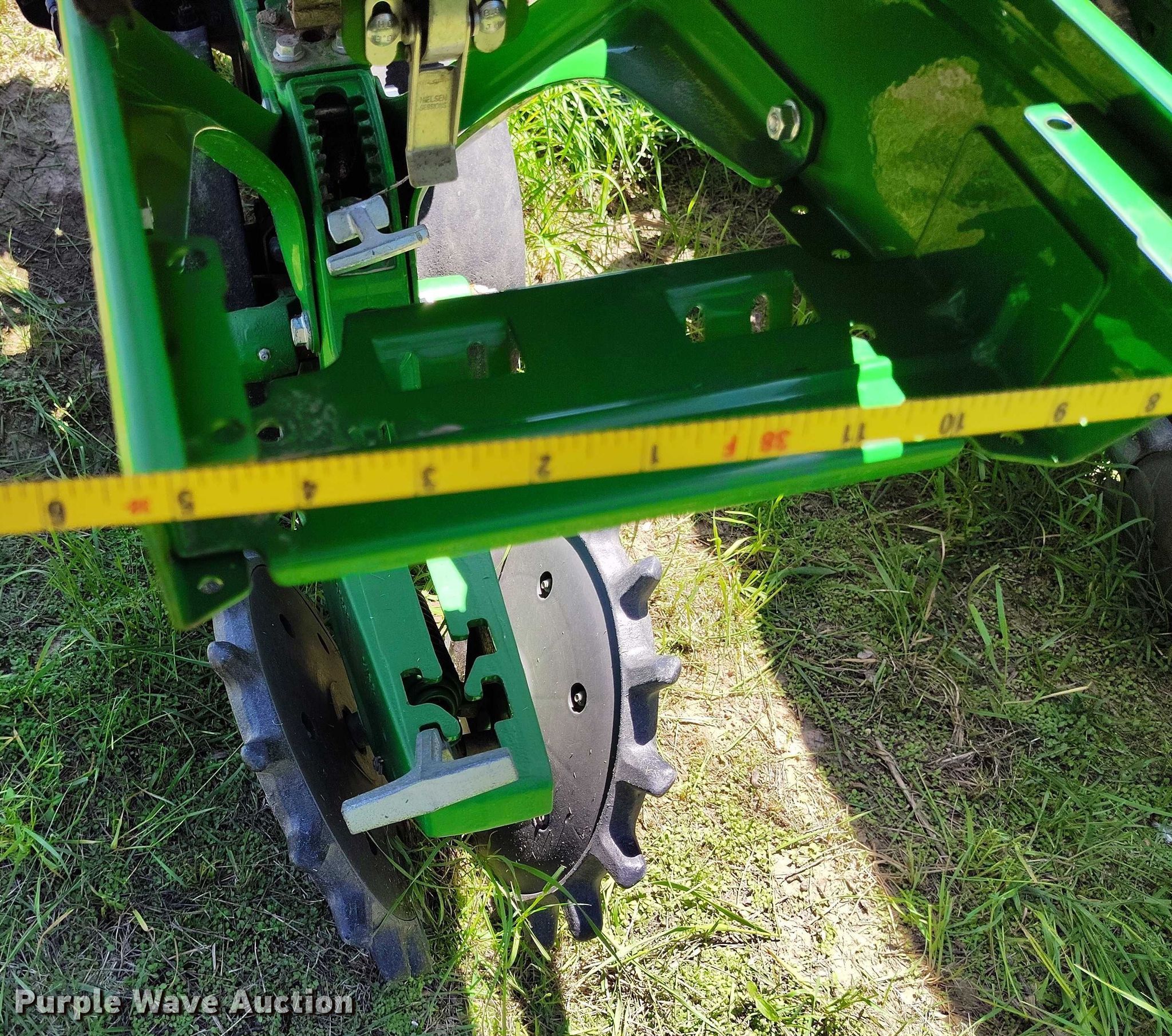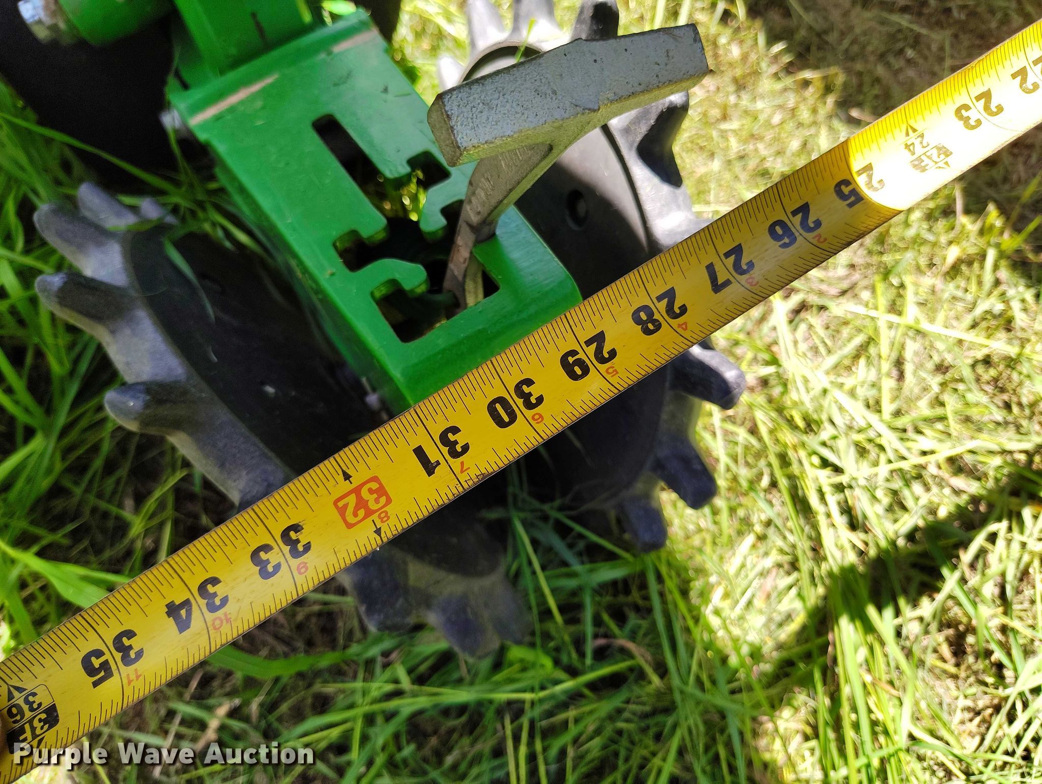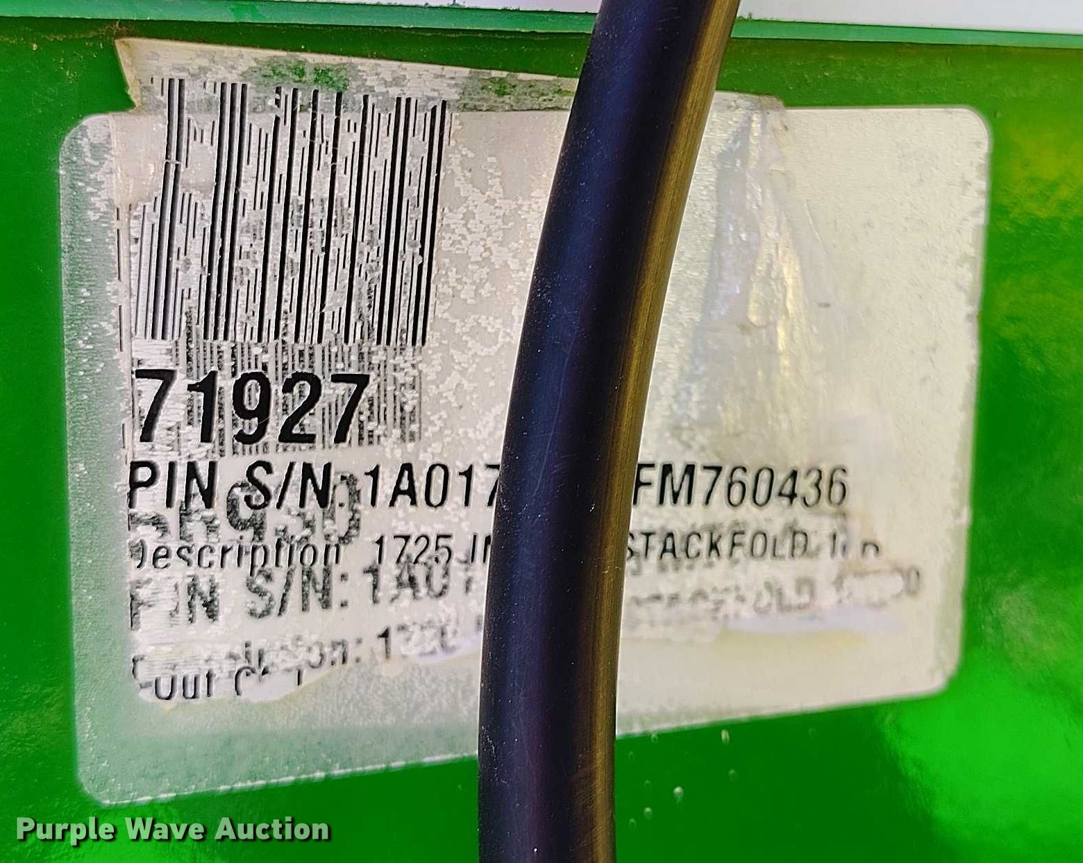 2015 John Deere 1725 planter. Width: 38.5', Row units: 16, Row spacing: 30", Serial: 1A01725REFM760436. Features Frame Hitch: Three point, Fold type: Wing, Seed delivery Individual seed hoppers, Row units Vacuum metering, Meter drive: Hydraulic, Down pressure: Pneumatic, Row cleaners, Disk openers: Double, Gauge wheels: Double, Closing system: Double Type: Spiked, Fertilizer/ insecticide Fertilizer, Pump: Piston Raven, Electronics Monitor Acres: 24,988 on meter.. Tires Transport tire size: 9.5L-15 Quantity: 2, Drive/ outside tire size: 7.60-15 Quantity: 4. Notes Monitor not included. Midwest Harvesting LLC. Matheson, CO 80830