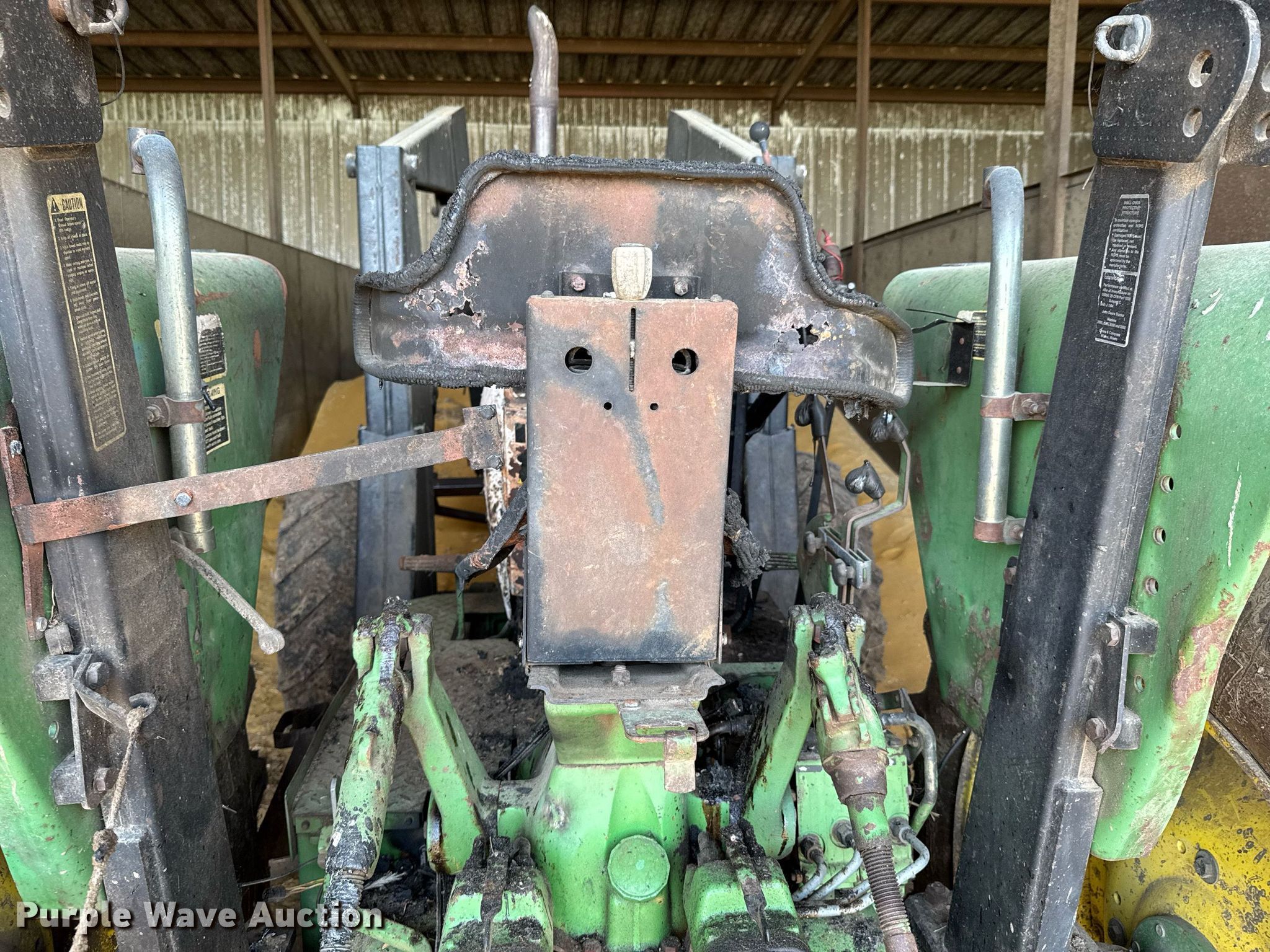 1991 John Deere 2955 MFWD tractor. Hours: Unknown, Serial: L02955U729086, Insurance salvage unit claim #: 5-807223. Engine John Deere 6359 DL-009, Serial: CD6359D920381, Cylinders: 6, Fuel type: Diesel. Transmission Synchro, 8F - 4R. Features PTO: 540, Three point Top link, Hydraulic remote sets Rear: 2, Loader Farmhand XL1340, Bale spear, Controls: Joystick. Tires Front: 13.6-28, Rear: 18.4-38, Wheel weights: 2. Notes Fire damage, Non-operational unit. Oklahoma Farm Bureau Insurance. Lenapah, OK 74042