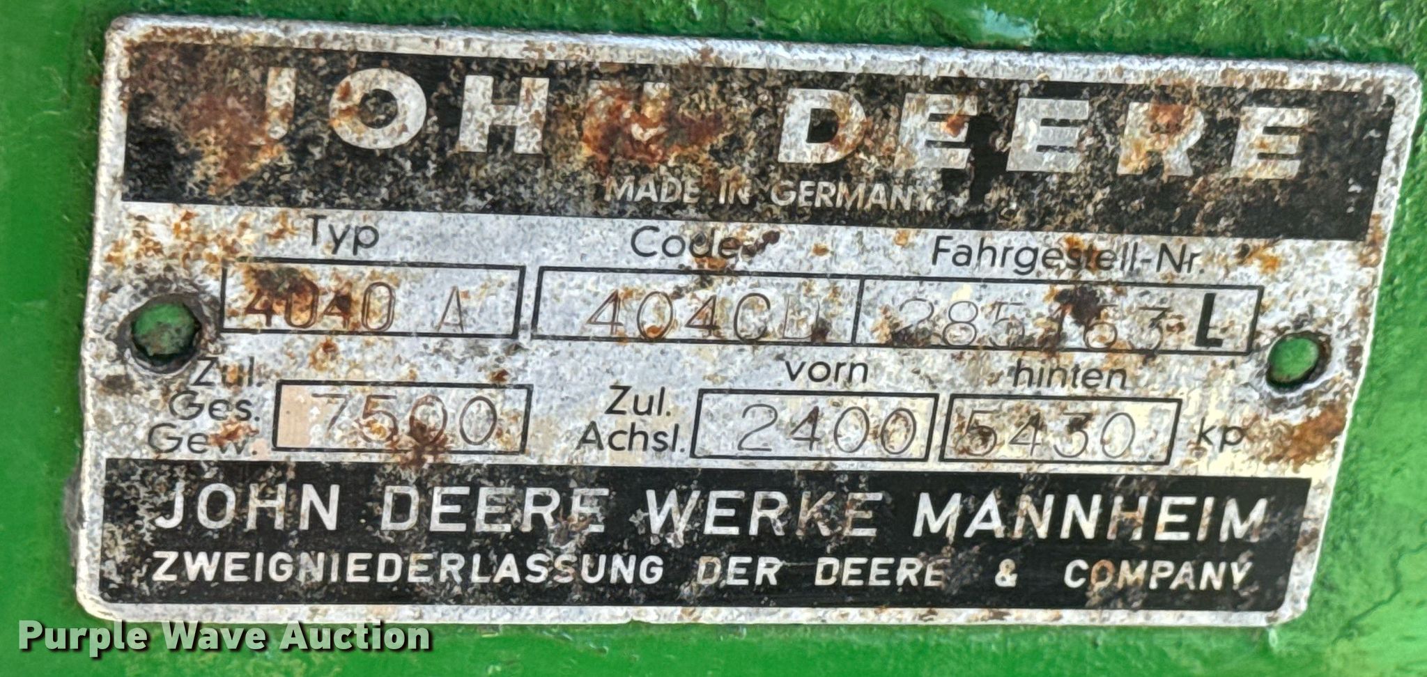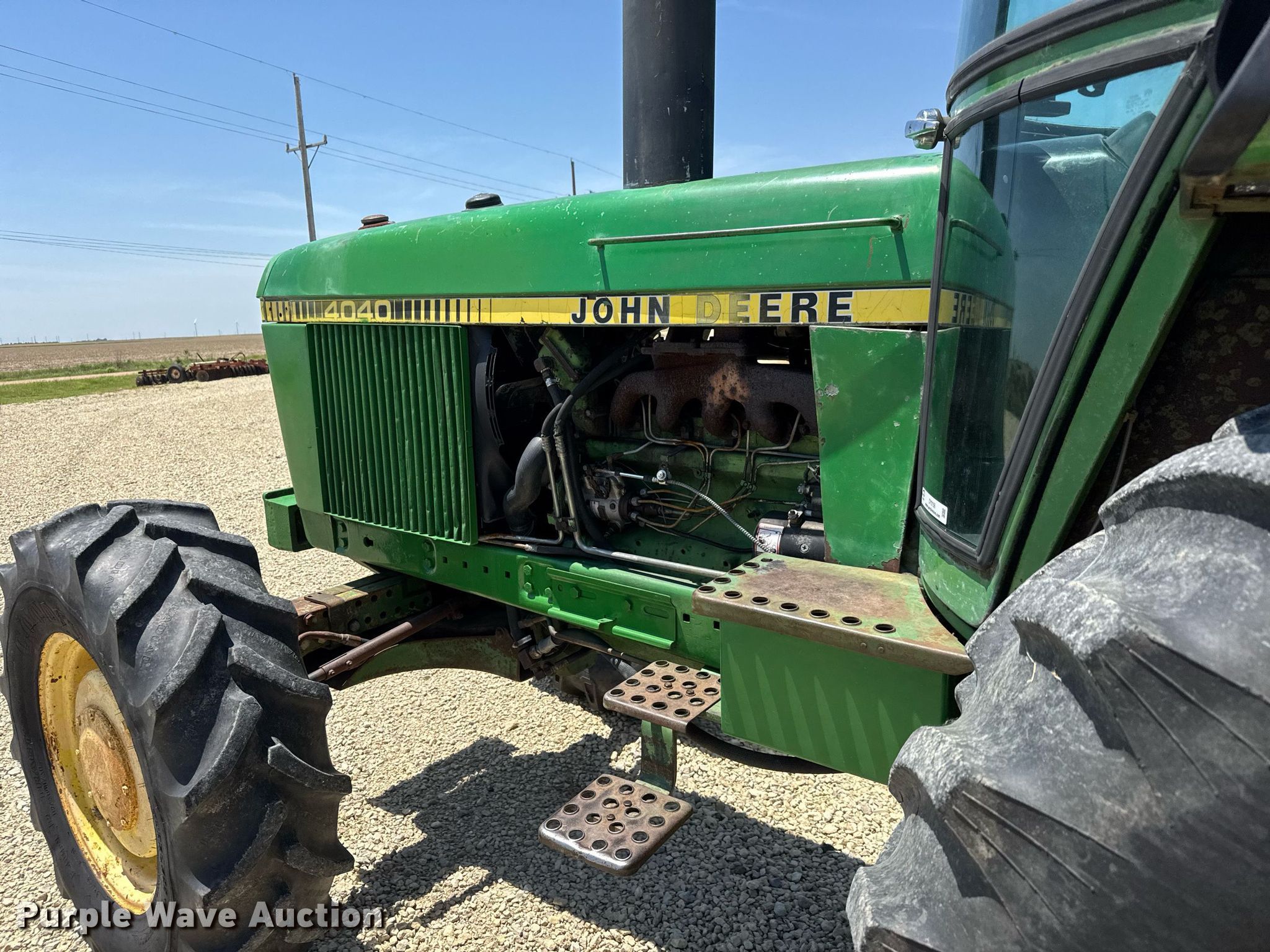 John Deere 4040 MFWD tractor. Hours: 5,580 on meter. Engine John Deere 6359TL-01, Serial: 361816CD, Cylinders: 6, Fuel type: Diesel. Transmission Quad-range, 16F - 6R, Differential lock. Operators station AC, Heat. Features PTO: 540, 1000, Three point Top link, Hydraulic remote sets Front: 1. Tires Front: 13.6-24, Rear: 18.4-38. Notes Possible MFWD issues, Injector issues. Greensburg, KS 67054