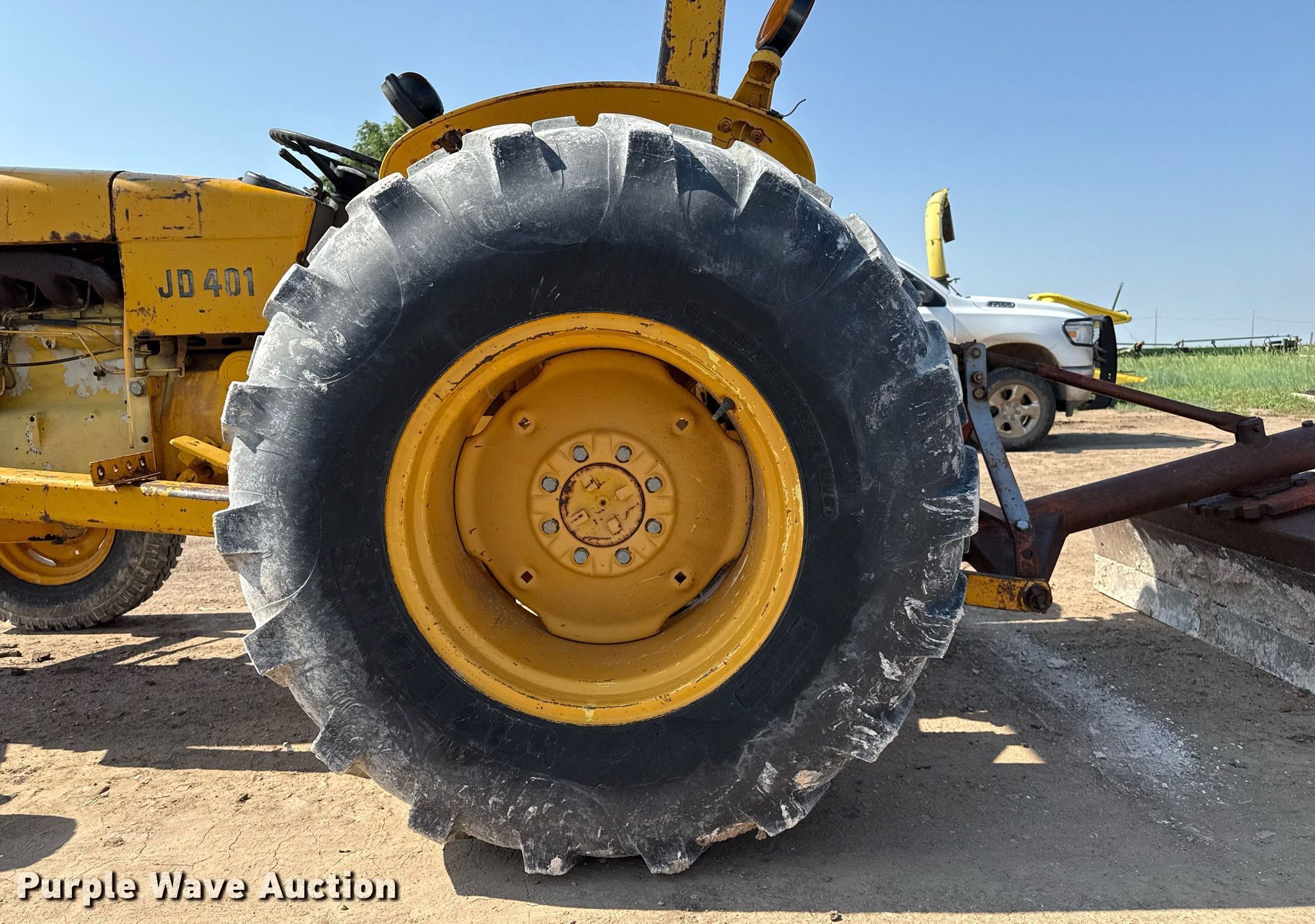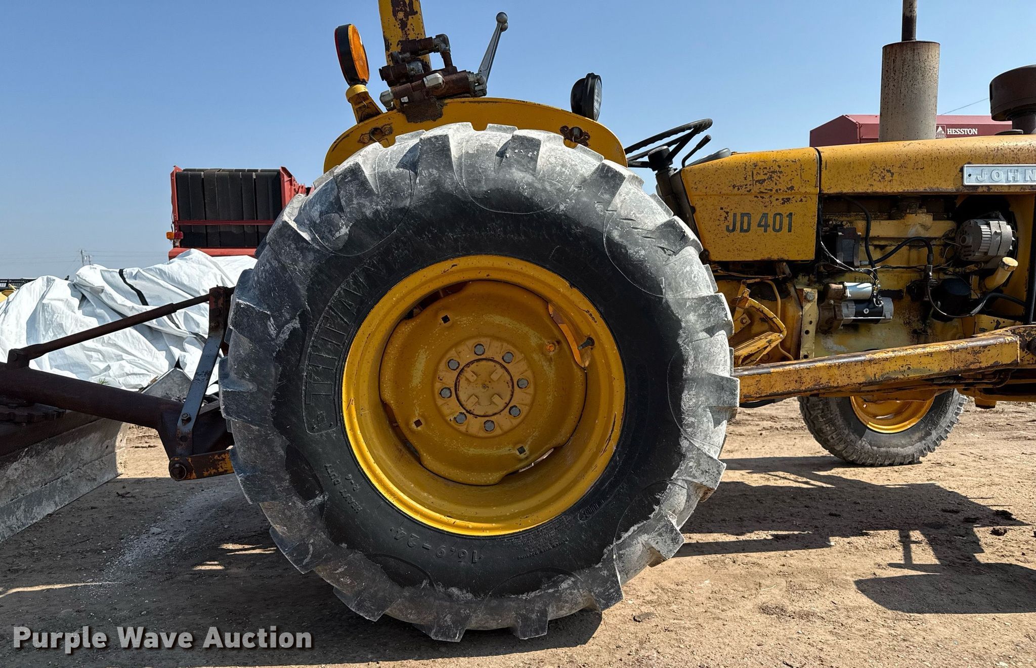 1973 John Deere 401Y tractor. Hours: Unknown, Serial: 164952T. Engine Cylinders: 4, Fuel type: Diesel. Transmission Powershift, 8F - 8R, Left-hand reverser. Features PTO: 540, Three point Top link, Hydraulic remote sets Rear: 2. Tires Front: 235/85R16, Rear: 16.9-24. Notes Three point blade not included. Plains, KS 67869