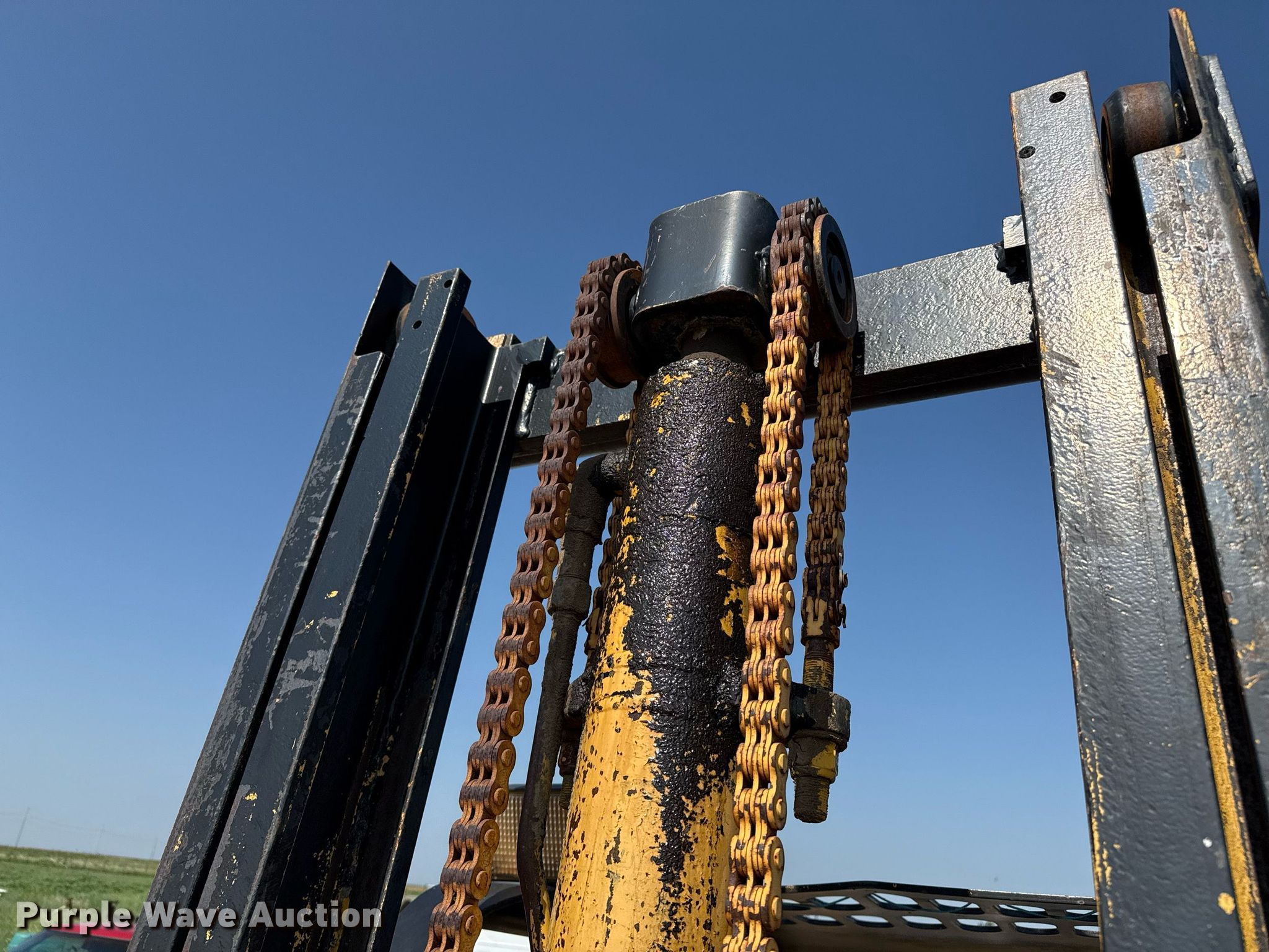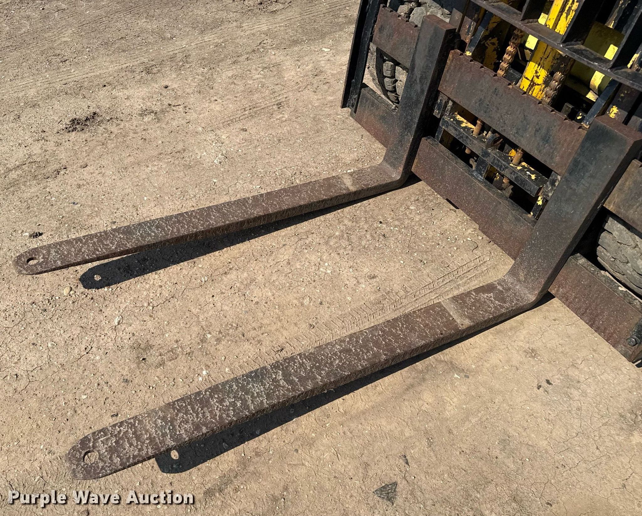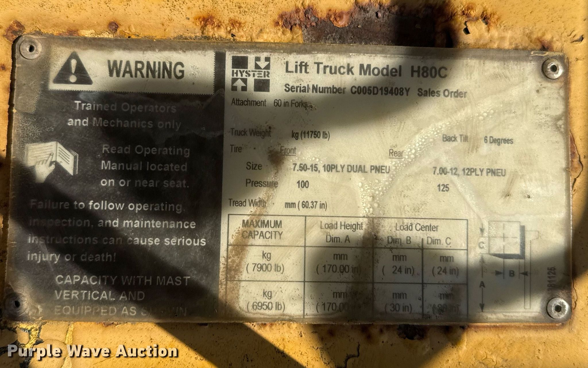 2001 Hyster H80C forklift. Hours: 1,856 on meter, Serial: C005D19408Y. Engine Cylinders: 6, Fuel type: Gas. Transmission Shuttle shift, 3F - 3R. Operators station Canopy. Features Maximum lift capacity: 17,416 lbs, Maximum lift height: 170", Collapsed mast height: 108", Mast stages: 2, Mast tilt, Fork length: 60". Tires Front: 8.25-15, Rear: 7.00-12. Plains, KS 67869