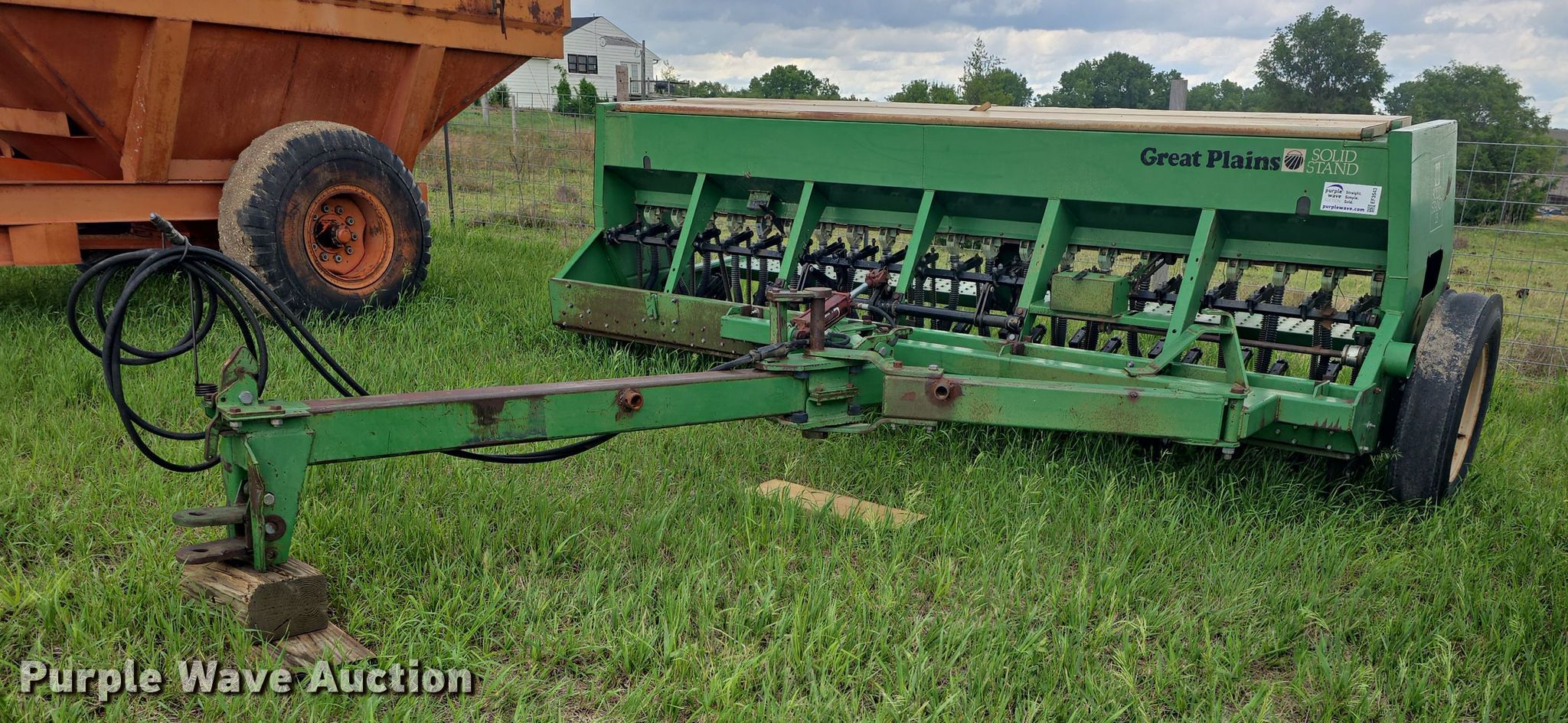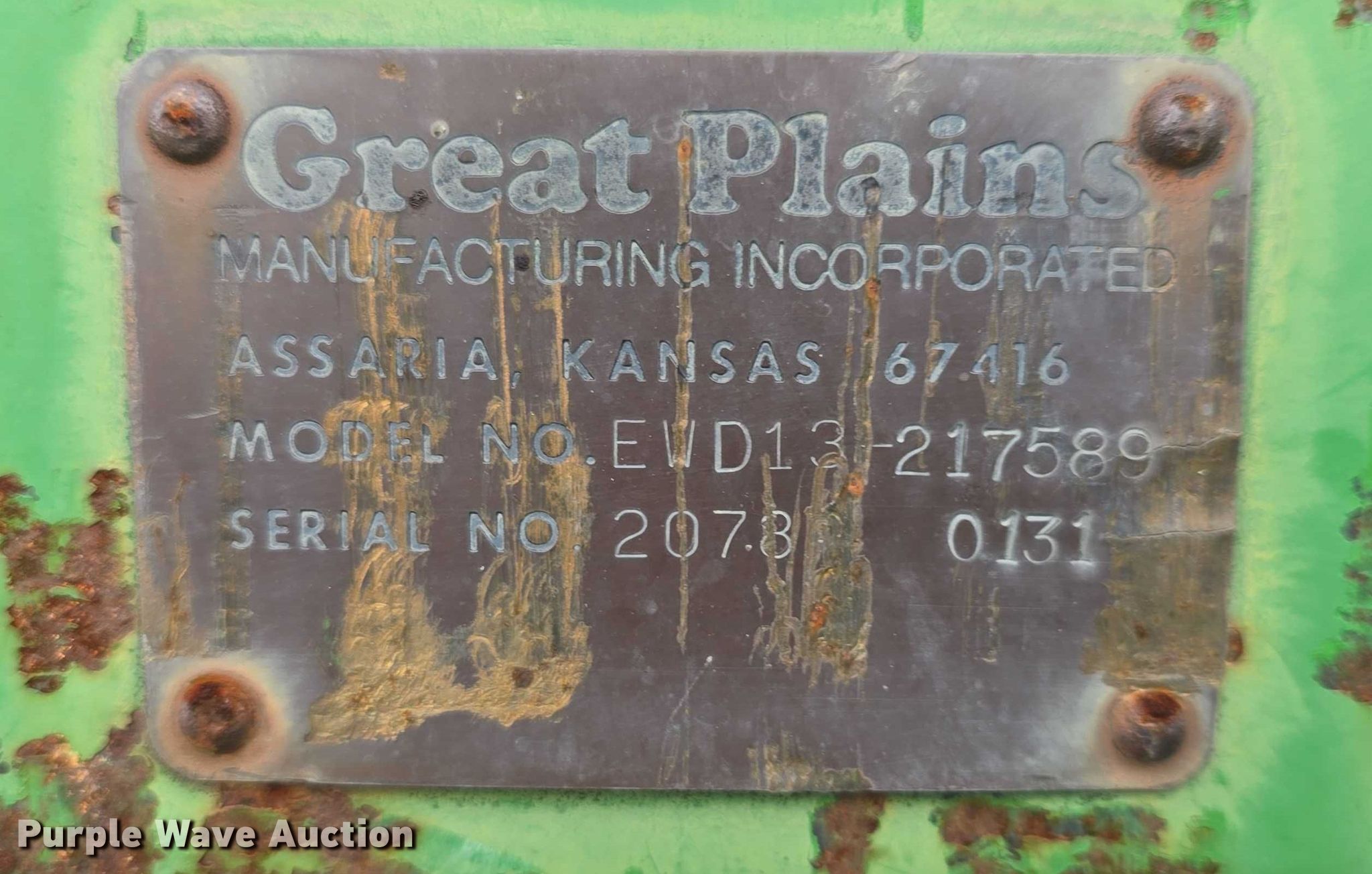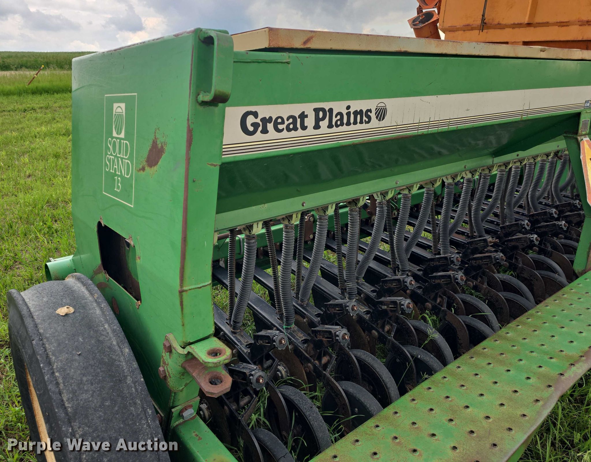 Great Plains Solid Stand 13 grain drill. Width: 13', Row units: 21, Row spacing: 7.5", Serial: 20780131. Features Seed delivery Bulk fill system, Row units Meter drive: Ground, Down pressure: Spring, Disk openers: Double, Closing system: Single Type: Rubber, Hitch: Pin. Tires Transport tire size: 7.50-20 Quantity: 2. Abilene, KS 67410