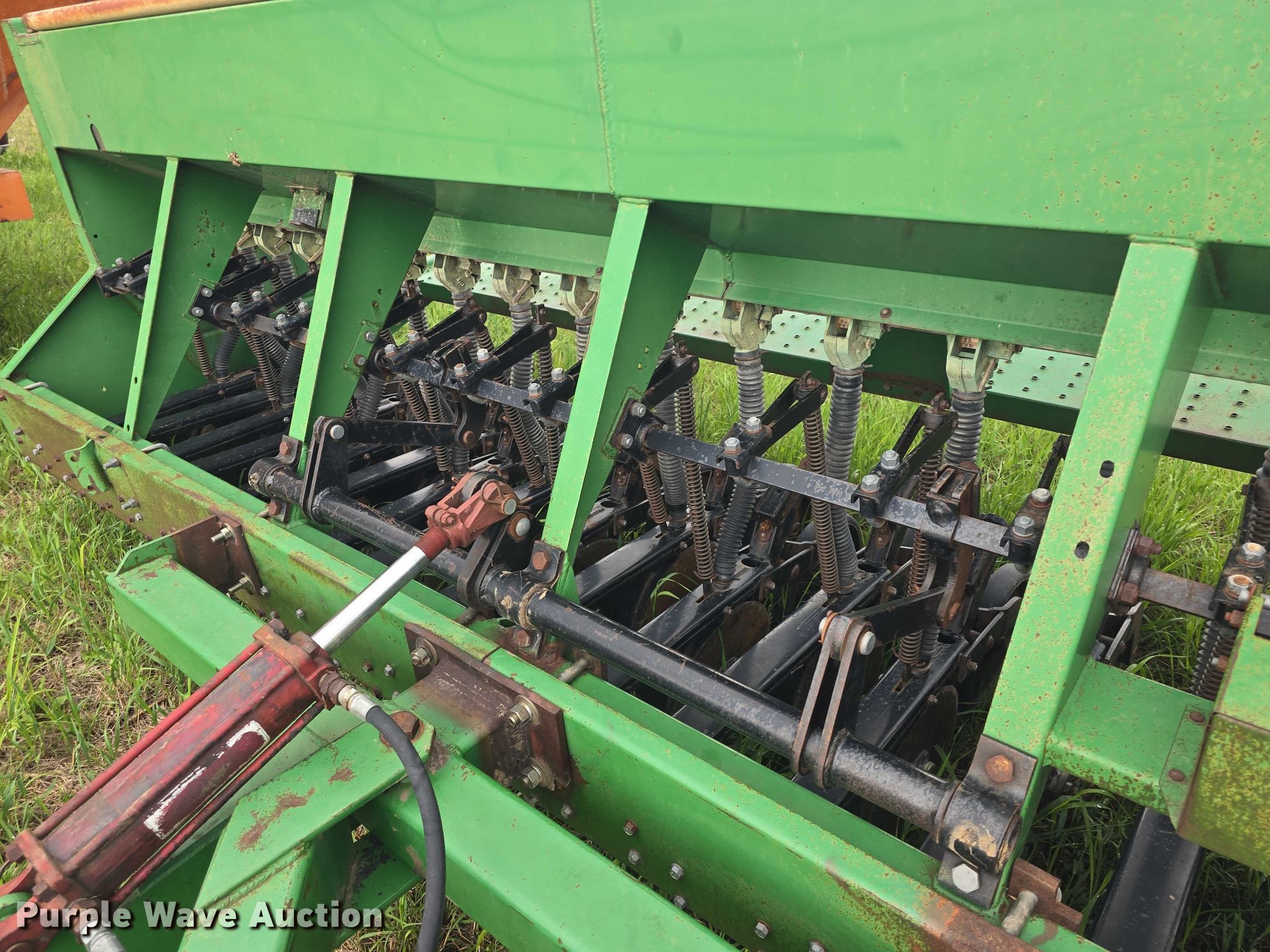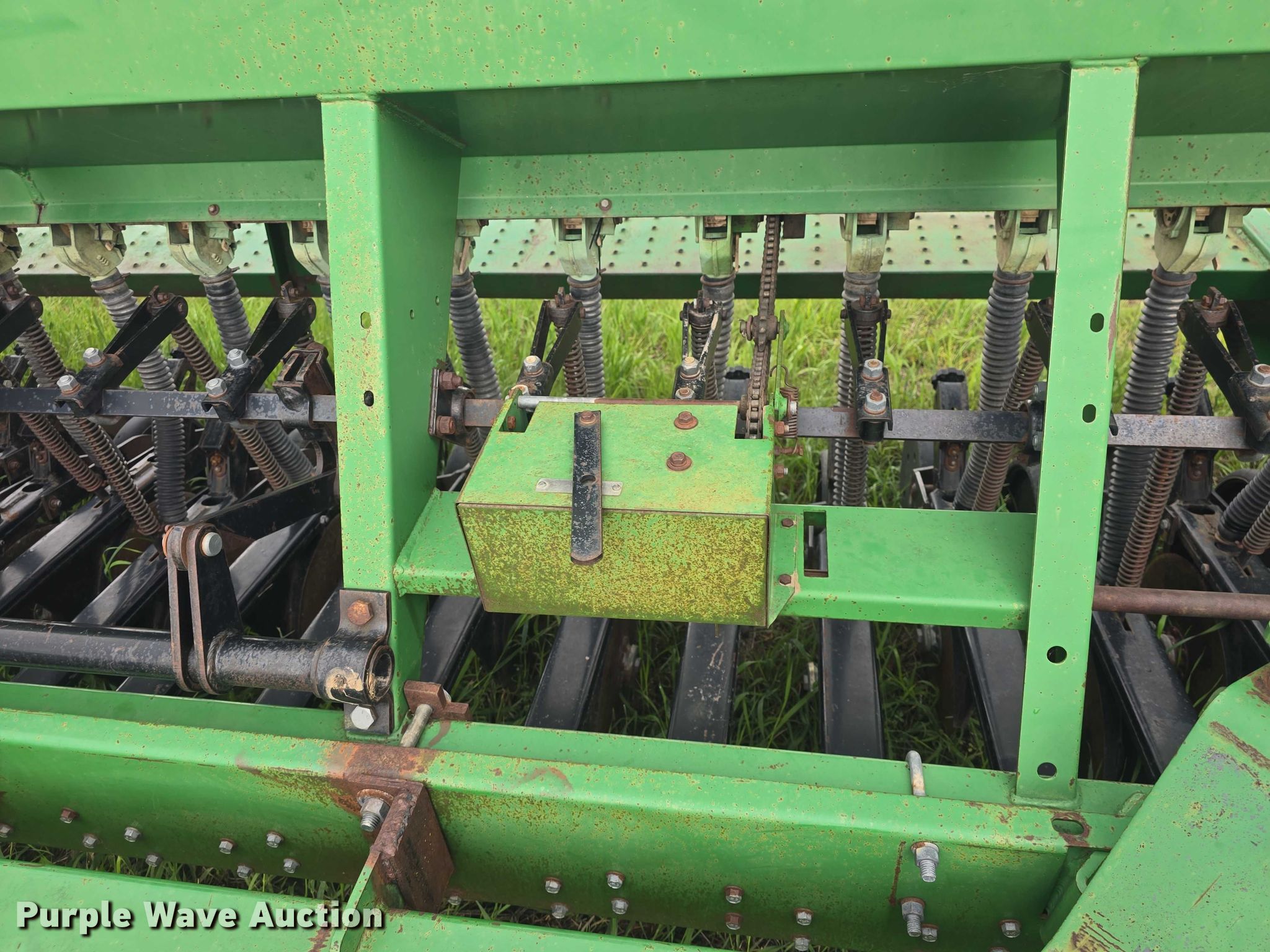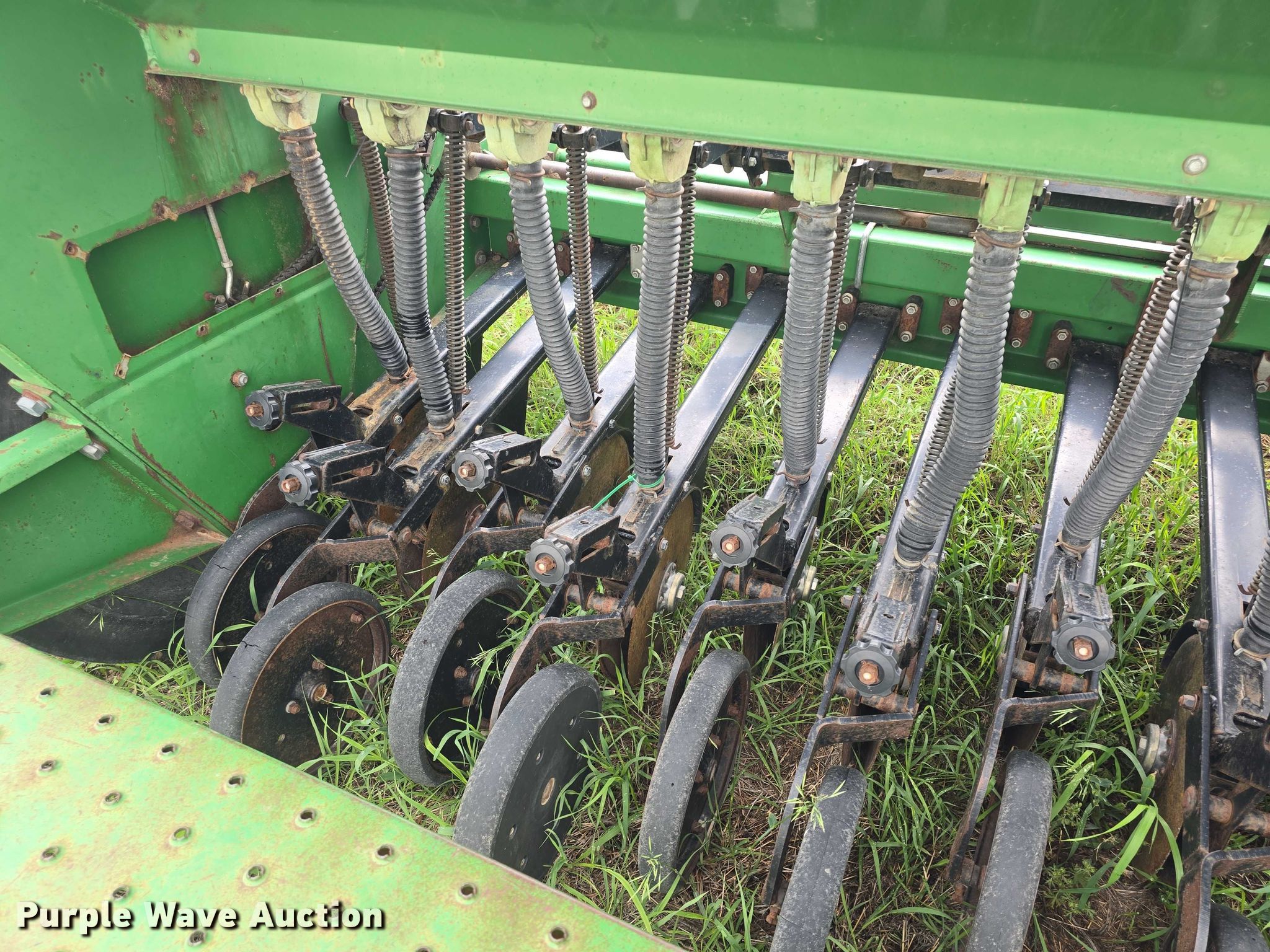 Great Plains Solid Stand 13 grain drill. Width: 13', Row units: 21, Row spacing: 7.5", Serial: 20780131. Features Seed delivery Bulk fill system, Row units Meter drive: Ground, Down pressure: Spring, Disk openers: Double, Closing system: Single Type: Rubber, Hitch: Pin. Tires Transport tire size: 7.50-20 Quantity: 2. Abilene, KS 67410