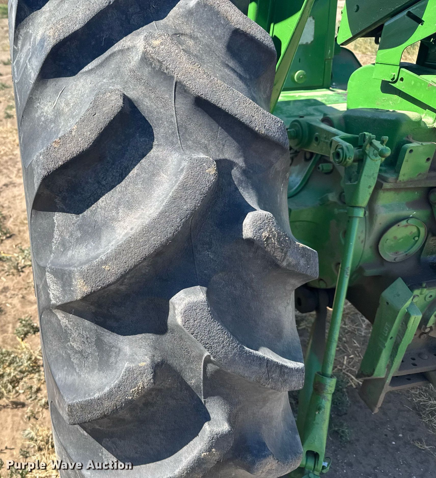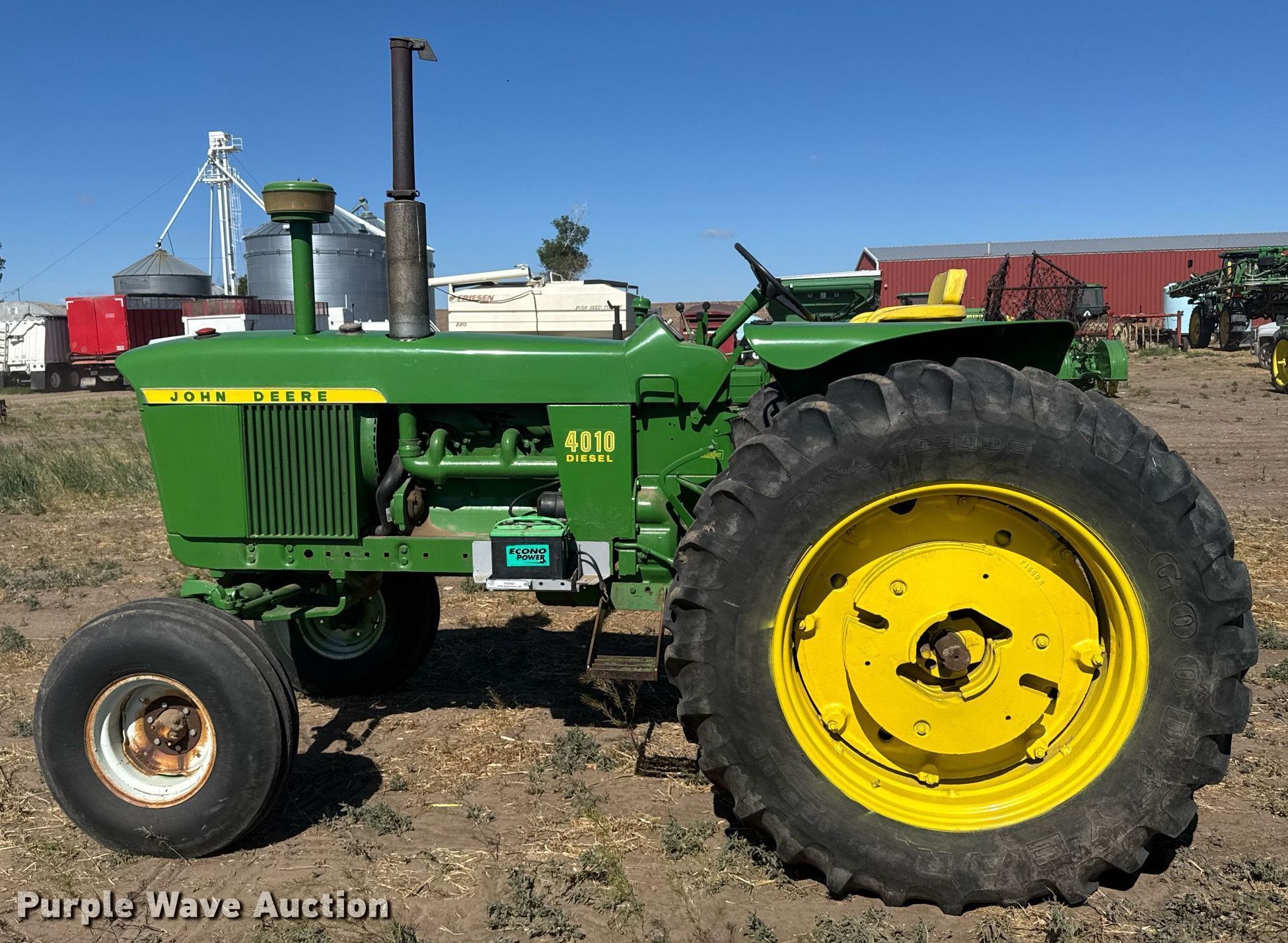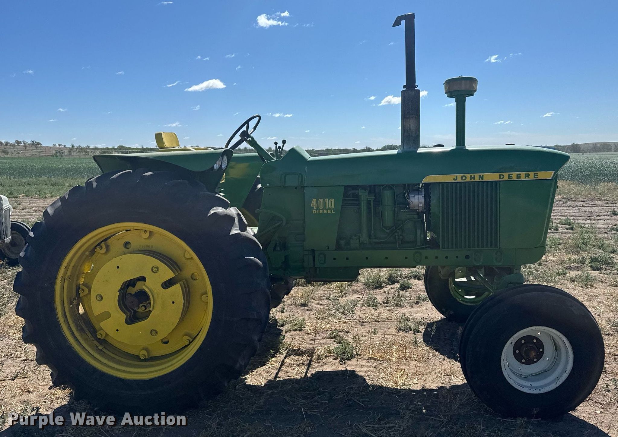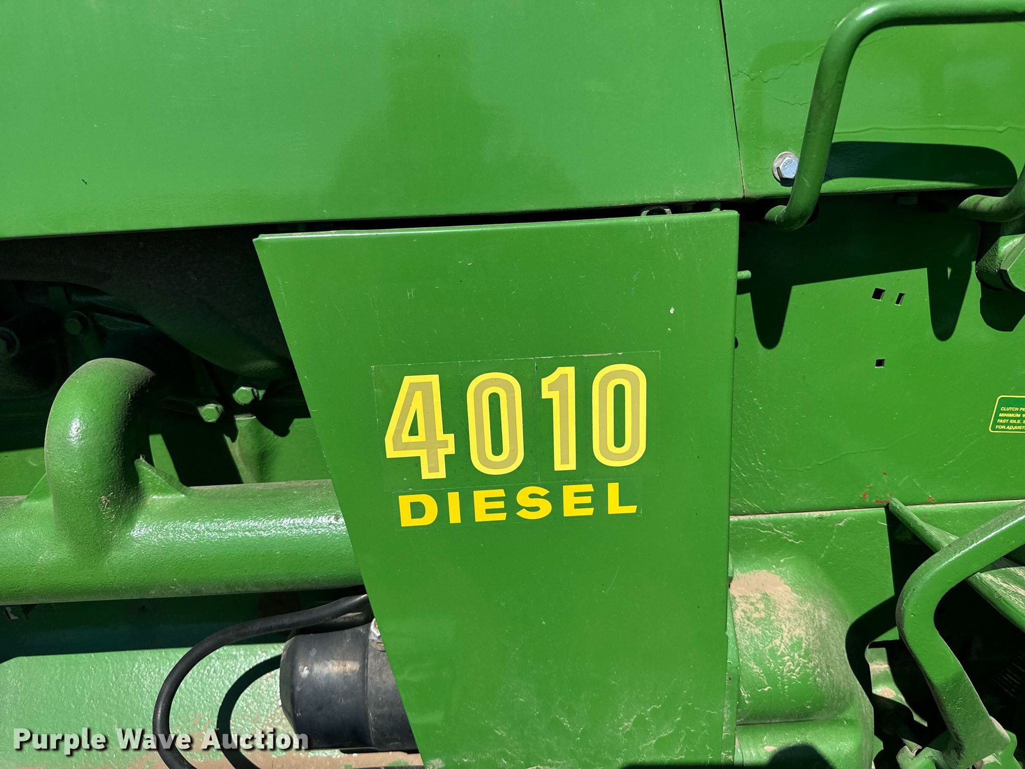 1961 John Deere 4010 tractor. Hours: 1 on meter, Serial: 21T1874. Engine John Deere, Cylinders: 6, Fuel type: Diesel. Transmission Synchro, 8F - 2R. Features PTO: 540, Three point Top link, Hydraulic remote sets Rear: 1. Tires Front: 10.00-16, Rear: 16.8-38, Wheel weights: 6. Oberlin, KS 67749
