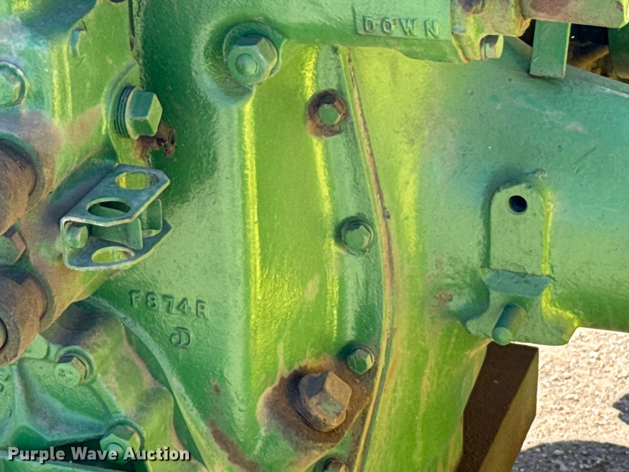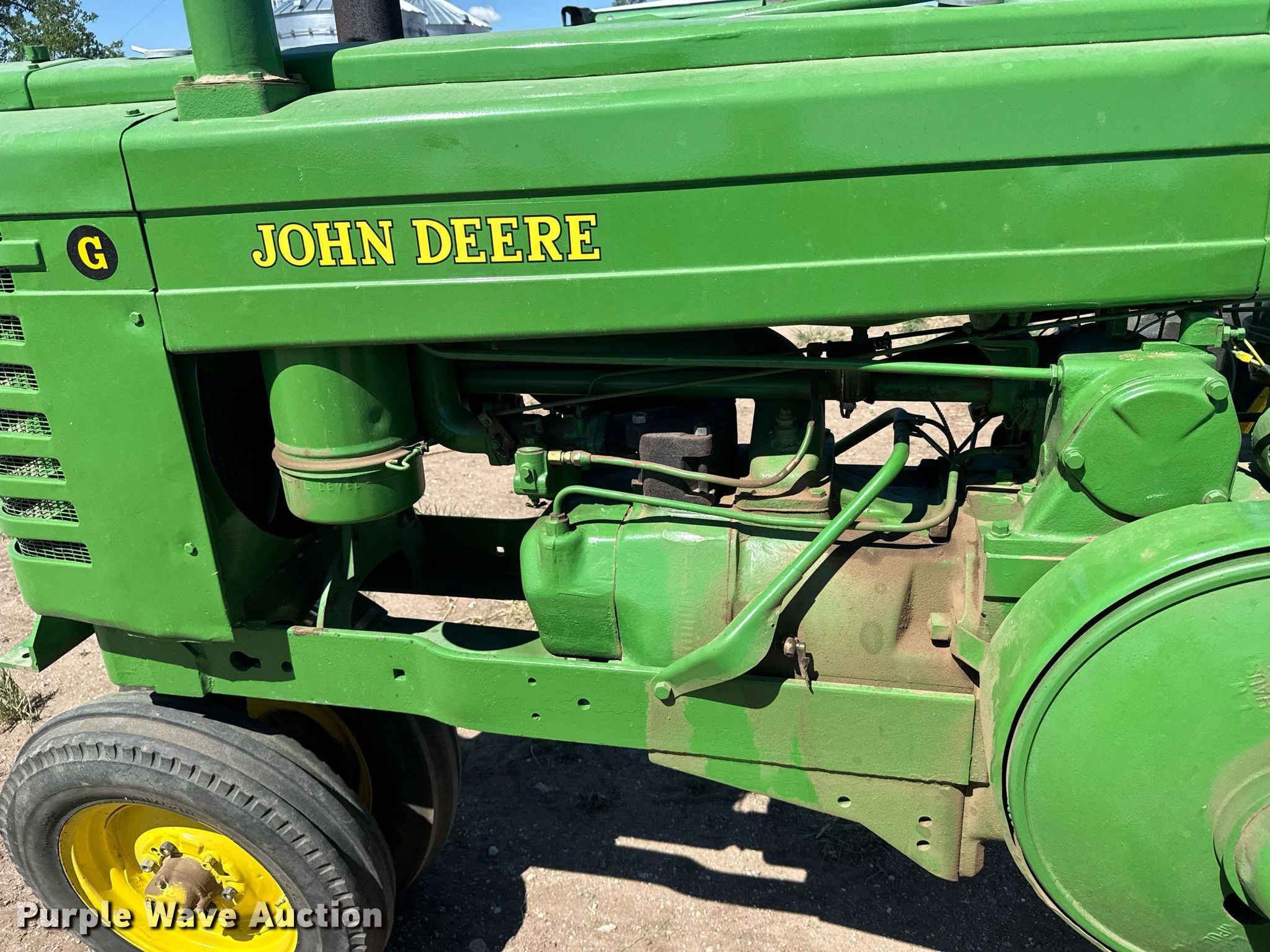 1947 John Deere G tractor. Serial: 26999. Engine John Deere, Displacement: 6.8L, Cylinders: 2, Fuel type: Gas. Transmission Manual, 6F - 1R. Features PTO: 540. Tires Front: 6.00-16, Rear: 13.6-38. Oberlin, KS 67749