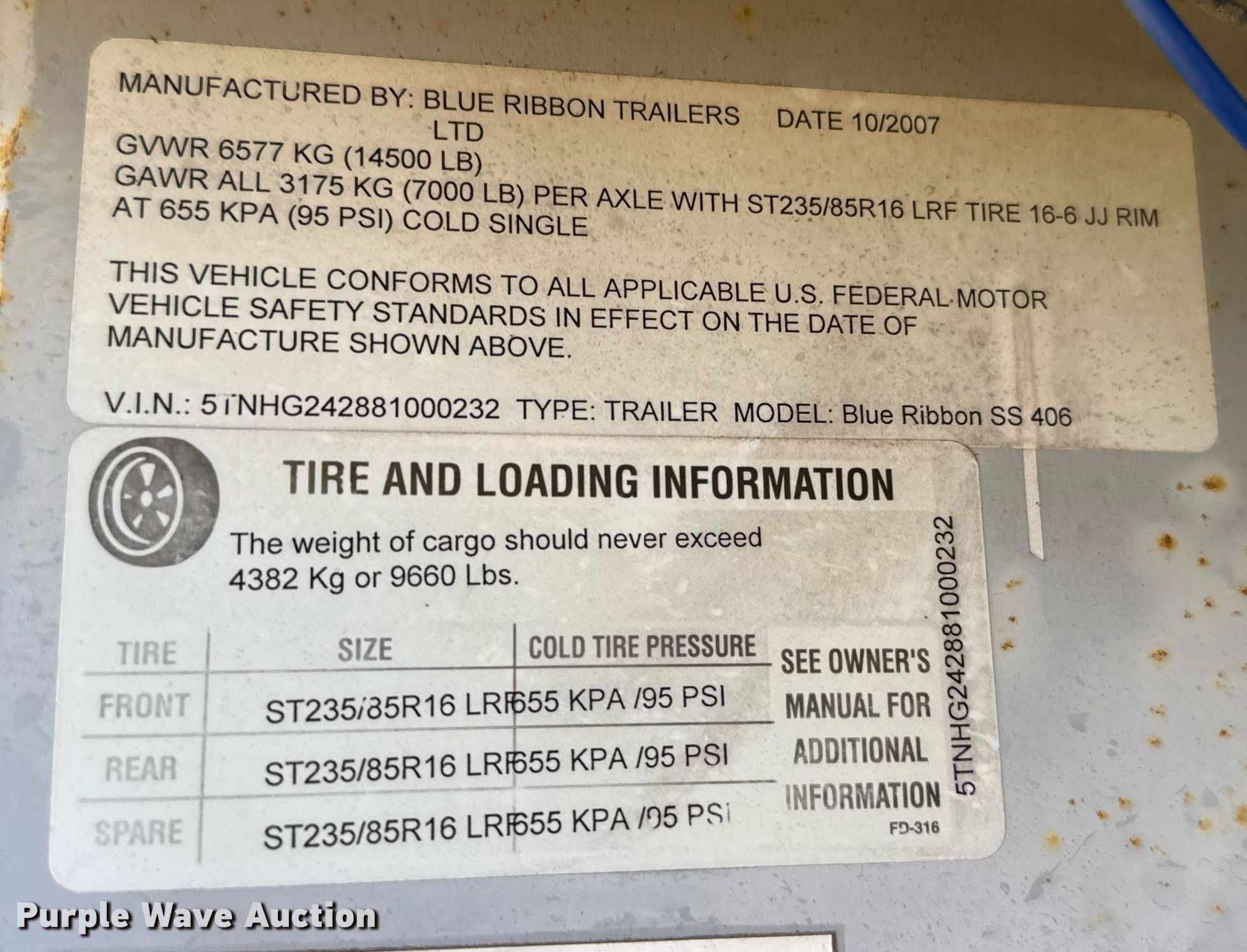 Purple Wave is selling a used Livestock Trailer in Oklahoma. This item is a 2008 Blue Ribbon SS 406 horse trailer with the following: VIN: 5TNHG242881000232, Insurance salvage unit claim #: 5-804778