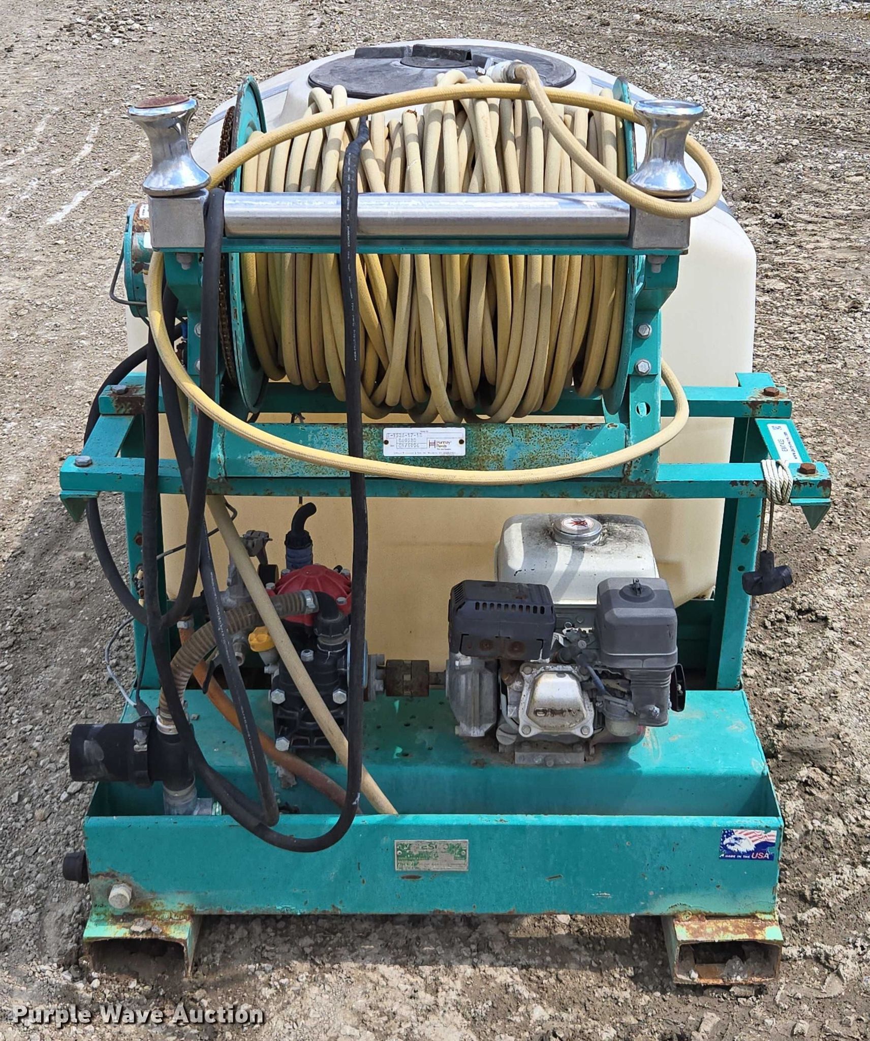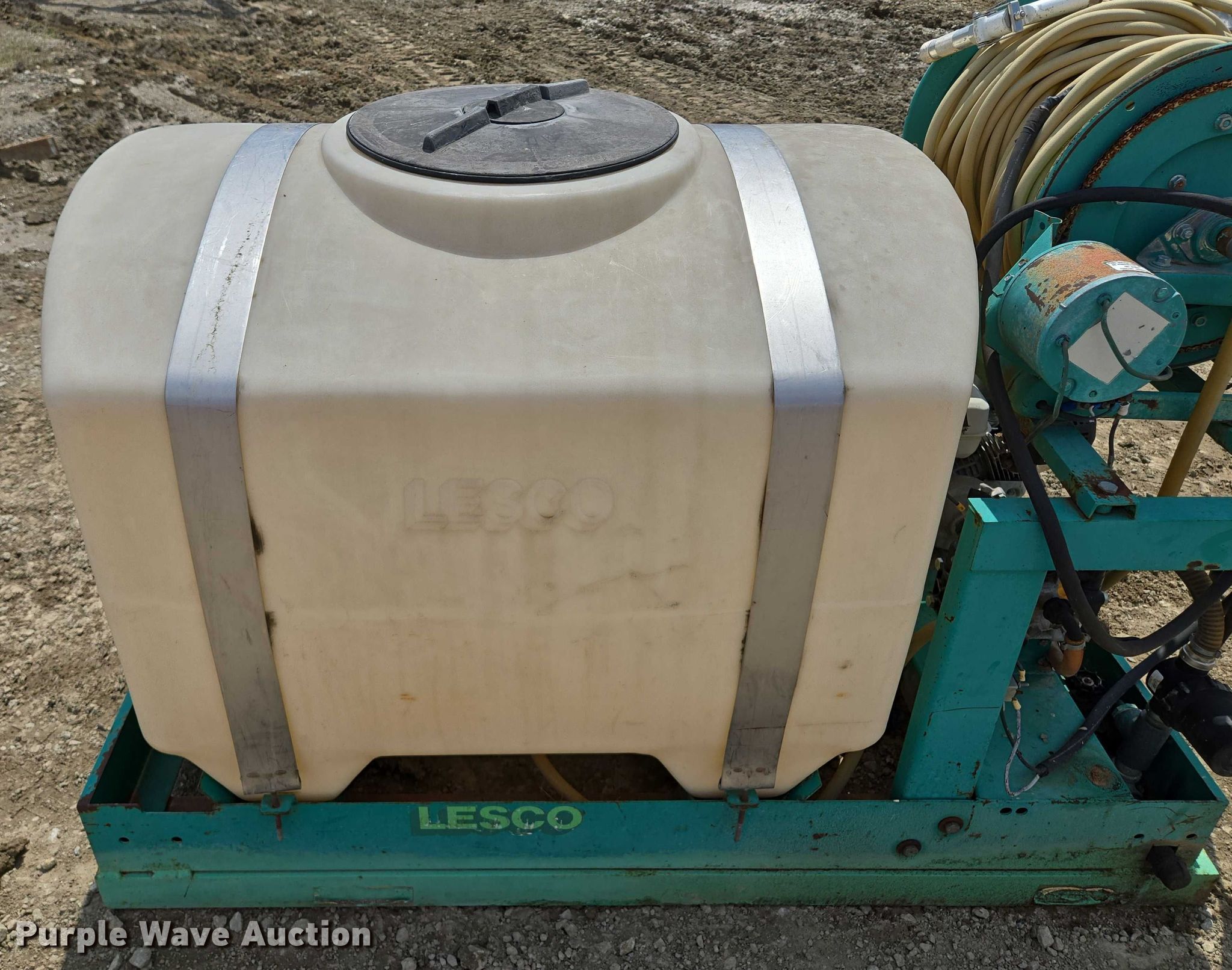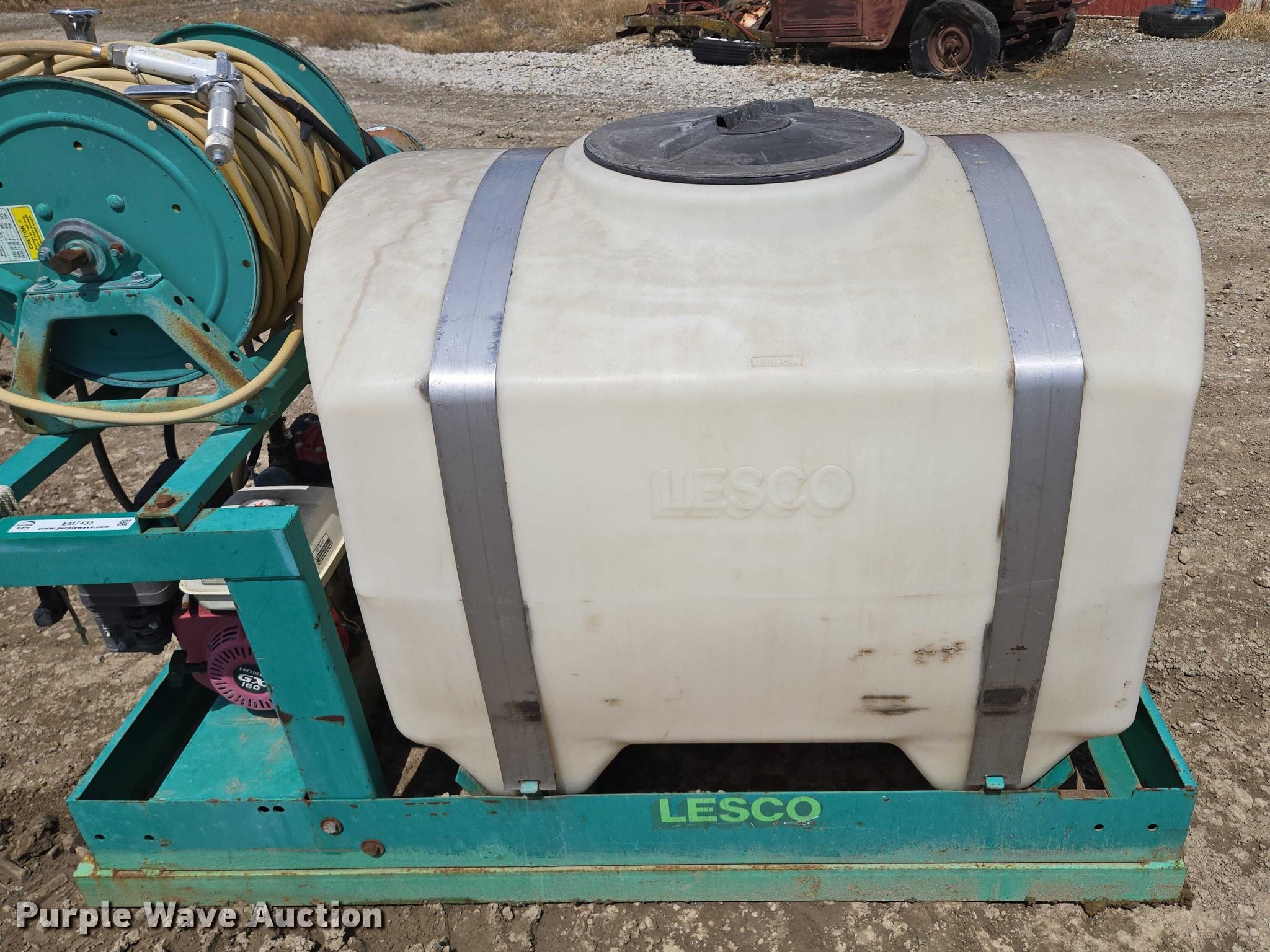 Lesco 016004 sprayer. Serial: SPG2434. Features Tank capacity:180 gallons, Hannay Reels E-1526-17-18 hose reel, Honda GX160 single cylinder engine, Skid mounted 67" L x 38" W. Muse Excavation & Construction. Elwood, KS 66090