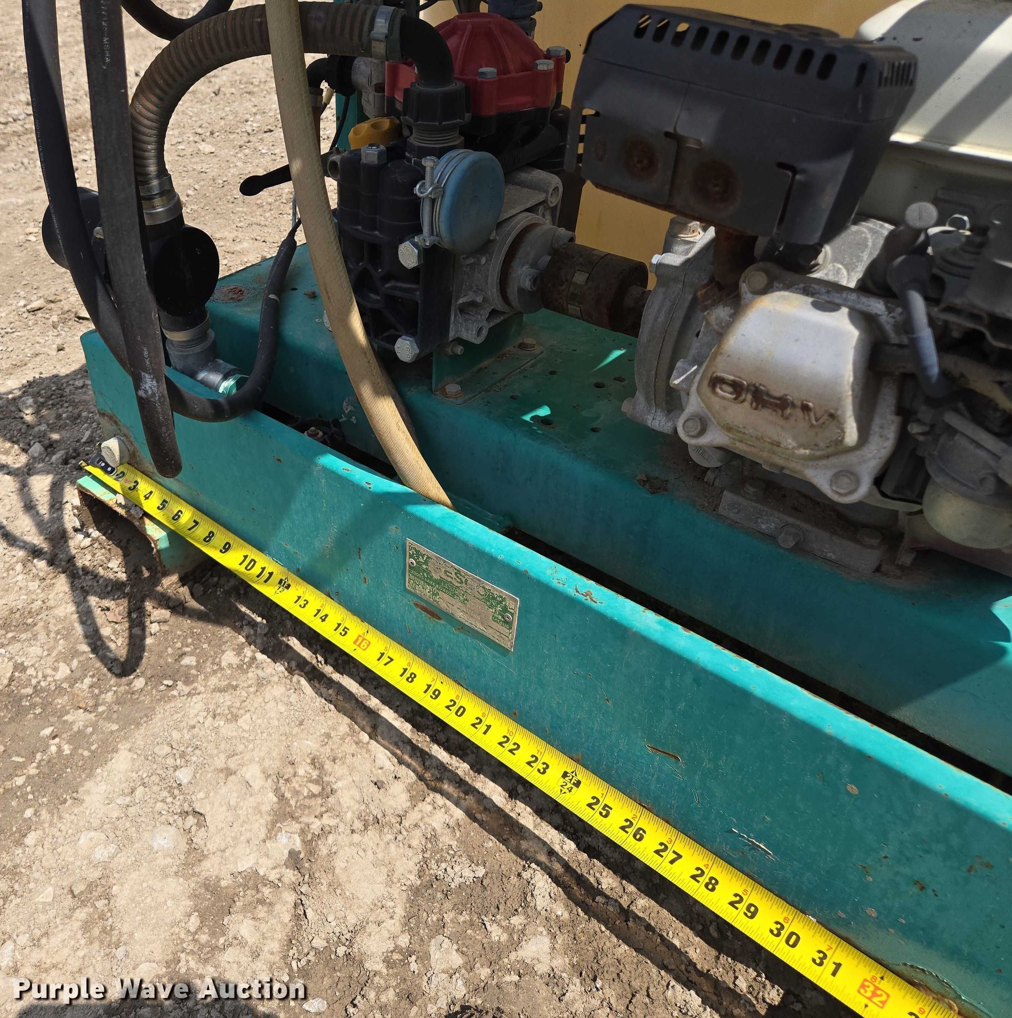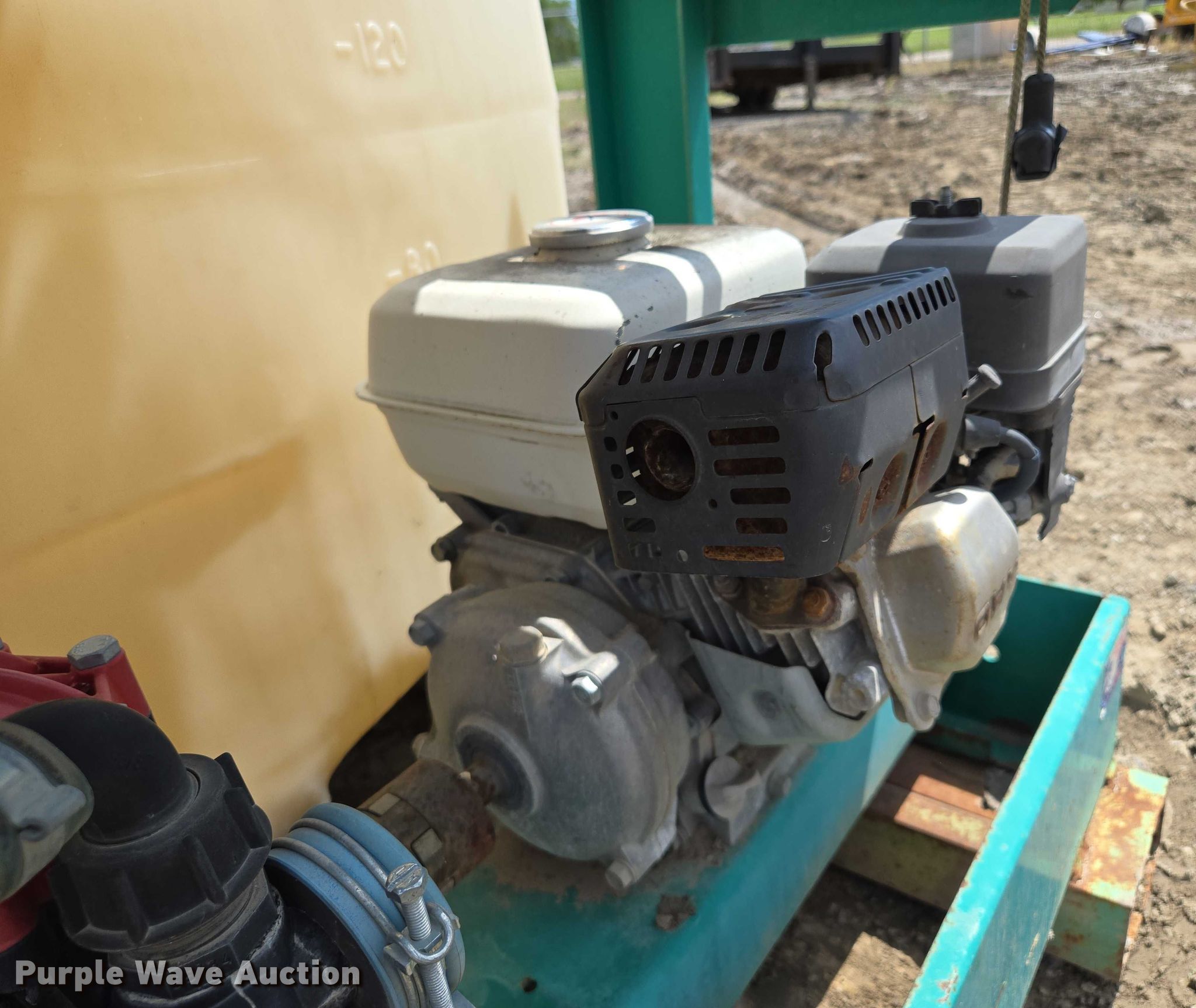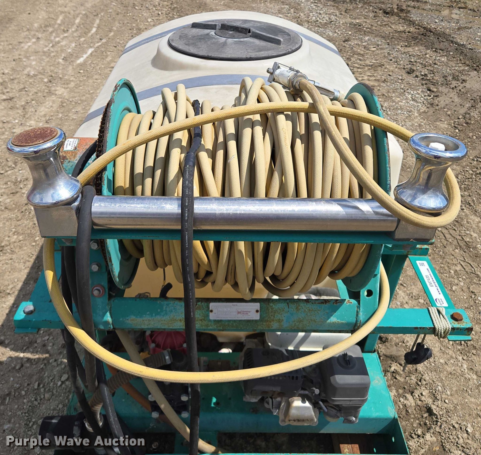 Lesco 016004 sprayer. Serial: SPG2434. Features Tank capacity:180 gallons, Hannay Reels E-1526-17-18 hose reel, Honda GX160 single cylinder engine, Skid mounted 67" L x 38" W. Muse Excavation & Construction. Elwood, KS 66090