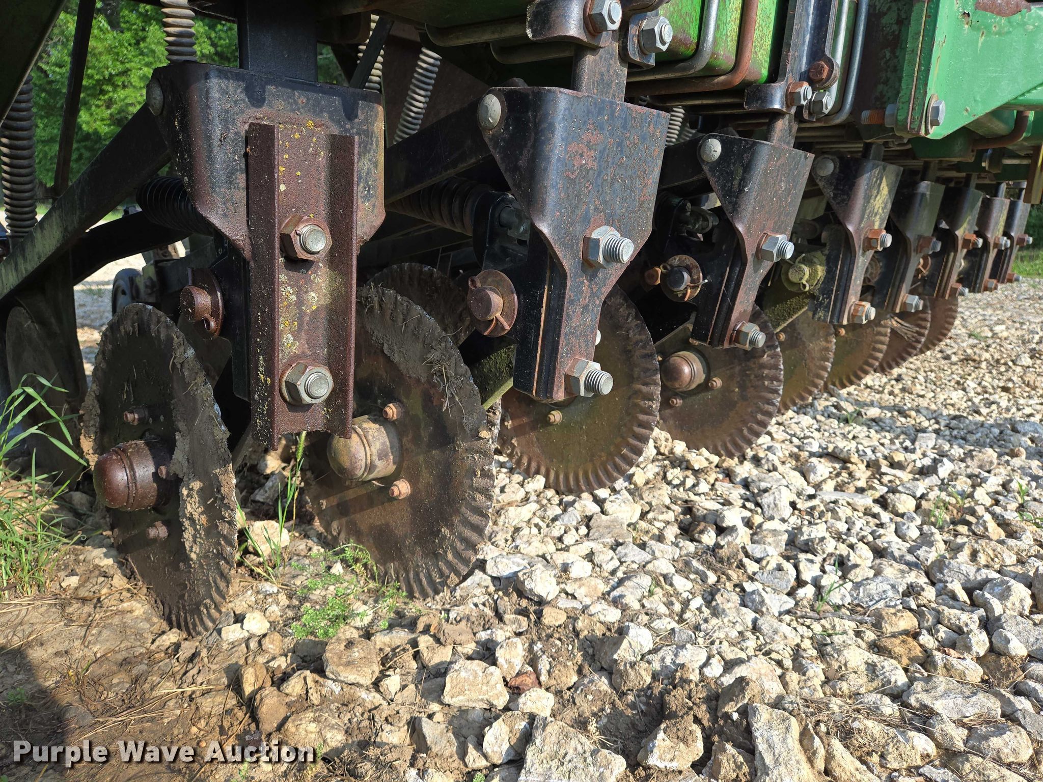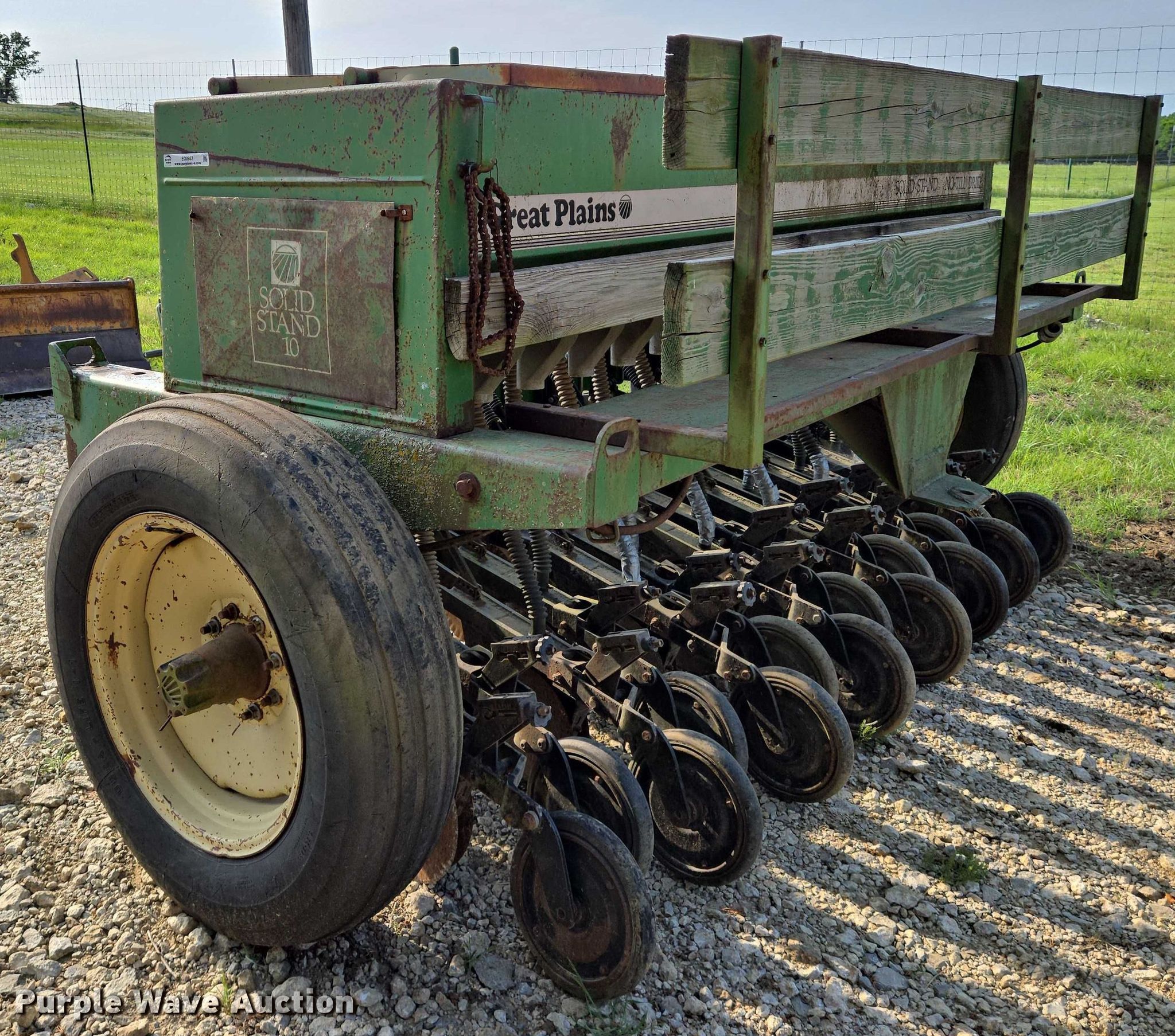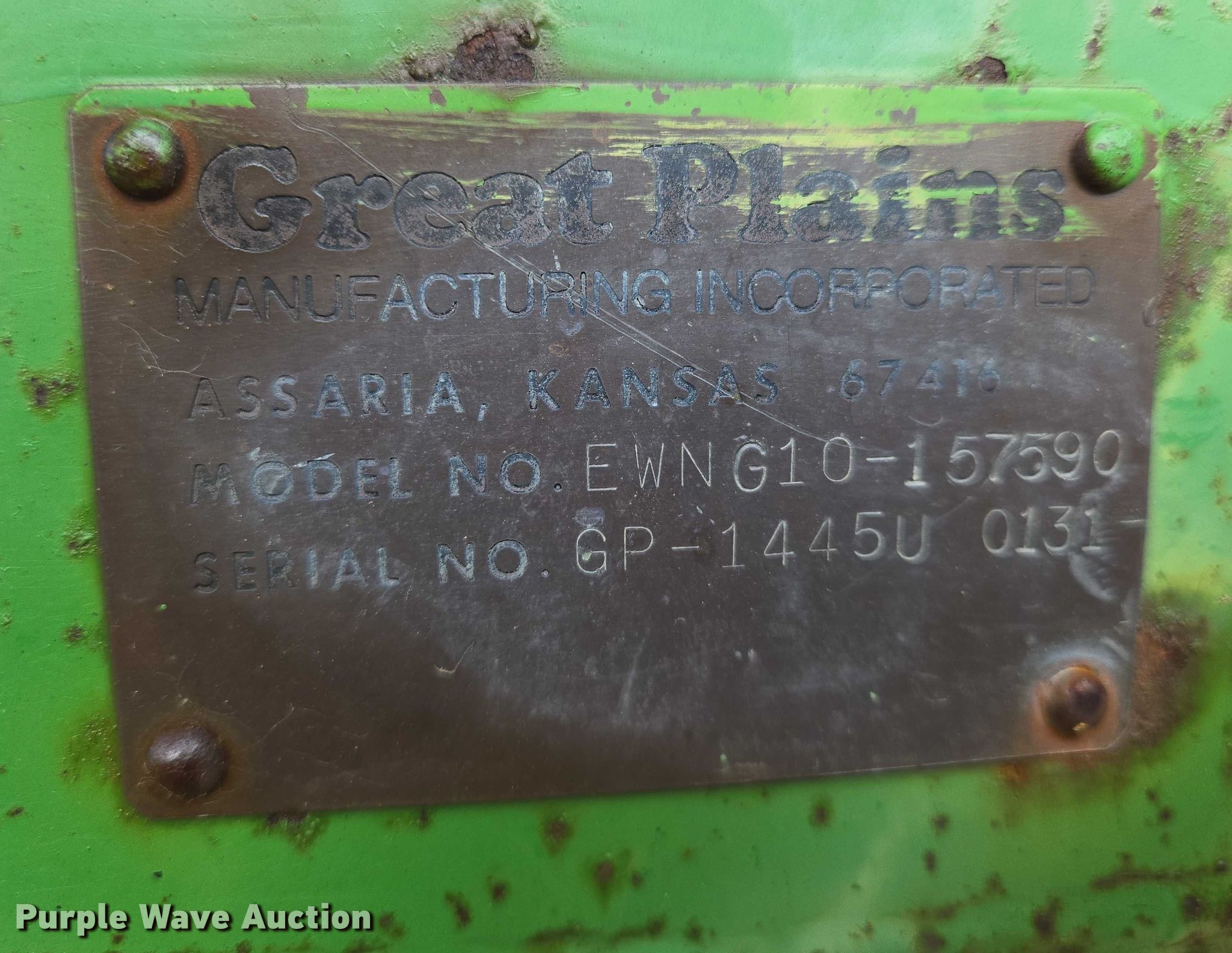Great Plains no-till grain drill. Width: 10', Row units: 15, Row spacing: 7.5", Serial: GP-1445U 0131. Features Seed delivery Bulk fill system, Row units Meter drive: Ground, No-till coulters, Disk openers: Double, Gauge wheels: Single, Closing system: Single Type: Rubber.. Tires Drive/ outside tire size: 9.00-24 Quantity: 2. Sedan, KS 67361