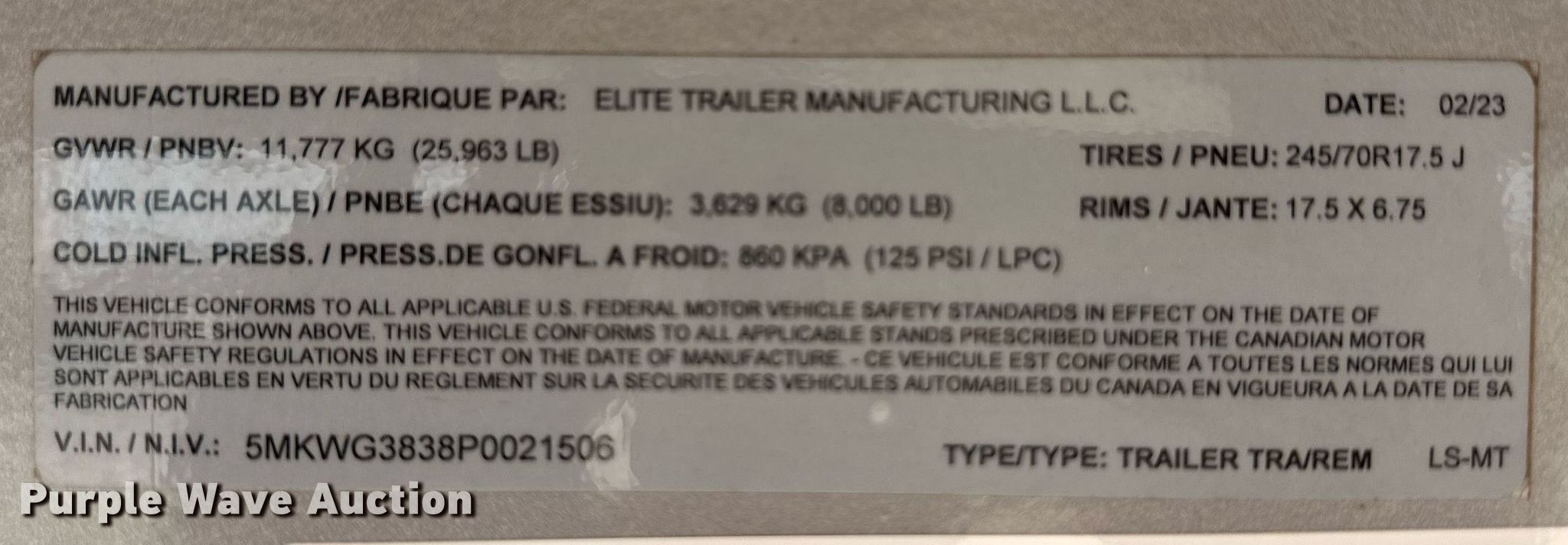 Purple Wave is selling a used Livestock Trailer in Oklahoma. This item is a 2023 Elite Trailer livestock trailer with the following: VIN: 5MKWG3838P0021506