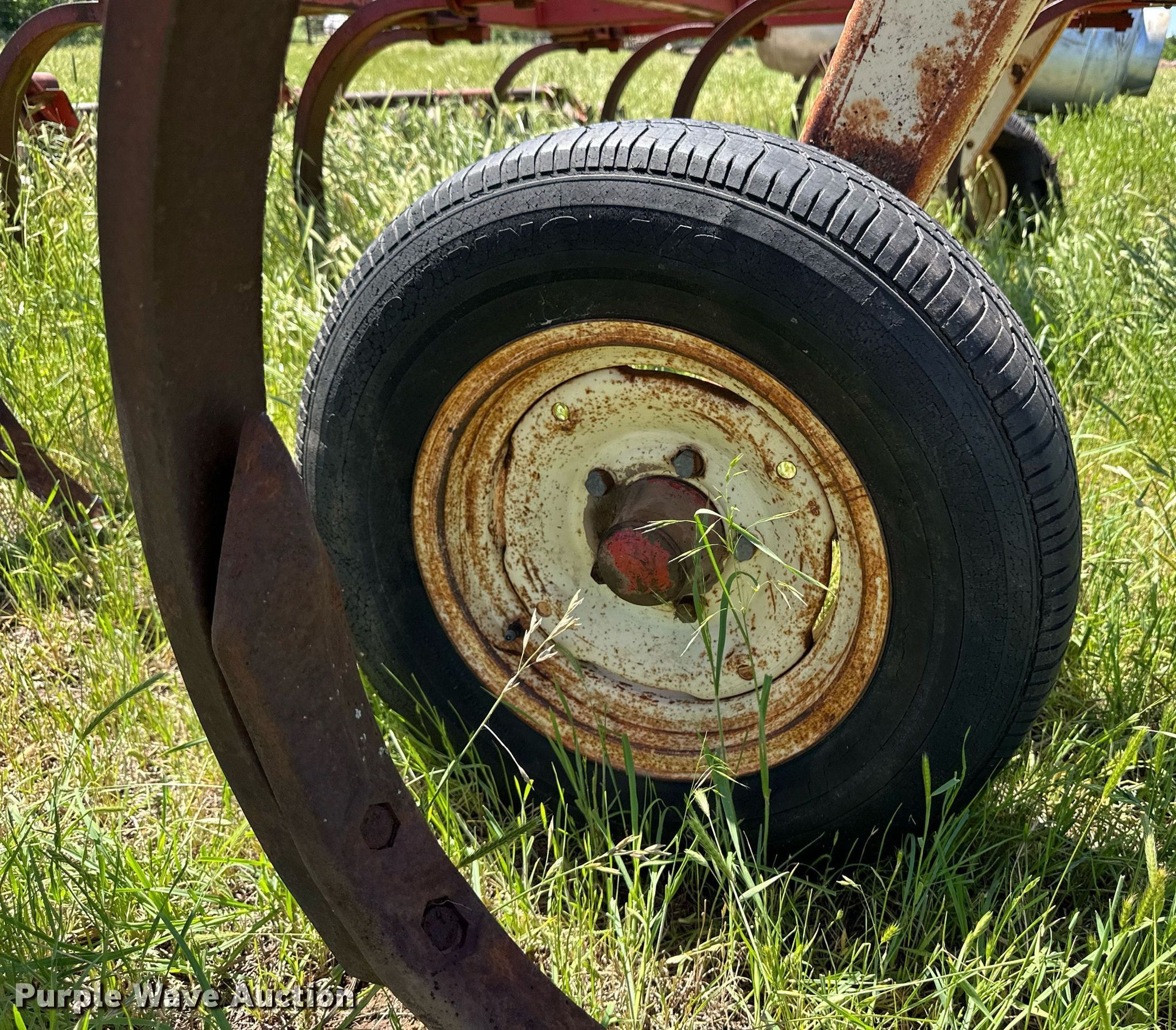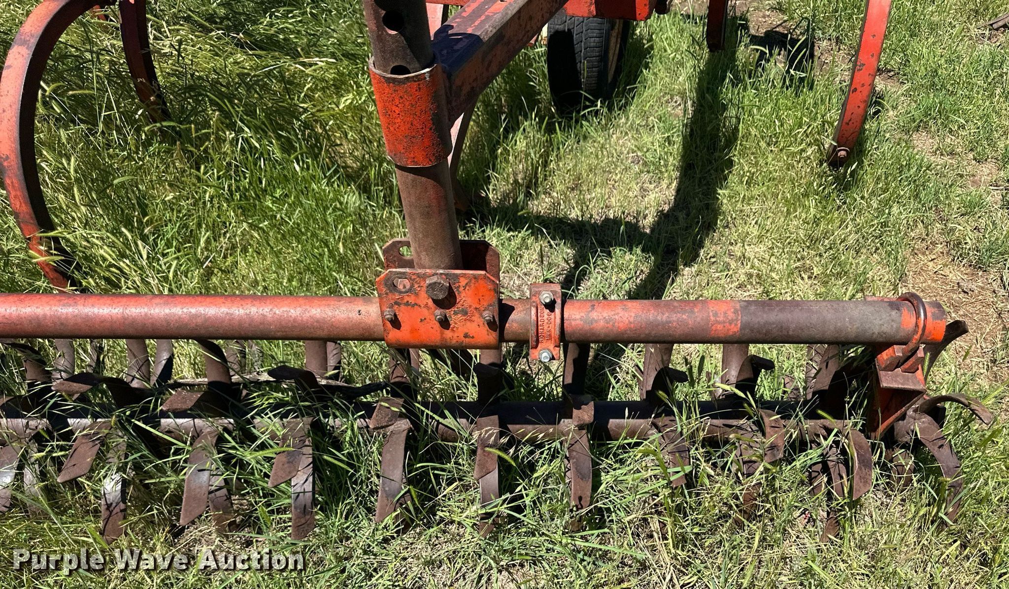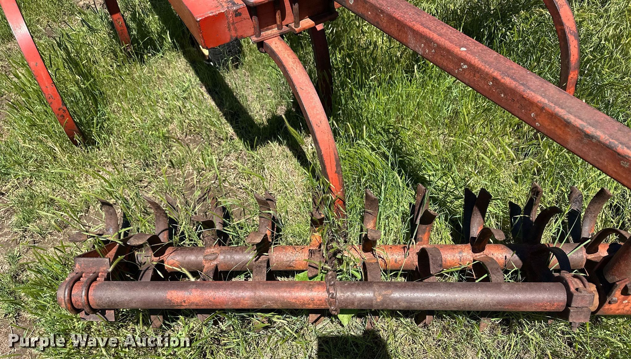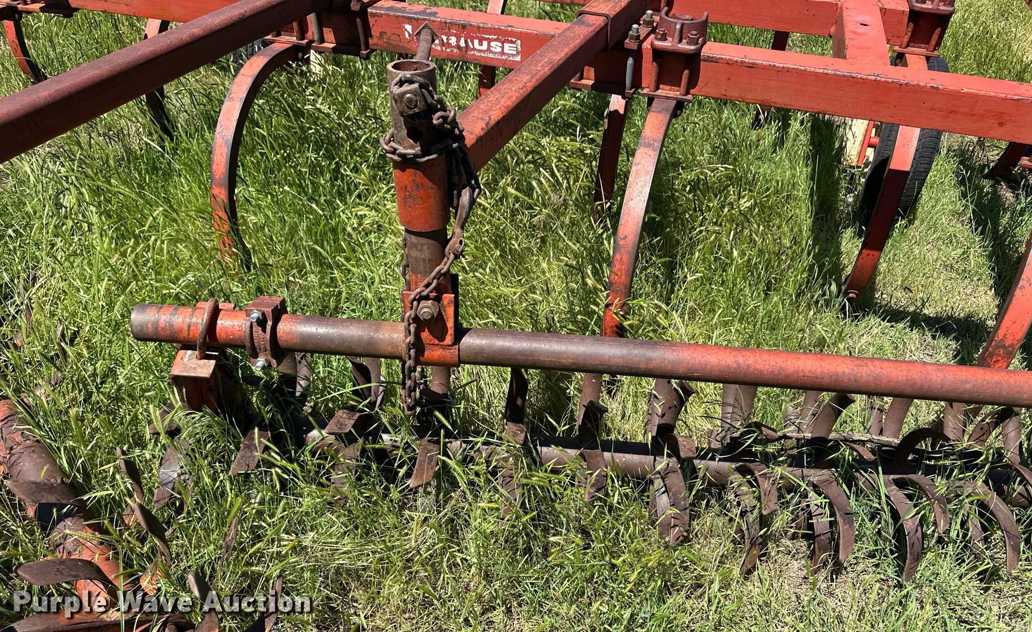 Krause 271 chisel. Overall width: 13' 6", Serial: 4538. Features Shanks: 15, Operation Hydraulic lift, Attachments Rolling pickers/ treader. Tires Tire size: 195/75R14. Notes Hydraulic lift cylinder missing, Flat tire. Vici, OK 73801