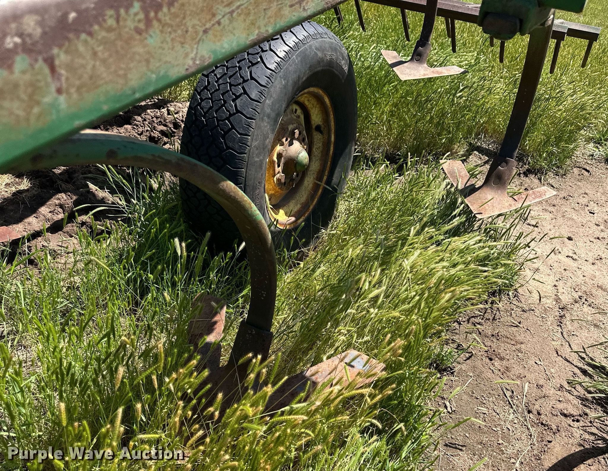 John Deere chisel. Overall width: 13' 6". Features Shanks: 16, Operation Hydraulic lift, Attachments Spike tooth harrow. Tires Tire size: 235/75R15. Notes (2) extensions, Hydraulic lift cylinder missing. Vici, OK 73801