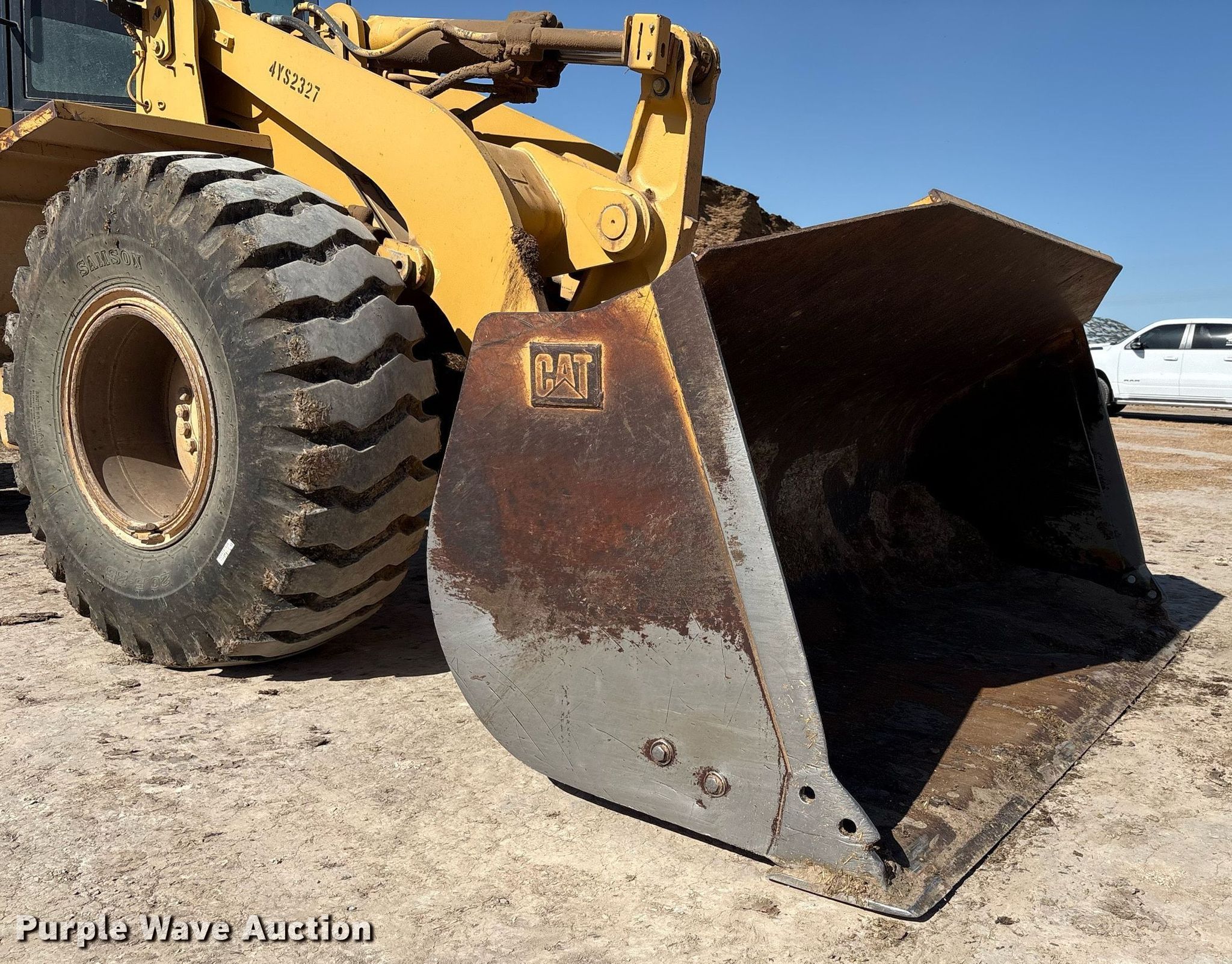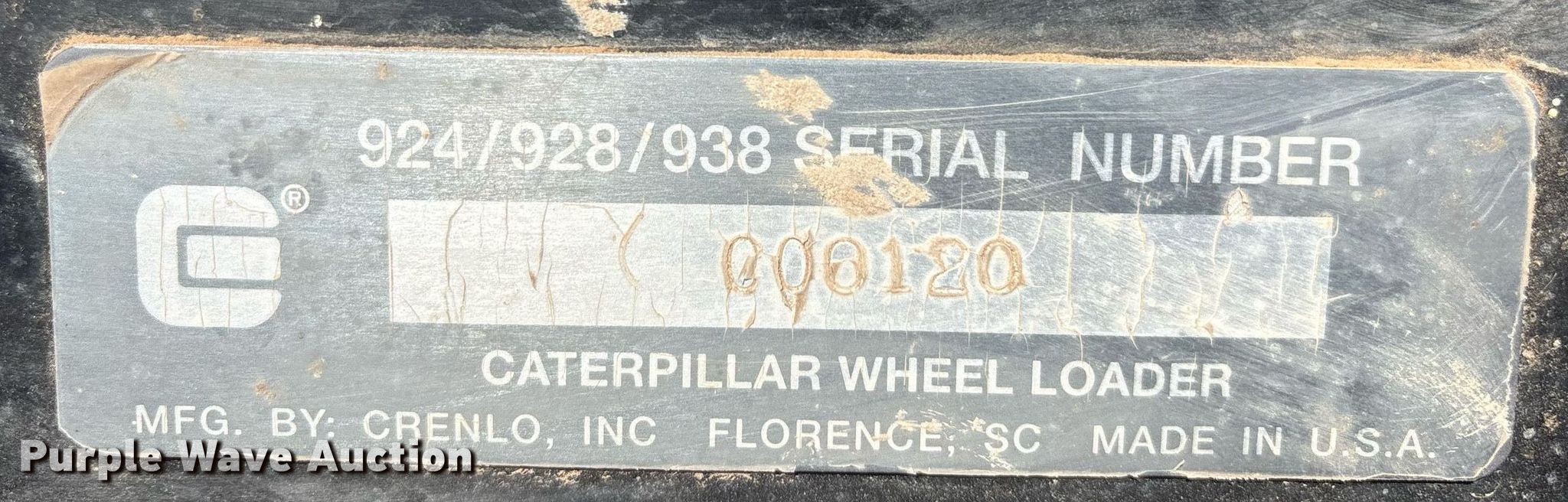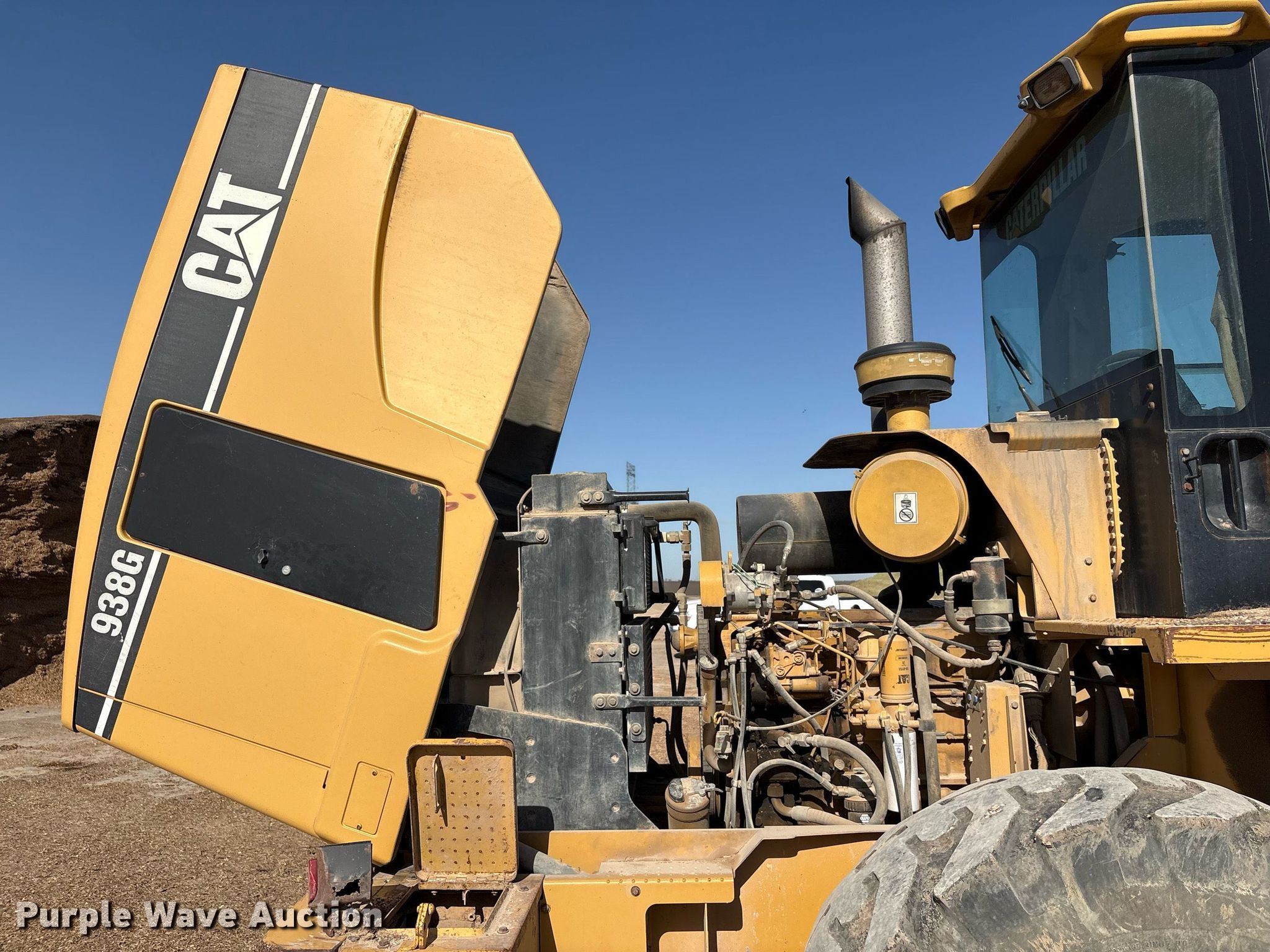 2002 Caterpillar 938G wheel loader. Hours: 17,601 on meter, Serial: CAT0938GL4YS02327. Engine Caterpillar 3126, Serial: 55K09299, Displacement: 7.2L, Cylinders: 6, Fuel type: Diesel. Transmission Powershift, 4F - 4R. Operators station Enclosed cab, AC, Heat, Bucket controls: Two-lever. Features Quick coupler: Manual, Bucket Caterpillar, Capacity: 3 cu.yd., Width: 106", Self- leveling bucket, Cutting edge: Bolt-on. Tires Size: 20.5-25. Notes Glass cracked. Cobalt Cattle Company. Tulia, TX 79088