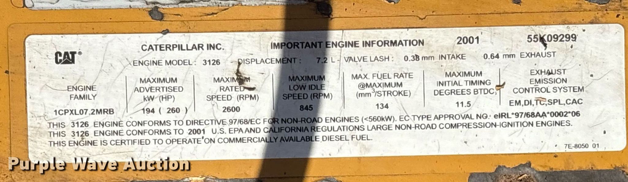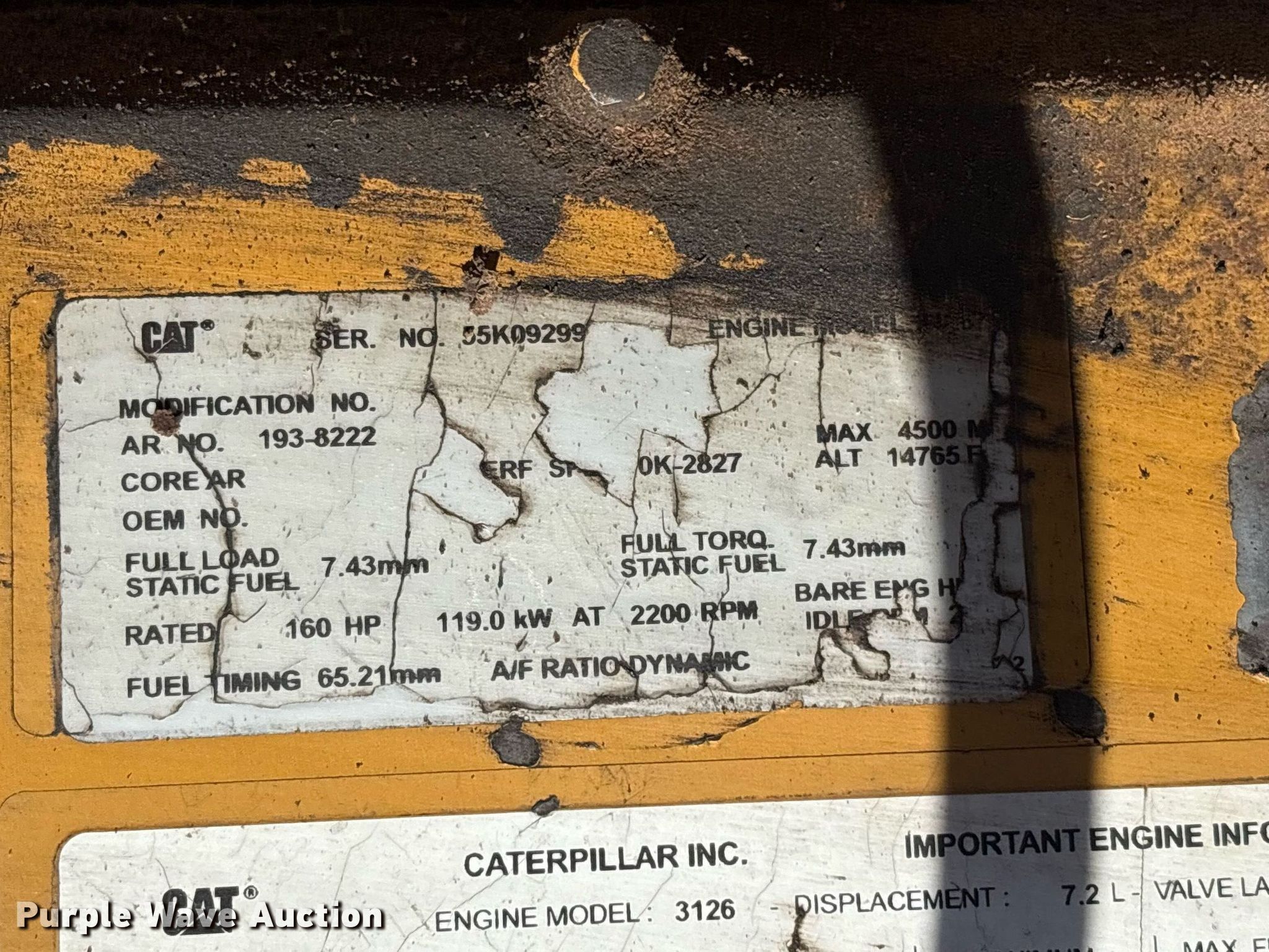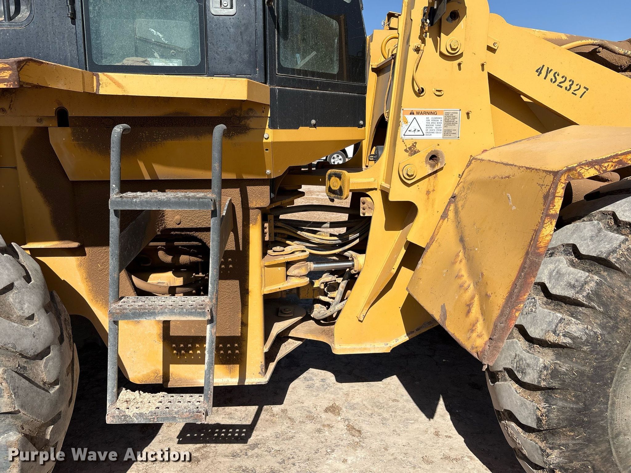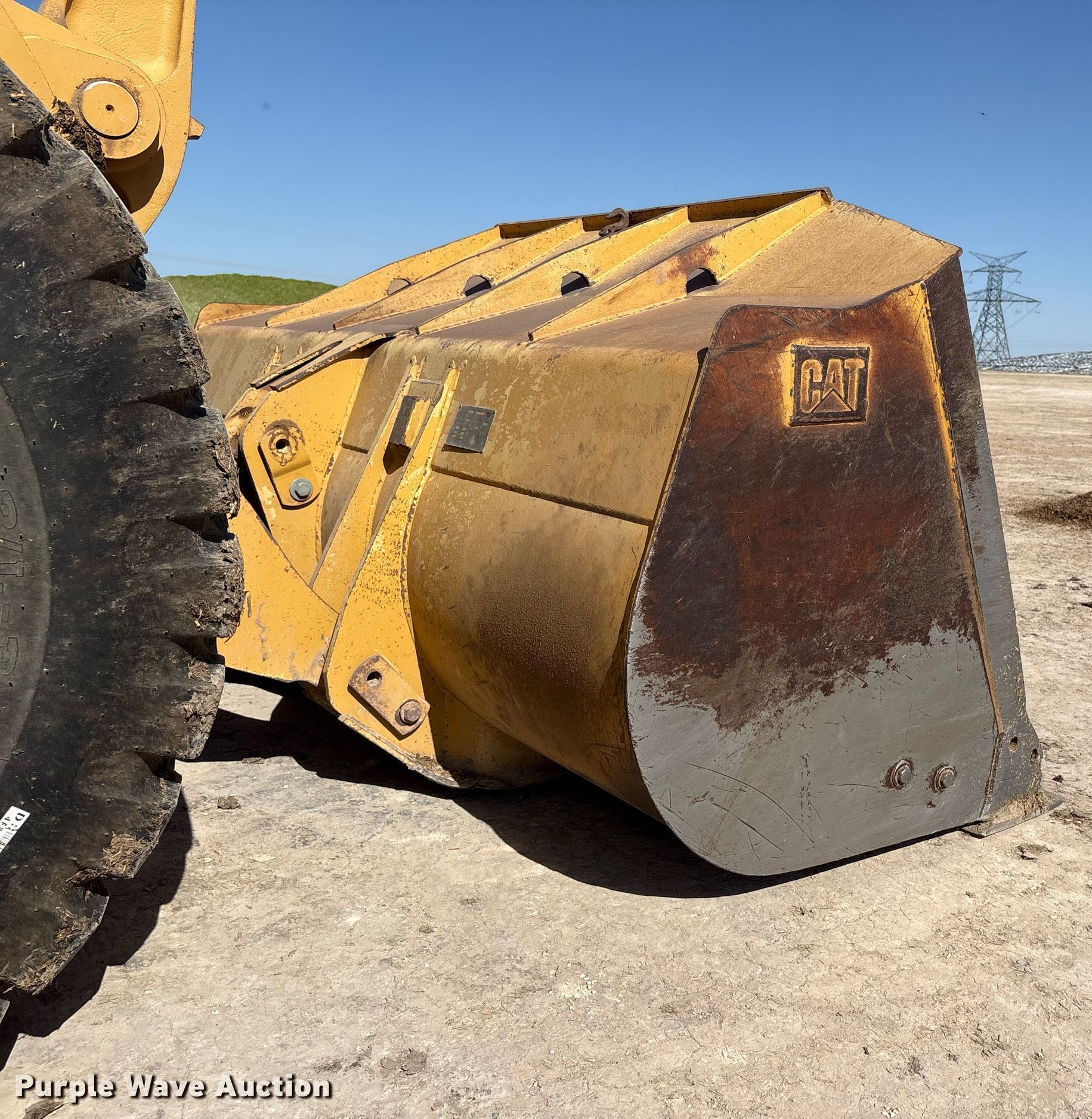 2002 Caterpillar 938G wheel loader. Hours: 17,601 on meter, Serial: CAT0938GL4YS02327. Engine Caterpillar 3126, Serial: 55K09299, Displacement: 7.2L, Cylinders: 6, Fuel type: Diesel. Transmission Powershift, 4F - 4R. Operators station Enclosed cab, AC, Heat, Bucket controls: Two-lever. Features Quick coupler: Manual, Bucket Caterpillar, Capacity: 3 cu.yd., Width: 106", Self- leveling bucket, Cutting edge: Bolt-on. Tires Size: 20.5-25. Notes Glass cracked. Cobalt Cattle Company. Tulia, TX 79088