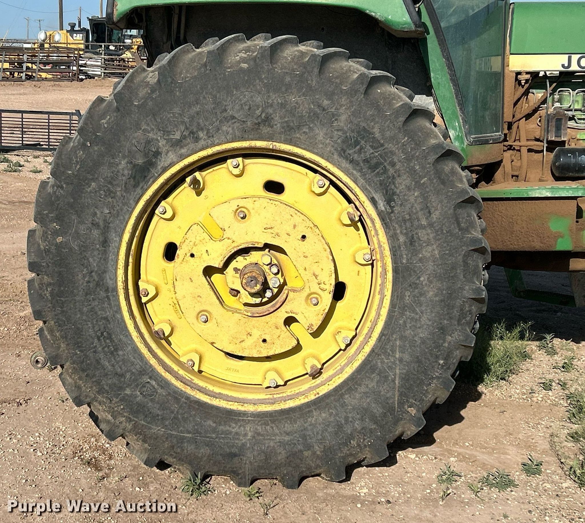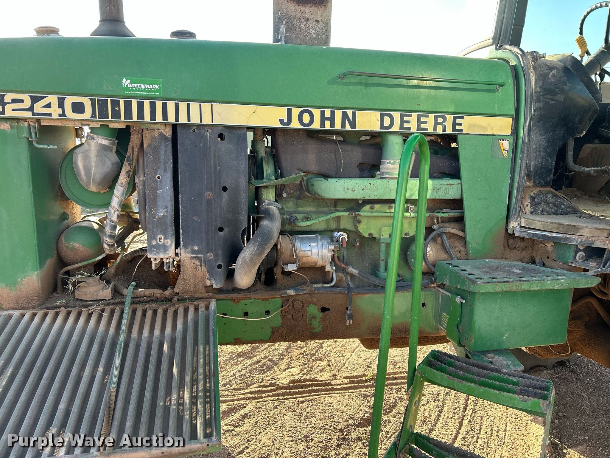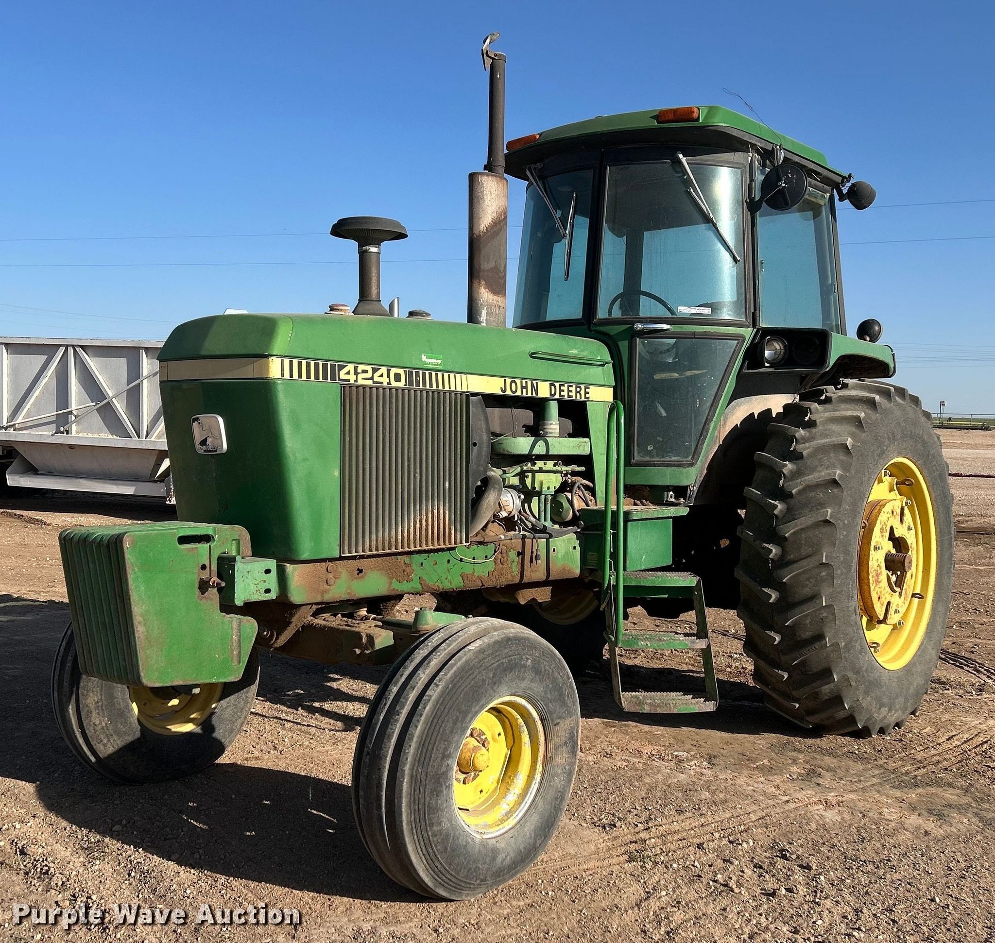 1978 John Deere 4240 tractor. Hours: 97 on meter Actual hours unknown, Serial: SG22-005670RW. Engine John Deere, Serial: 6466DR-02 183040RG, Cylinders: 6, Fuel type: Diesel. Transmission Powershift, Differential lock. Operators station AC, Heat. Features PTO: 1 3/4" 1000, Three point, Seven pin outlet, Hydraulic remote sets Rear: 2, Suitcase weights: 9. Tires Front: 10.00-16, Rear: 18.4-38, Wheel weights: 4. Notes additional wheel weights included, Transmission issues, stuck in forward high gear. Cobalt Cattle Company. Tulia, TX 79088