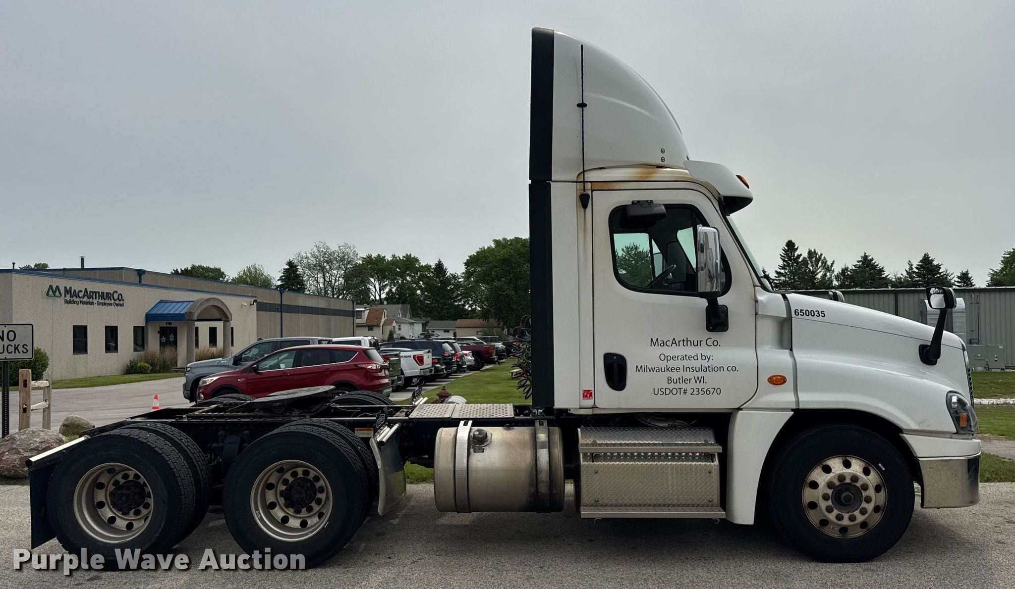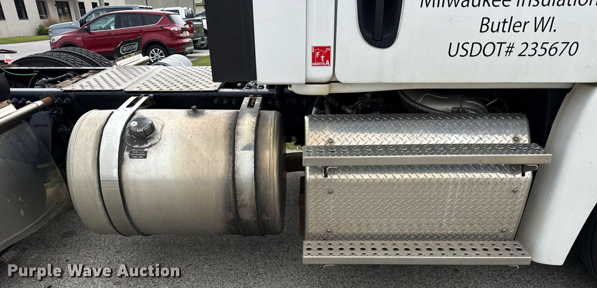 2018 Freightliner Cascadia semi truck. Miles: 259,670 on odometer, Hours: 8,404 on meter, VIN: 3AKJGEDV7JDJS1855, Unit #: 650035. Engine Detroit Diesel DD13, Displacement: 12.8L, Cylinders: 6, Fuel type: Diesel, Engine brake. Transmission Automated manual. Chassis Axles: Tandem, Differential lock: Inter-axle, Suspension: Air Dump valves, Brakes: Air, GVWR: 52,000 lbs FAWR: 12,000 lbs, IAWR: 20,000 lbs, RAWR: 20,000 lbs. Interior AC, Heat, Heated mirrors, Power windows, Power locks, Cruise control, Air ride cab. Features Deck plate: Aluminum, Fifth wheel type: Air operated, Sliding, Fuel tank: Dual. Tires Front: 275/80R22.5, Rear: 295/75R22.5. Notes Possible fuel injector issues , Dash warning indicator: Check engine. Minnesota title. Title distribution may be delayed up to 14 days from verification of funds. MacArthur Co. Butler, WI 53007