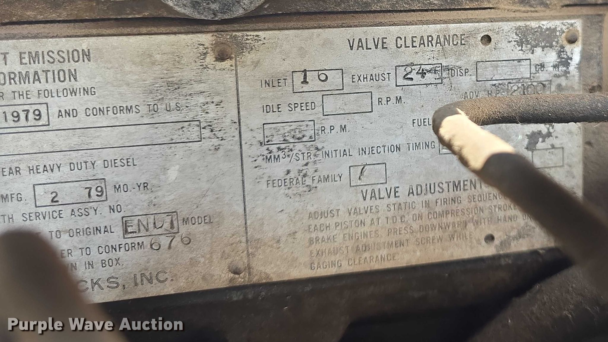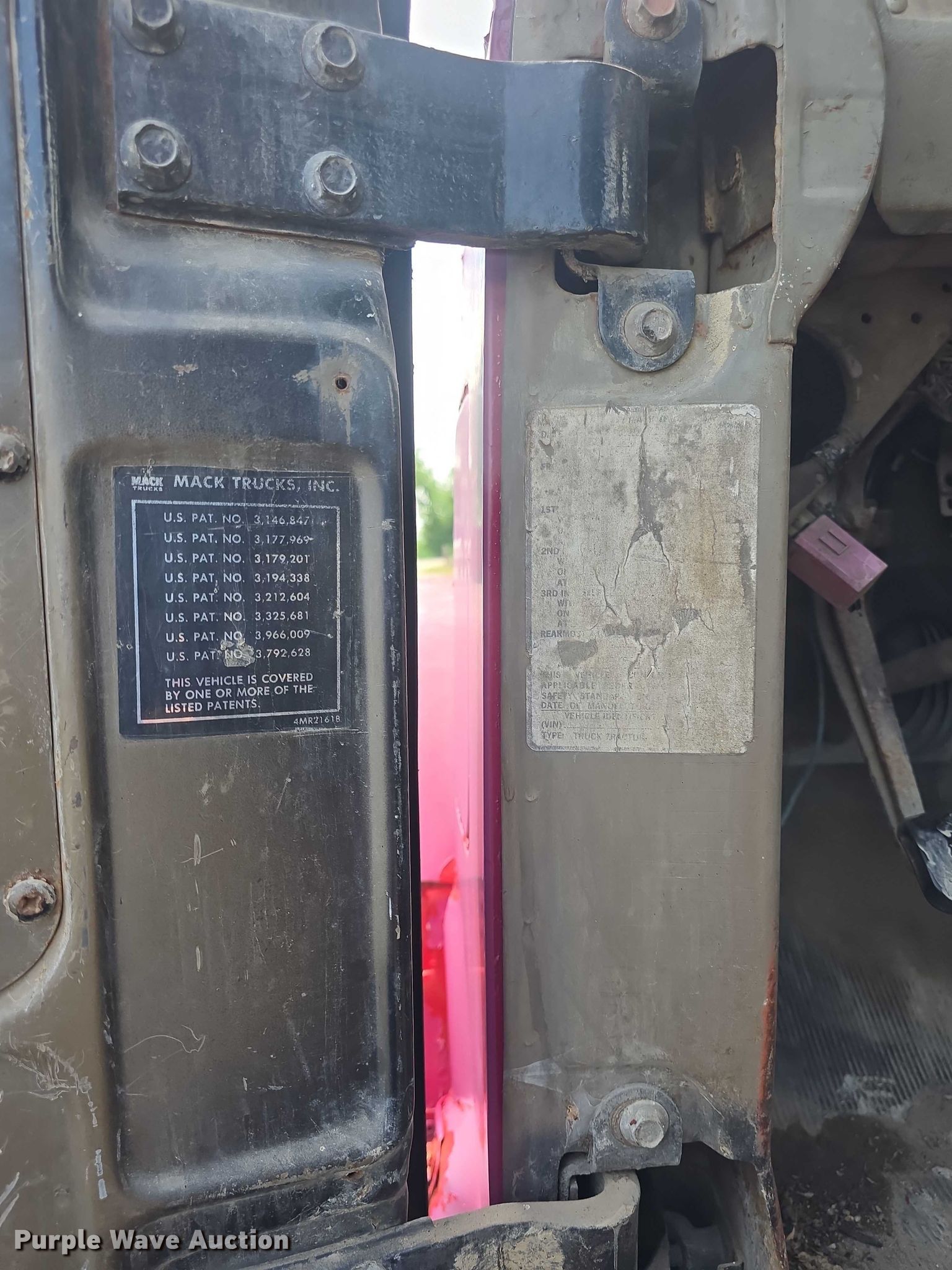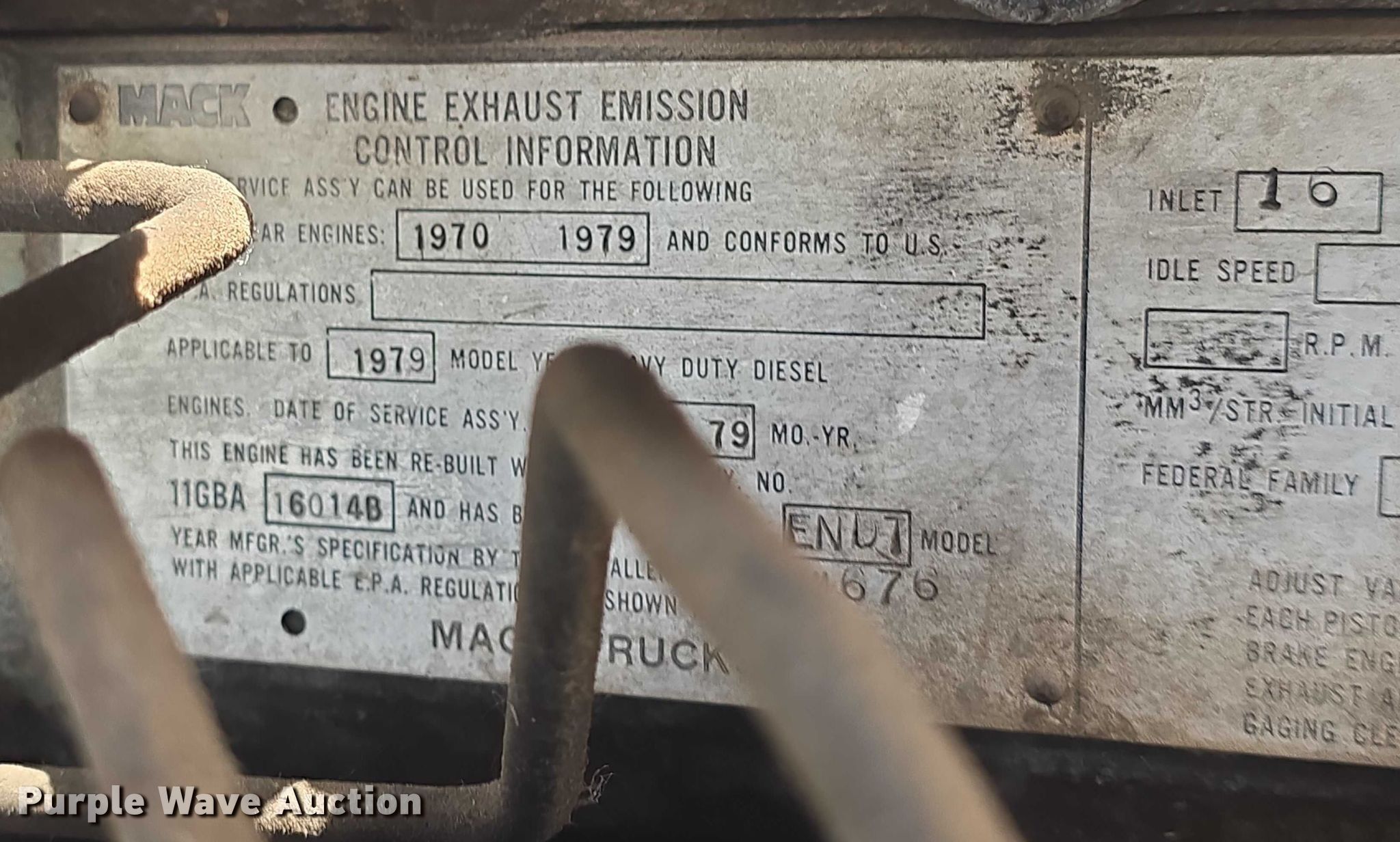 1978 Mack R686 semi truck. Miles: 814,178 on odometer, Hours: 2,571 on meter, VIN: R686ST20138. Engine Mack, Cylinders: 6, Fuel type: Diesel. Transmission Mack, Manual. Chassis Axles: Tandem, Suspension: Camelback, Brakes: Air, PTO, Wet kit. Interior Heat. Features Fifth wheel type: Fixed, Fuel tank: Dual. Tires Size: 11R22.5. Notes Oil leak , AC pump missing, Non-operational passenger door exterior handle, Unknown operating condition of hour meter, Unknown operating condition Unit is not road worthy, Unit must be towed or hauled. Kansas antique title. Title distribution may be delayed up to 30 days from verification of funds. Onaga, KS 66521