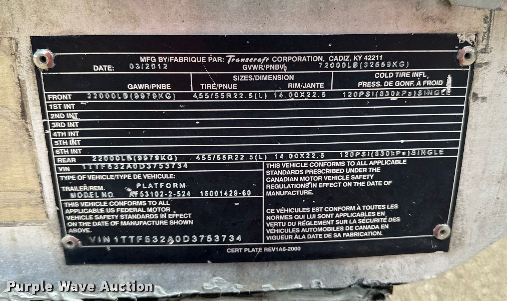 Purple Wave is selling a used Flat or Drop Deck Trailer in Kansas. This item is a 2013 Transcraft AF53102-2-524 flatbed trailer with the following: VIN: 1TTF532A0D3753734