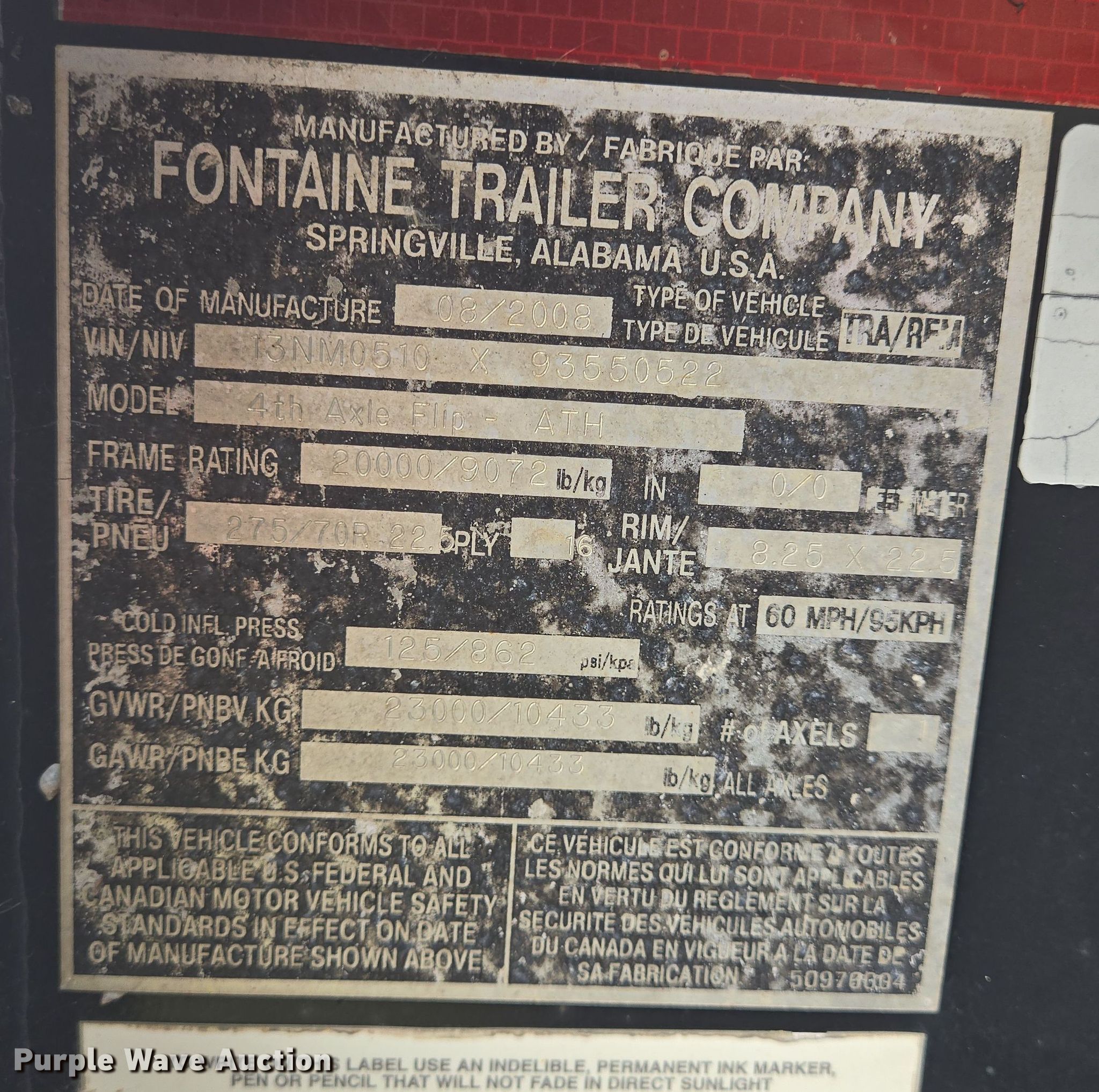 2009 Fontaine 4th Axle Flip ATH flip axle. VIN: 13NM0510X93550522. Dimensions Overall: 5' L x 8' 6" W. Chassis Suspension: Air, Brakes: Air, GVWR: 23,000 lbs, GAWR: 23,000 lbs. Tires Aluminum wheels, Size: 275/70R22.5. Oklahoma title. Title distribution may be delayed up to 30 days from verification of funds. Allegiance Crane & Equipment. Lafayette, LA 70506