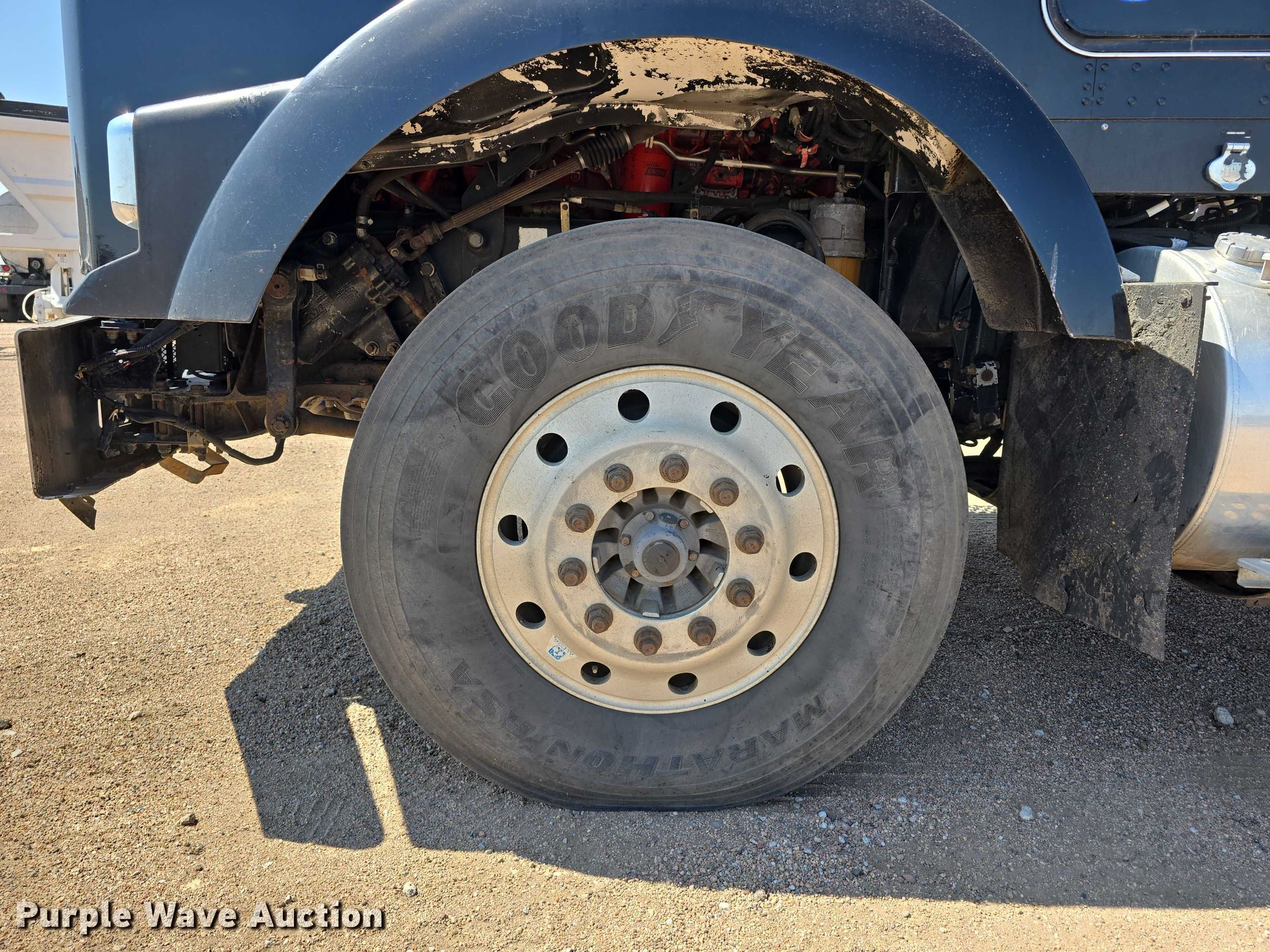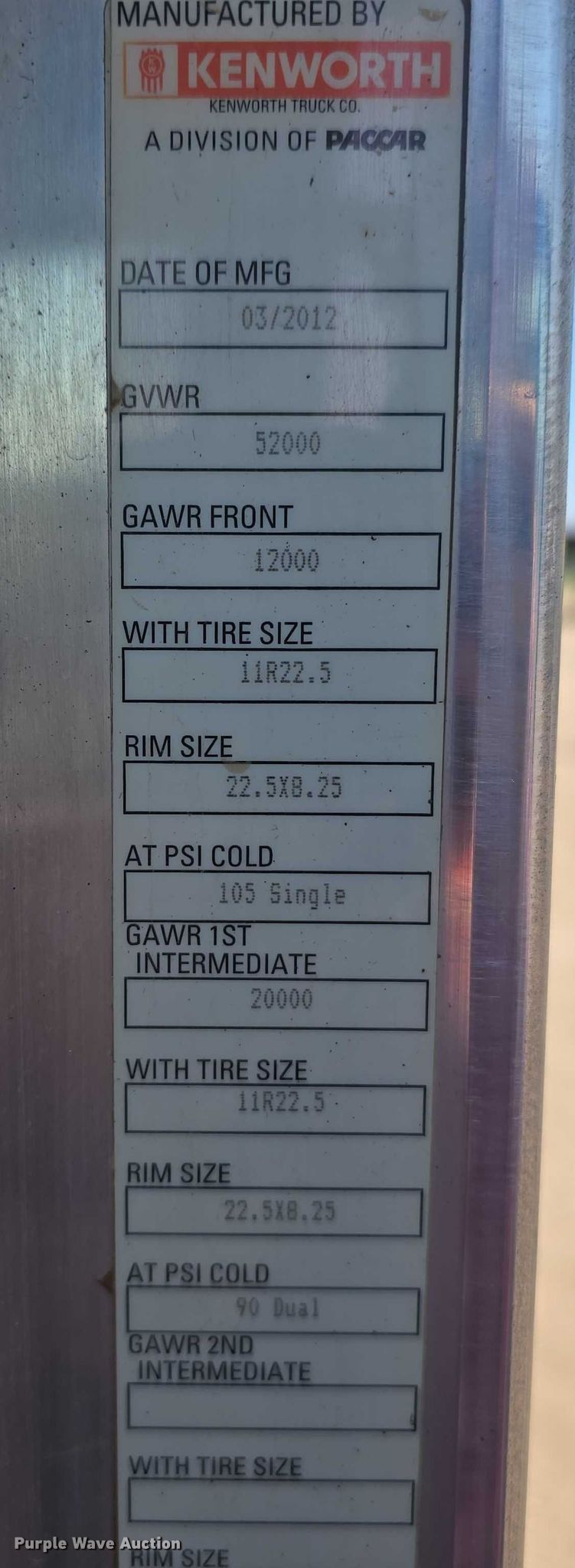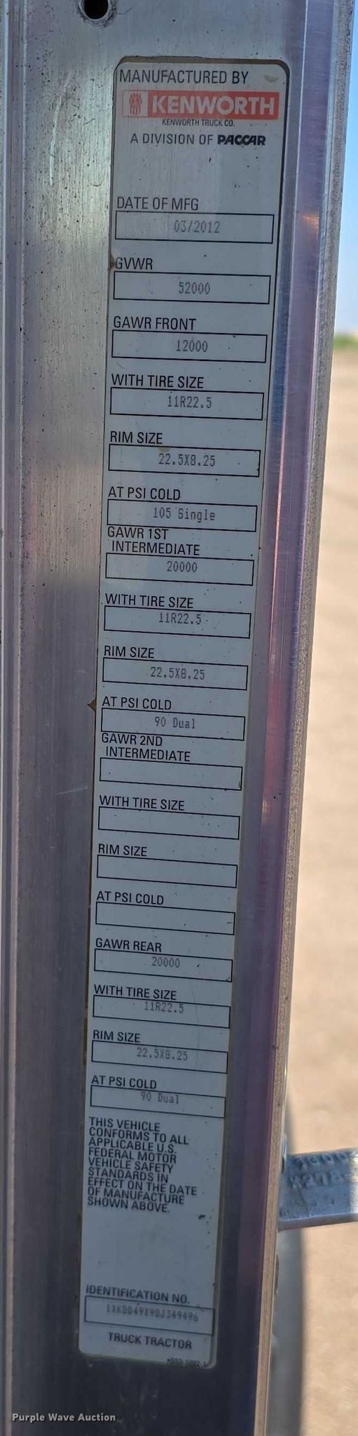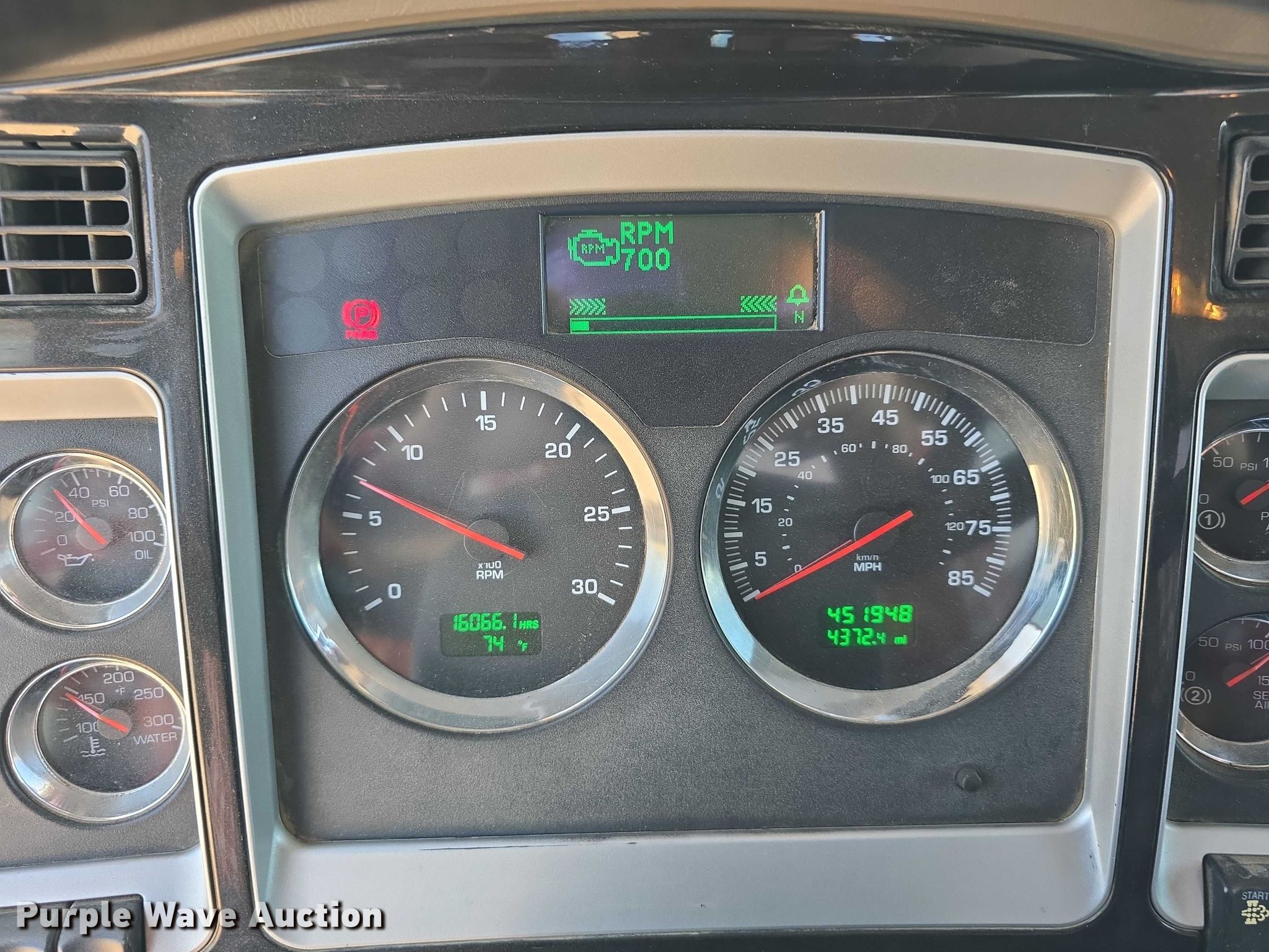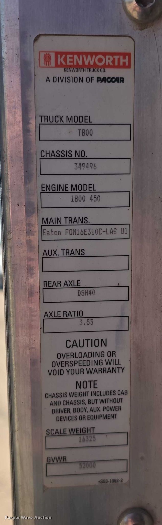 2013 Kenworth T800 semi truck. Miles: 451,948 on odometer, Hours: 16,066 on meter, VIN: 1XKDD49X9DJ349496. Engine Cummins ISX15 450ST, Serial: 79567130, Displacement: 15.0L, Cylinders: 6, Fuel type: Diesel, HP: 450, Engine brake. Transmission Eaton Fuller, Automated manual. Chassis Axles: Tandem, Gear ratio: 3.55, Suspension: Air Dump valves, Brakes: Air, GVWR: 52,000 lbs FAWR: 12,000 lbs, IAWR: 20,000 lbs, RAWR: 20,000 lbs, Wheelbase: 184". Interior AC, Heat, Heated mirrors, Power passenger window, Power locks, Cruise control, Air ride cab. Features Deck plate: Aluminum, Fifth wheel type: Air operated, Sliding, Fuel tank: Dual. Tires Size: 11R22.5. Notes EGR deleted, DEF deleted, Windshield chipped or cracked. Nebraska title. Title distribution may be delayed up to 14 days from verification of funds. Vontz Paving. Hastings, NE 68901