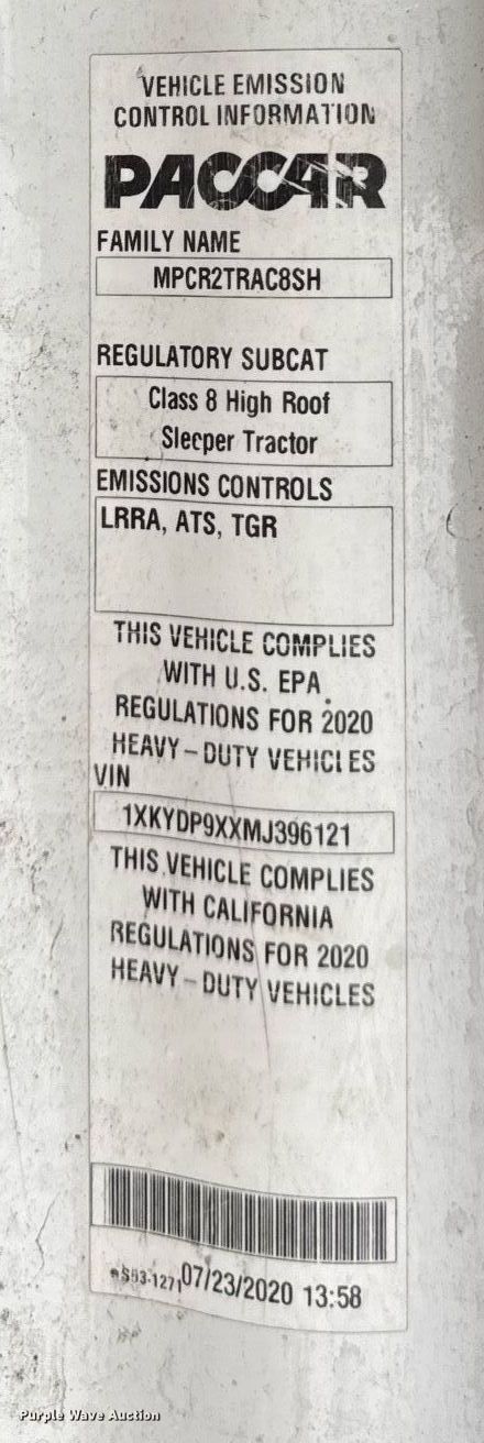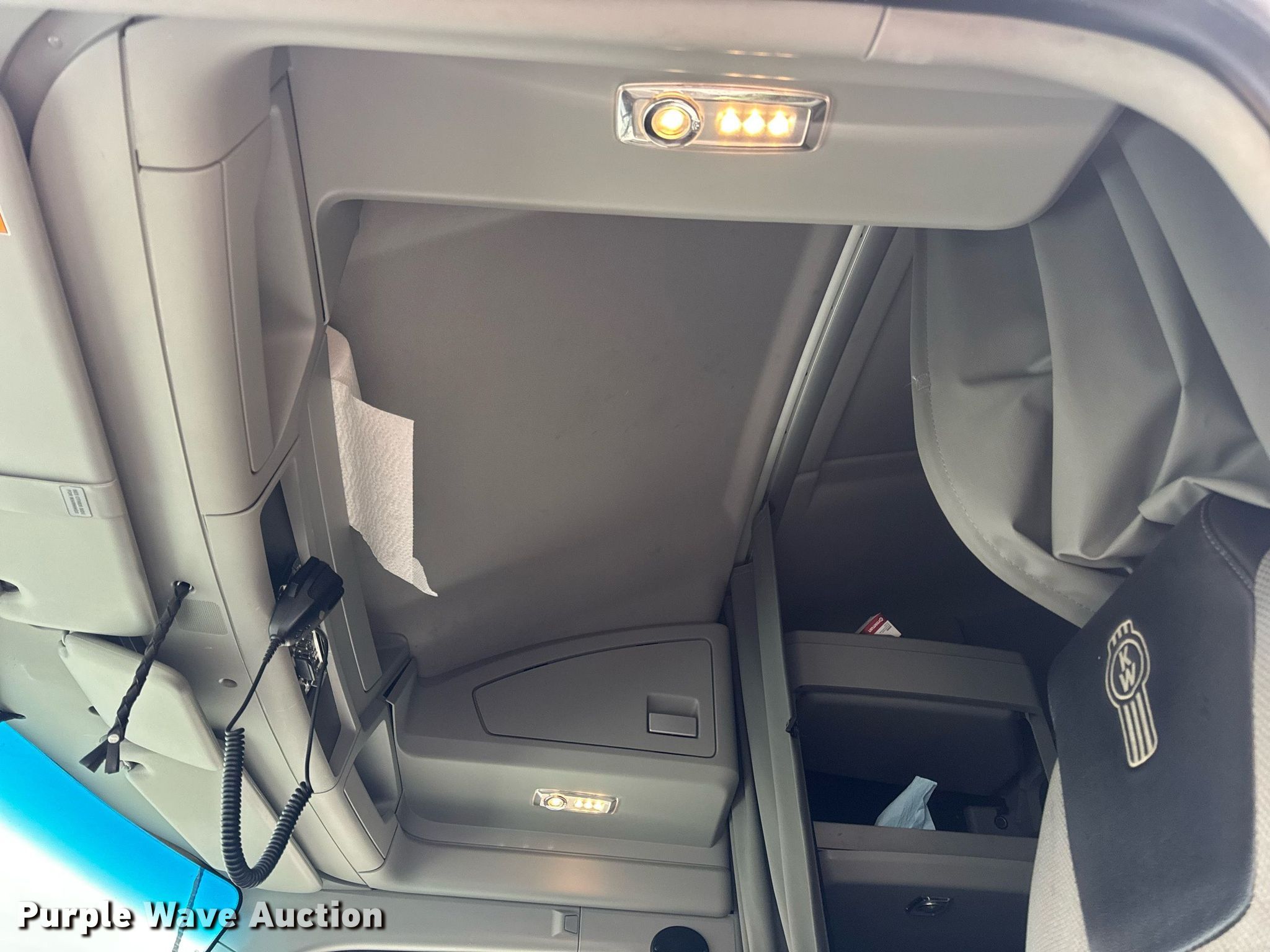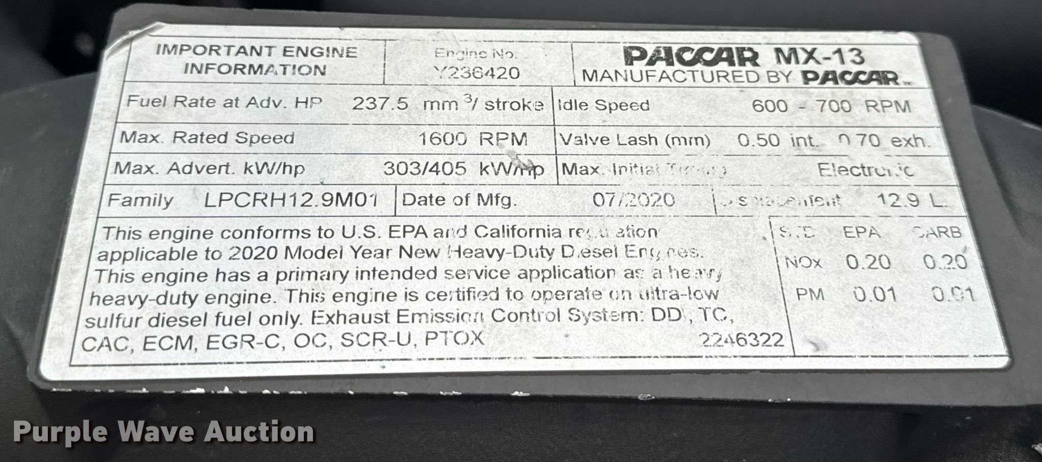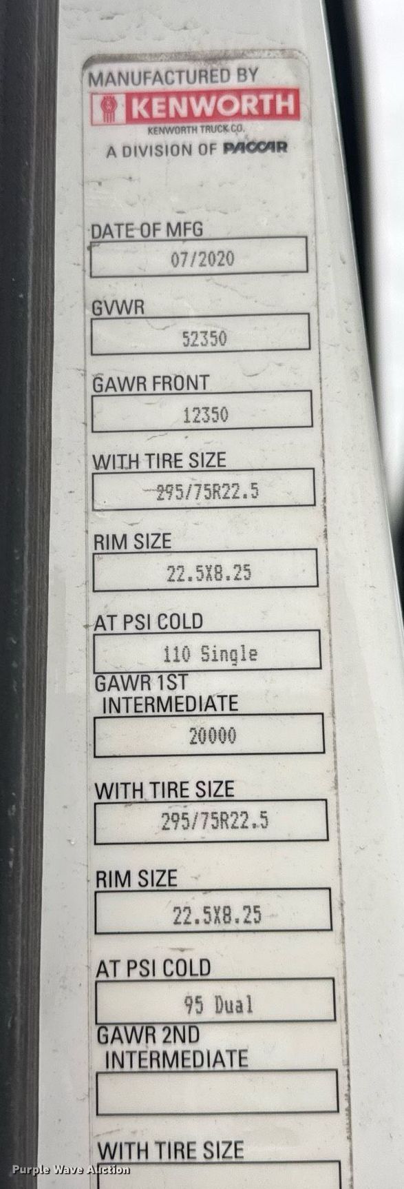 2021 Kenworth T680 semi truck. Miles: 438,500 on odometer, Hours: 9,932 on meter, Miles or hours may vary, unit still in use, VIN: 1XKYDP9XXMJ396121. Engine Paccar MX-13, Serial: Y236420, Displacement: 12.9L, Cylinders: 6, Fuel type: Diesel, HP: 405, Engine brake. Transmission Automated manual. Chassis Axles: Tandem, Differential lock: Inter-axle, Suspension: Air Dump valves, Brakes: Air, GVWR: 52,350 lbs FAWR: 12,350 lbs, IAWR: 20,000 lbs, RAWR: 20,000 lbs. Interior AC, Heat, Heated mirrors, Power windows, Power locks, Cruise control, Air ride cab, Sleeper Sleeper length: 64", Beds: Double bunk, Refrigerator, Rear climate control, Auxiliary power unit ThermoKing Evolution, Engine Yanmar TK270VFM.. Features Fifth wheel type: Air operated, Sliding, Fuel tank: Dual. Tires Size: 295/75R22.5. Notes Dash warning indicator: Check engine, Windshield chipped or cracked. Missouri prior salvage title. Title distribution may be delayed up to 14 days from verification of funds. Sedalia, MO 65301