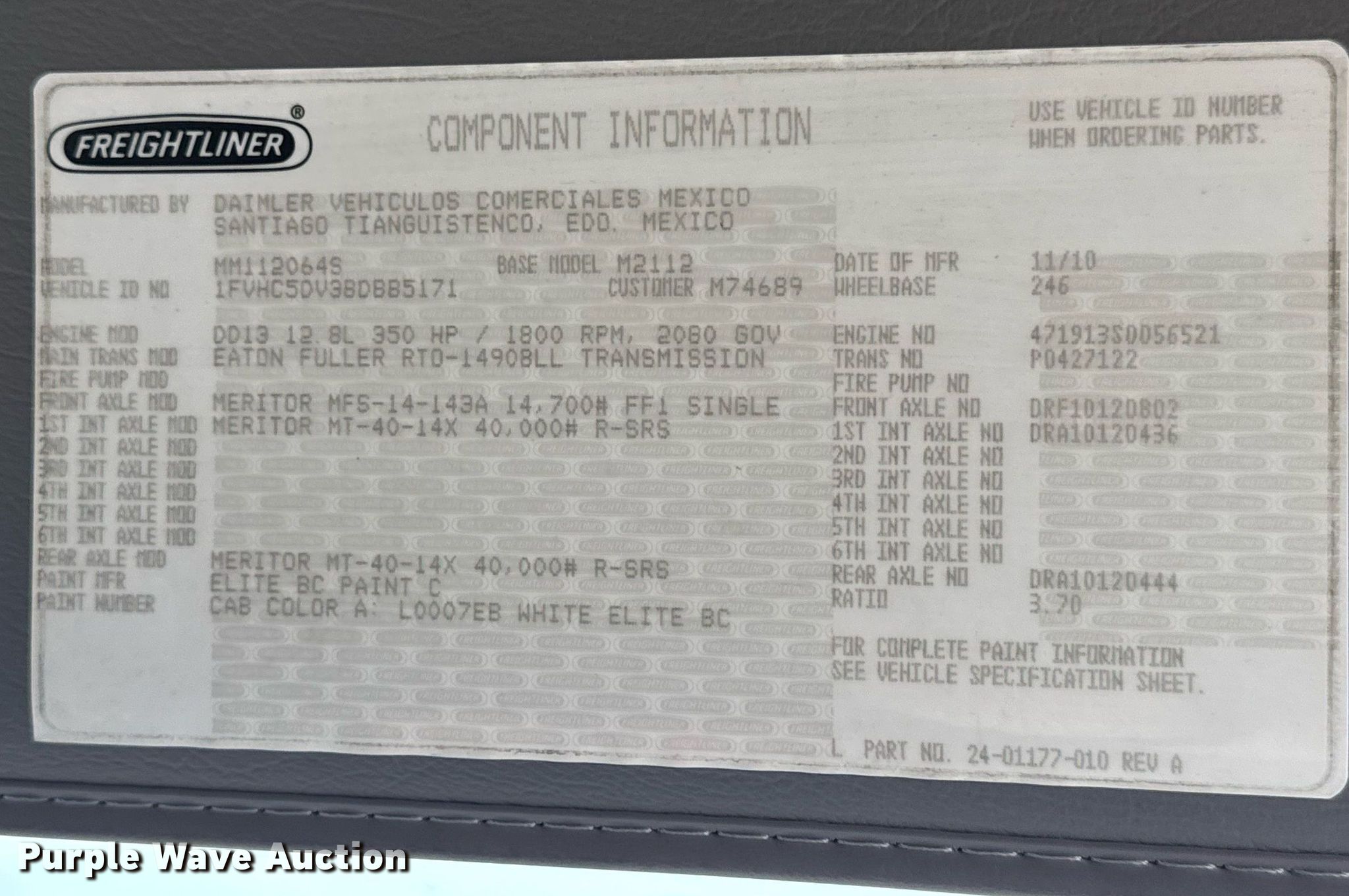 2011 Freightliner Business Class M2 flatbed truck. Miles: 734,518 on odometer, Hours: 19,828 on meter, VIN: 1FVHC5DV3BDBB5171. Engine Detroit Diesel DD13, Displacement: 12.8L, Cylinders: 6, Fuel type: Diesel. Transmission Eaton Fuller 8LL, Manual, Speed: 10. Chassis Axles: Tandem, Suspension: Air, Brakes: Air, GVWR: 54,600 lbs. Interior AC, Heat, Cruise control. Features Flatbed 23' 8" L x 102" W, Forklift mount. Tires Front: 12R22.5, Rear: 11R22.5. Notes Dash warning indicator: Check engine, DPF. Missouri title. Title distribution may be delayed up to 14 days from verification of funds. Frontier Metal LLC. Versailles, MO 65084