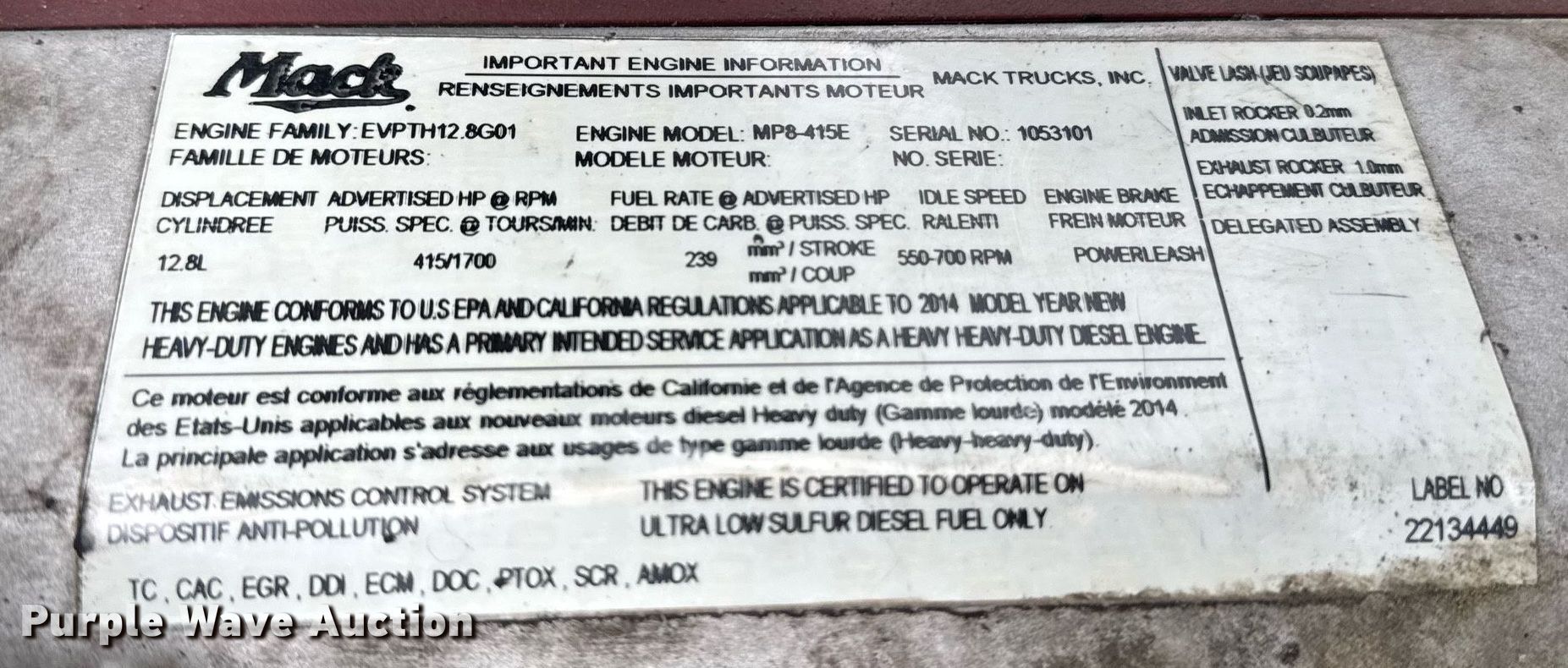 2015 Mack CXU613 semi truck. Miles: 703,581 on odometer, VIN: 1M1AW09Y7FM044834. Engine Mack MP8-415E, Serial: 1053101, Displacement: 12.7L, Cylinders: 6, Fuel type: Diesel, HP: 415, Engine brake. Transmission Manual, Eaton Fuller, Speed: 10. Chassis Axles: Tandem, Differential lock: Full, Suspension: Air Dump valves, Brakes: Air, GVWR: 52,000 lbs FAWR: 12,000 lbs, IAWR: 20,000 lbs, RAWR: 20,000 lbs. Interior AC, Heat, Heated mirrors, Cruise control, Air ride cab. Features Deck plates: Aluminum, Fifth wheel type: Fixed, Fuel tank: Single. Tires Size: 275/80R22.5. North Carolina title. Title distribution may be delayed up to 14 days from verification of funds. Smithfield Hog Production. Waverly, VA 23890