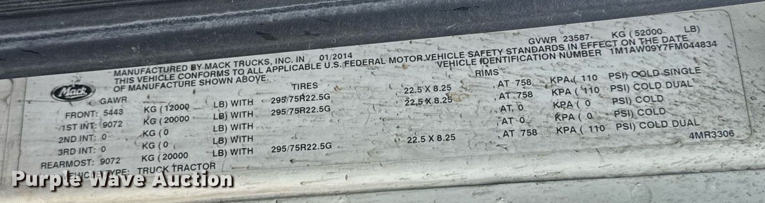 Purple Wave is selling a used Truck Tractor in Virginia. This item is a 2015 Mack CXU613 semi truck with the following: Miles: 703,581 on odometer, VIN: 1M1AW09Y7FM044834