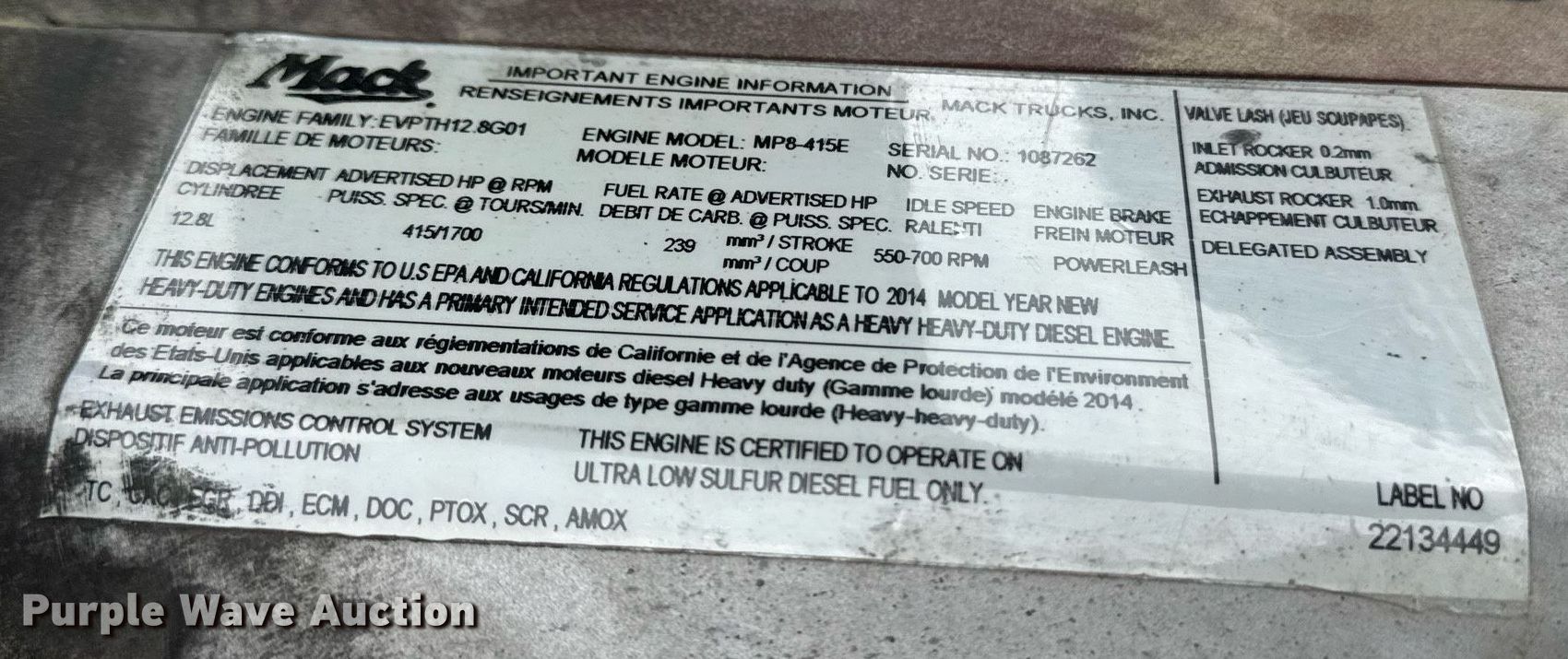 2015 Mack CXU613 semi truck. Miles: 48,672 on odometer, VIN: 1M1AW09Y7FM052304. Engine Mack MP8, Displacement: 12.7L, Cylinders: 6, Fuel type: Diesel, Engine brake. Transmission Manual, Eaton Fuller, Speed: 10. Chassis Axles: Tandem, Differential lock: Full, Suspension: Air Dump valves, Brakes: Air, GVWR: 53,200 lbs FAWR: 13,200 lbs, IAWR: 20,000 lbs, RAWR: 2,000 lbs. Interior AC, Heat, Heated mirrors, Cruise control, Air ride cab. Features Deck plate: Aluminum, Fifth wheel type: Fixed, Fuel tank: Single. Tires Front: 275/80R22.5, Rear: 295/75R22.5. Notes Dash warning indicator: ABS. Virginia title. Title distribution may be delayed up to 14 days from verification of funds. Smithfield Hog Production. Waverly, VA 23890