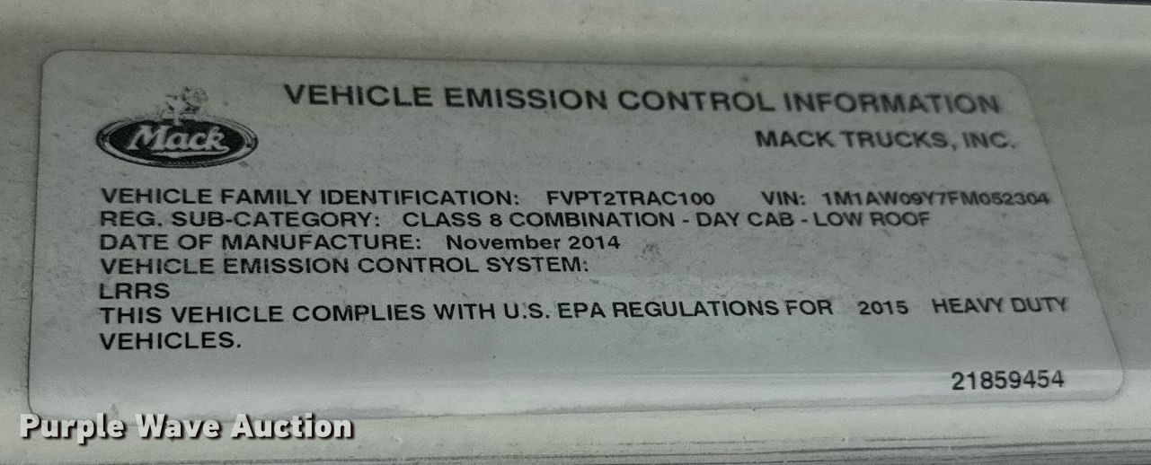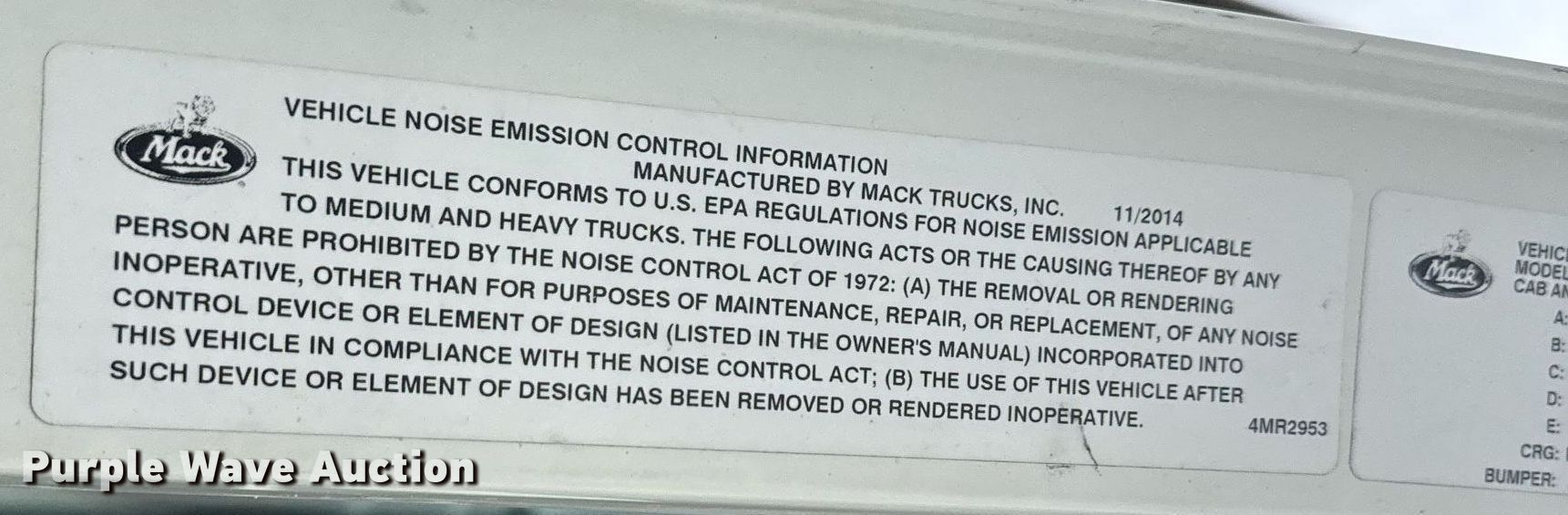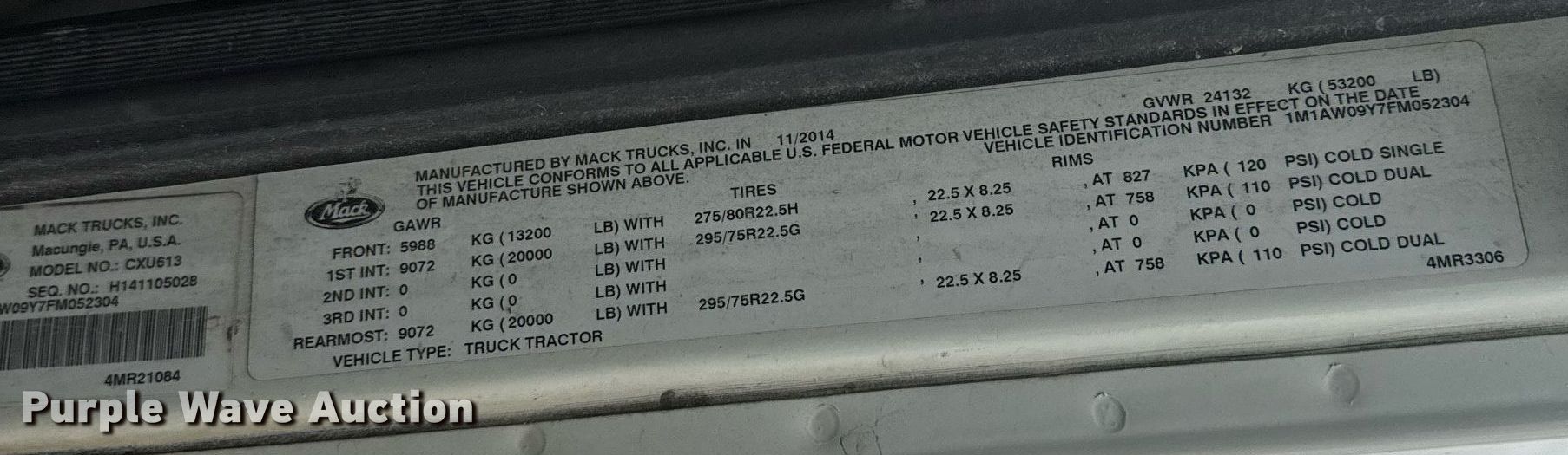 Purple Wave is selling a used Truck Tractor in Virginia. This item is a 2015 Mack CXU613 semi truck with the following: Miles: 48,672 on odometer, VIN: 1M1AW09Y7FM052304