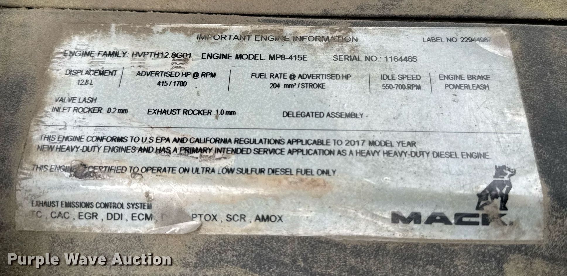 2017 Mack CXU semi truck. Miles: 981,826 on odometer, VIN: 1M1AW09YXHM084621. Engine Mack MP8-415E, Serial: 1164465, Displacement: 12.7L, Cylinders: 6, Fuel type: Diesel, HP: 415, Engine brake. Transmission Manual, Eaton Fuller, Speed: 10. Chassis Axles: Tandem, Differential lock: Full, Suspension: Air Dump valves, Brakes: Air, PTO, Wet kit, GVWR: 53,200 lbs FAWR: 13,200 lbs, IAWR: 20,000 lbs, RAWR: 20,000 lbs. Interior AC, Heat, Heated mirrors, Cruise control, Air ride cab. Features Deck plate: Aluminum, Fifth wheel type: Fixed, Fuel tank: Single. Tires Size: 275/80R22.5. Notes Dead battery. Virginia title. Title distribution may be delayed up to 14 days from verification of funds. Smithfield Hog Production. Waverly, VA 23890