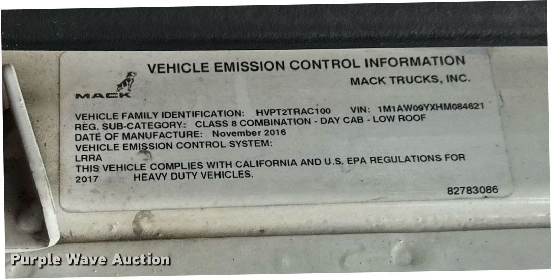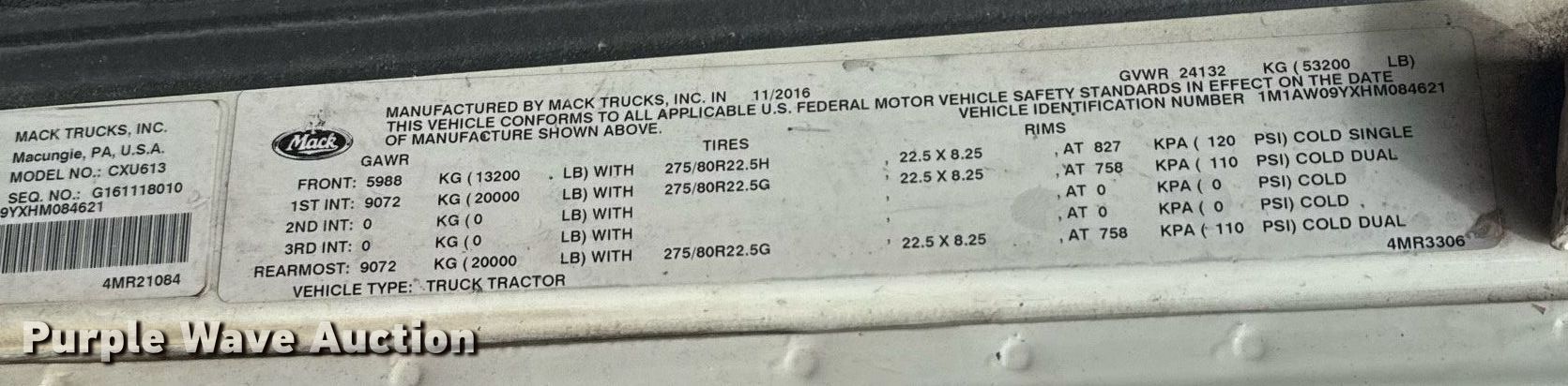 Purple Wave is selling a used Truck Tractor in Virginia. This item is a 2017 Mack CXU semi truck with the following: Miles: 981,826 on odometer, VIN: 1M1AW09YXHM084621