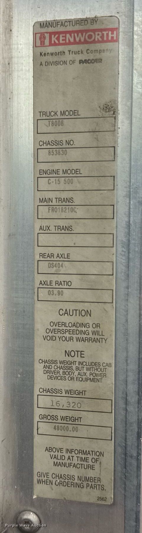 2000 Kenworth T800 semi truck. Miles: 282,692 on odometer, VIN: 1XKDDB9X1YR853830. Engine Caterpillar C-15, Serial: 6NZ00596, Displacement: 14.6L, Cylinders: 6, Fuel type: Diesel, Engine brake. Transmission Eaton Fuller FR018210C, Manual, Speed: 10. Chassis Axles: Triple, Pusher axle, Differential lock: Inter-axle, Suspension: Air Dump valves, Brakes: Air. Interior AC, Heat, Heated mirrors, Cruise control. Features Deck plate: Aluminum, Fifth wheel type: Air operated, Sliding, Fuel tank: Dual. Tires Size: 295/75R22.5. Notes Driver side mirror broken. Kansas title. Mileage has not been verified. Exempt will be written in the odometer disclosure on the title. Title distribution may be delayed up to 14 days from verification of funds. Dustrol Inc.. Towanda, KS 67144