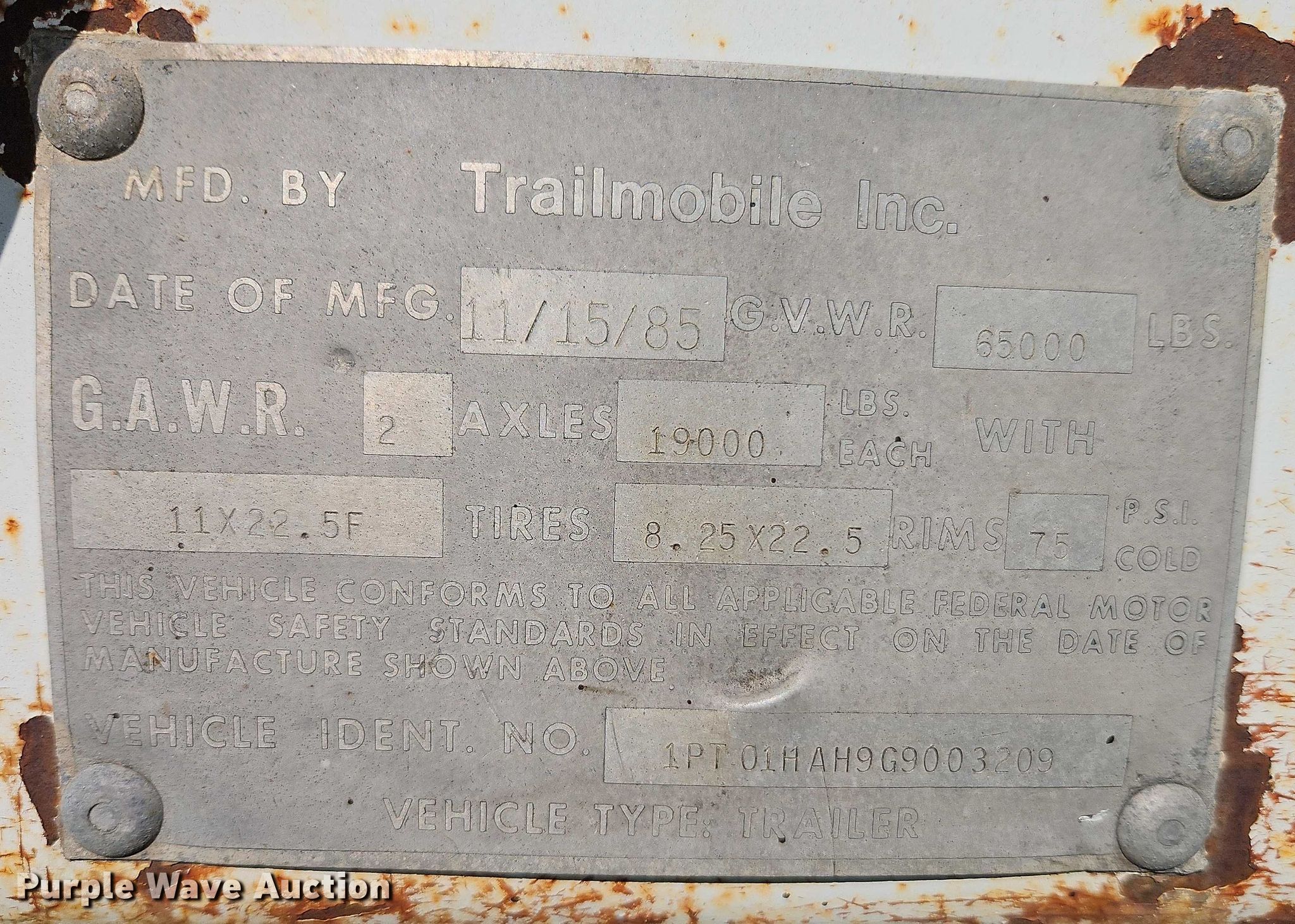 1986 Trailmobile 01HA-1SAL dry van trailer. VIN: 1PT01HAH9G9003209. Dimensions Overall: 48' L x 102" W. Features Deck type: Wood. Chassis Landing gear: Dual, Suspension: Spring, Brakes: Air, Axles: Tandem Sliding, GVWR: 65,000 lbs., GAWR: 19,000 lbs.. Tires Steel wheels, Size: 295/75R22.5. Notes Contents included. Missouri title. Title distribution may be delayed up to 14 days from verification of funds. Lincoln, MO 65338