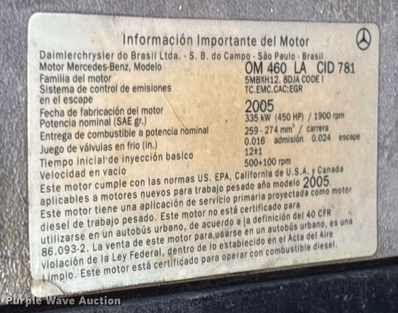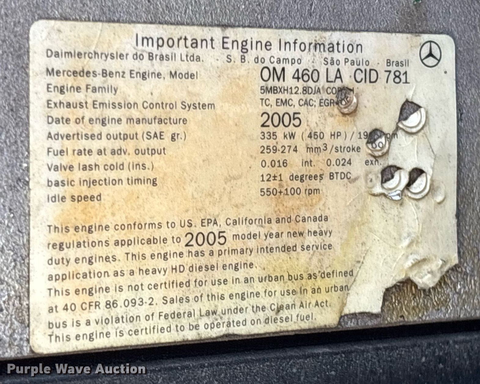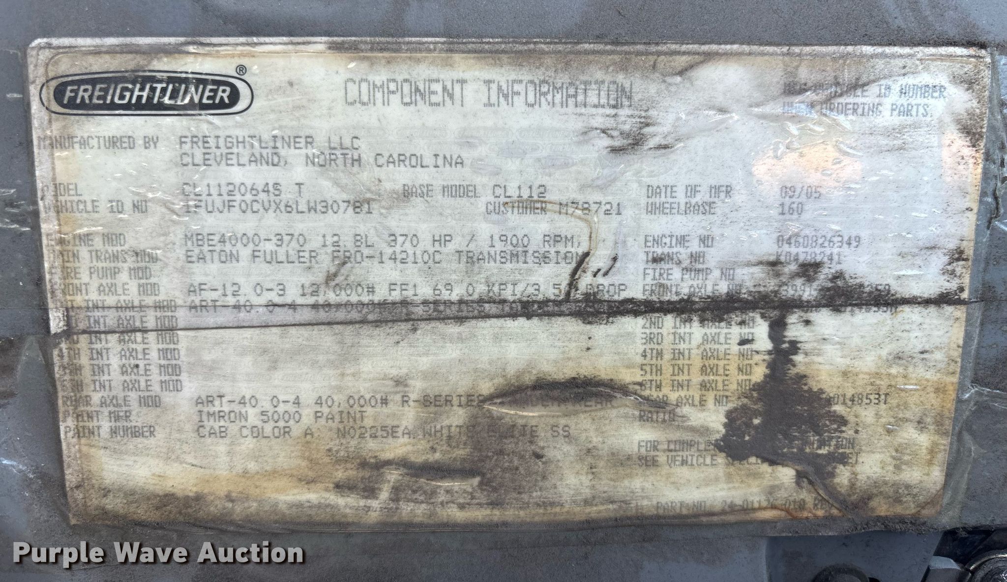 2006 Freightliner CL112 semi truck. Miles: 621,534 on odometer, Hours: 3,719 on meter, VIN: 1FUJF0CVX6LW30781. Engine Mercedes-Benz OM 460 LA, Displacement: 12.8L, Cylinders: 6, Fuel type: Diesel, Engine brake. Transmission Eaton Fuller FRO-14210C, Manual, Speed: 10. Chassis Axles: Tandem, Differential lock: Inter-axle, Suspension: Air, Brakes: Air, GVWR: 52,000 lbs. Interior AC, Heat, Air ride cab. Features Deck plate: Aluminum, Fifth wheel type: Air operated, Sliding, Fuel tank: Dual. Tires Front: 11R22.5, Rear: 295/75R22.5. Florida title. Title distribution may be delayed up to 30 days from verification of funds. Allegiance Crane & Equipment. Fort Lauderdale, FL 33311