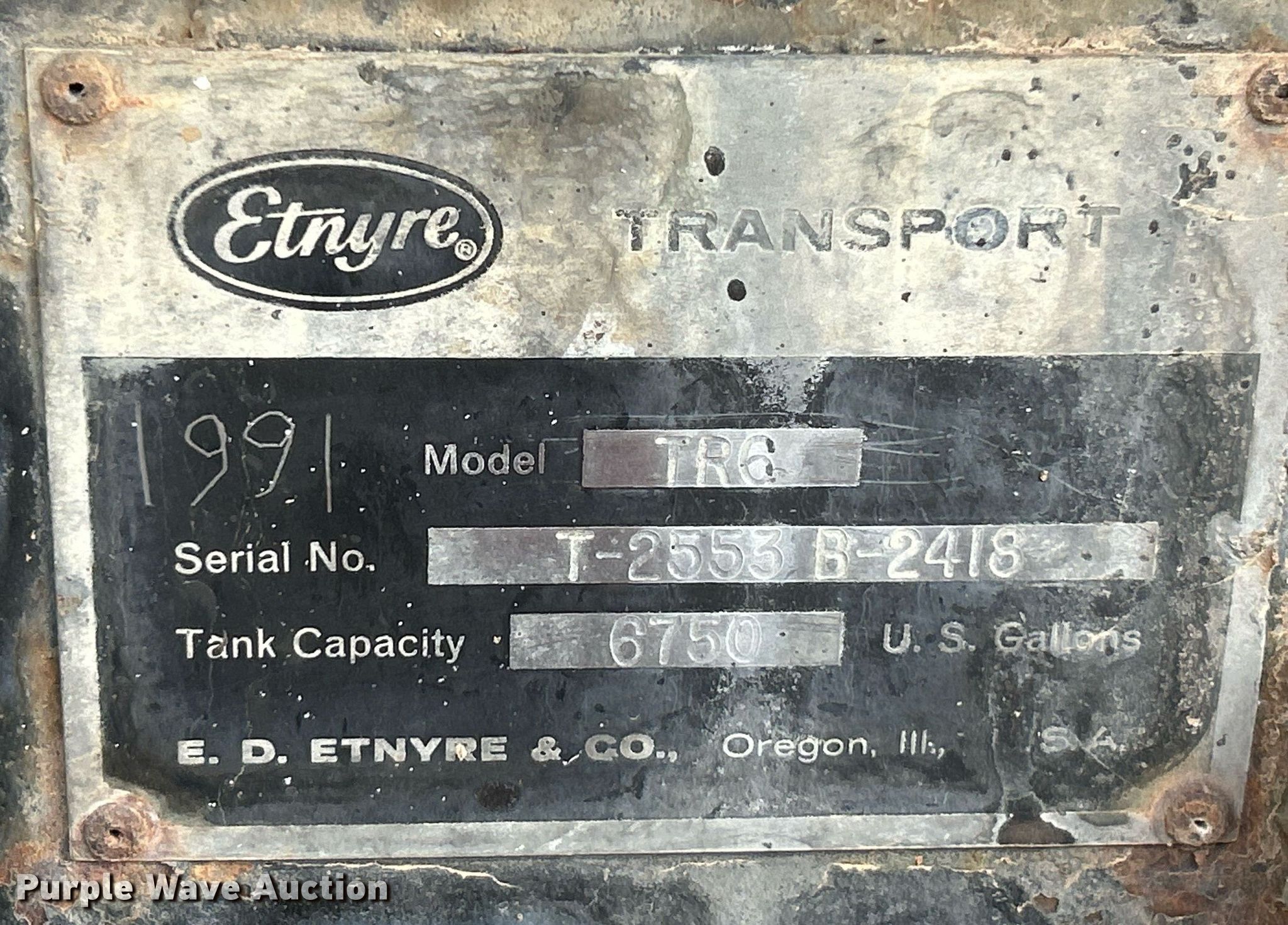 1991 Etnyre TR6 tank trailer. VIN: 1E9T44205ME007136, Unit #: 214. Dimensions Overall: 44' L x 93" W. Features Tank type: Steel Capacity: 6,750 gallons, Outlet valves: 1 Size: 4", No. of manways/manholes: 1 Width: 20". Chassis Landing gear: Dual, Suspension: Spring, Brakes: Air, Axles: Tandem. Tires Steel wheels, Size: 11R22.5. Notes Hoses not included. Missouri title. Title distribution may be delayed up to 30 days from verification of funds. Peterson Oil Company. Sullivan, MO 63080