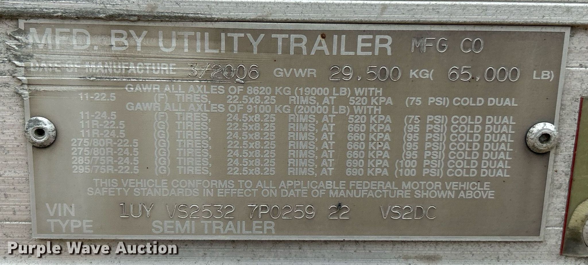 2007 Utility VS2DC dry van trailer. VIN: 1UYVS25327P025922. Dimensions Overall: 53' L x 102" W. Features Deck type: Wood. Chassis Landing gear: Dual, Suspension: Air, Brakes: Air, Axles: Tandem Sliding, GVWR: 65,000 lbs., GAWR: 29,500 lbs.. Tires Steel wheels, Size: 295/75R22.5. Missouri title. Title distribution may be delayed up to 14 days from verification of funds. Creech Logistics. Troy, MO 63379