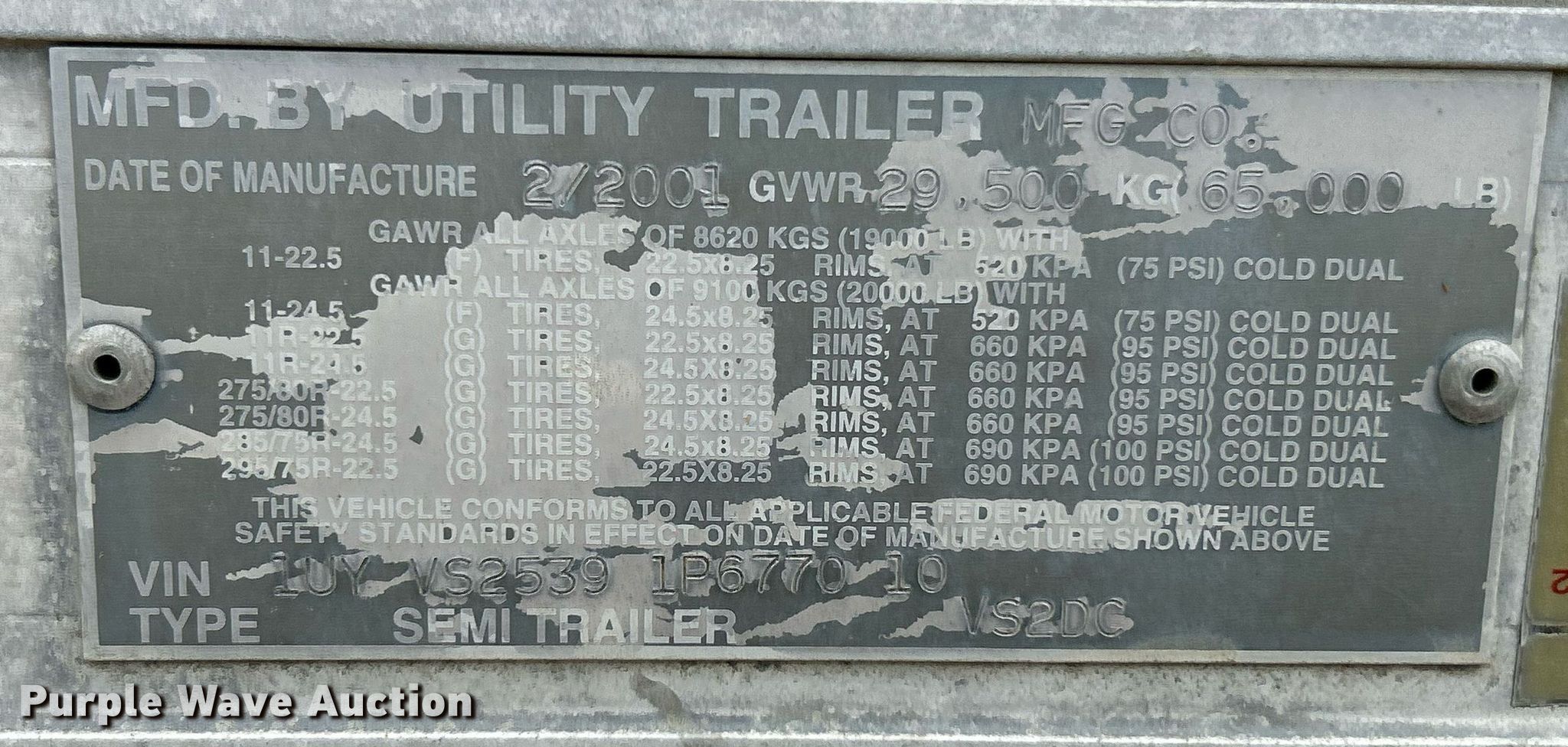 2001 Utility VS2DG dry van trailer. VIN: 1UYVS25391P677010. Dimensions Overall: 53' L x 102" W. Features Deck type: Wood, E-track rail system. Chassis Landing gear: Dual, Suspension: Air, Brakes: Air, Axles: Tandem Sliding, GVWR: 65,000 lbs, GAWR: 29,500 lbs. Tires Steel wheels, Size: 285/75R24.5. Missouri title. Title distribution may be delayed up to 14 days from verification of funds. Creech Logistics. Troy, MO 63379