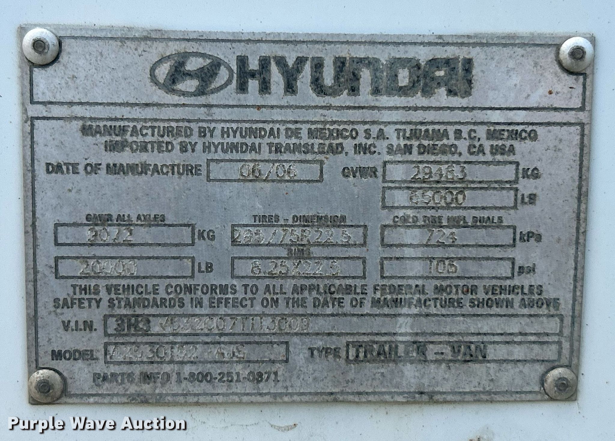 Purple Wave is selling a used Dry Van Trailer in Missouri. This item is a 2007 Hyundai dry van trailer with the following: VIN: 3H3V532C07T113009