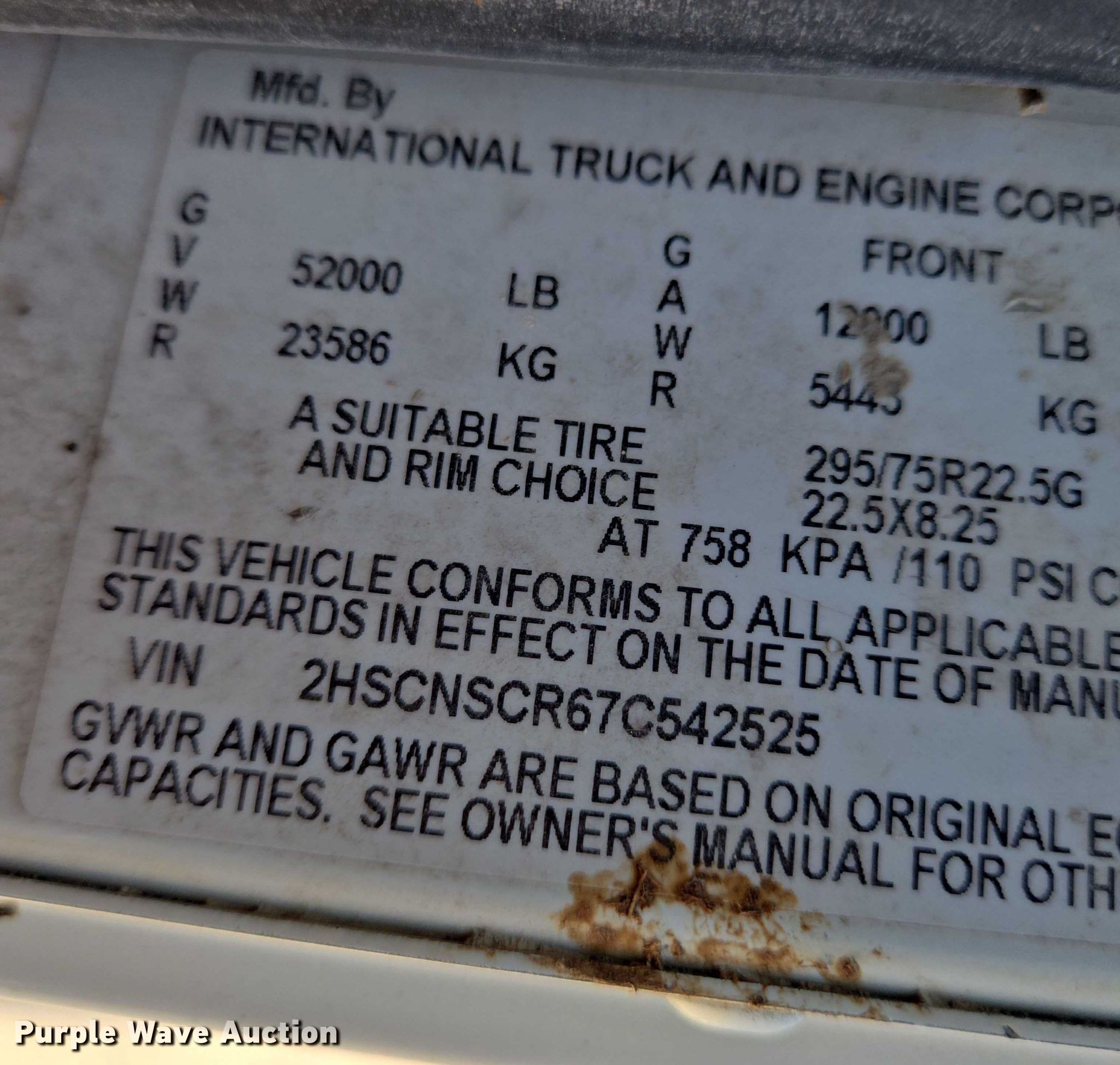 2007 International 9400i semi truck. Miles: 363,267 on odometer, Hours: 17,044 on meter, VIN: 2HSCNSCR67C542525. Engine Caterpillar, Displacement: 14.6L, Cylinders: 6, Fuel type: Diesel, Engine brake. Transmission Eaton Fuller, Manual, Speed: 10. Chassis Axles: Tandem, Differential lock: Inter-axle, Suspension: Air Dump valves, Brakes: Air, GVWR: 52,000 lbs FAWR: 12,000 lbs, IAWR: 20,000 lbs, RAWR: 20,000 lbs. Interior AC, Heat, Heated mirrors, Power passenger window, Cruise control, Air ride cab. Features Fifth wheel type: Air operated, Sliding, Fuel tank: Dual. Tires Size: 11R22.5. Kansas title. Title distribution may be delayed up to 14 days from verification of funds. Lincolnville, KS 66858