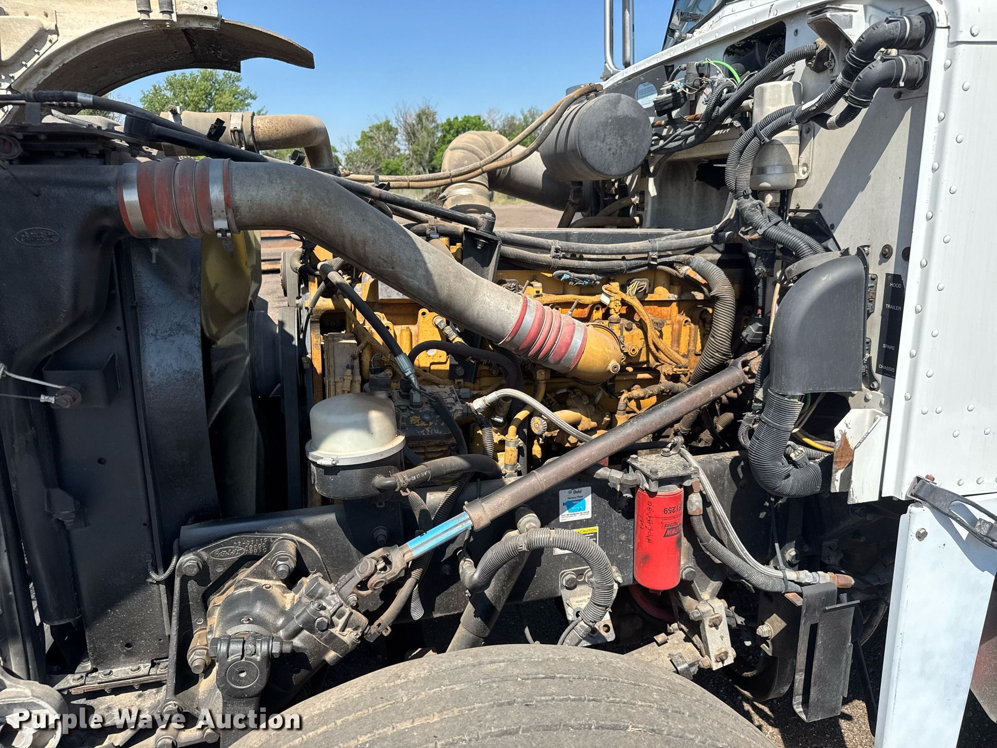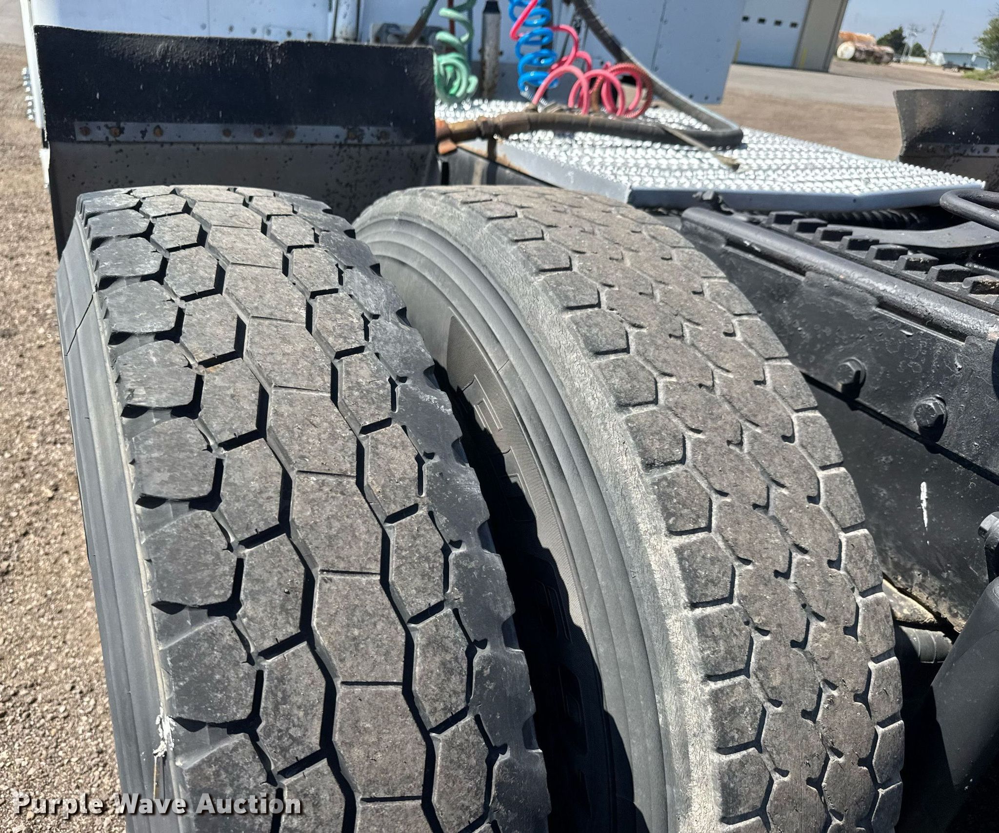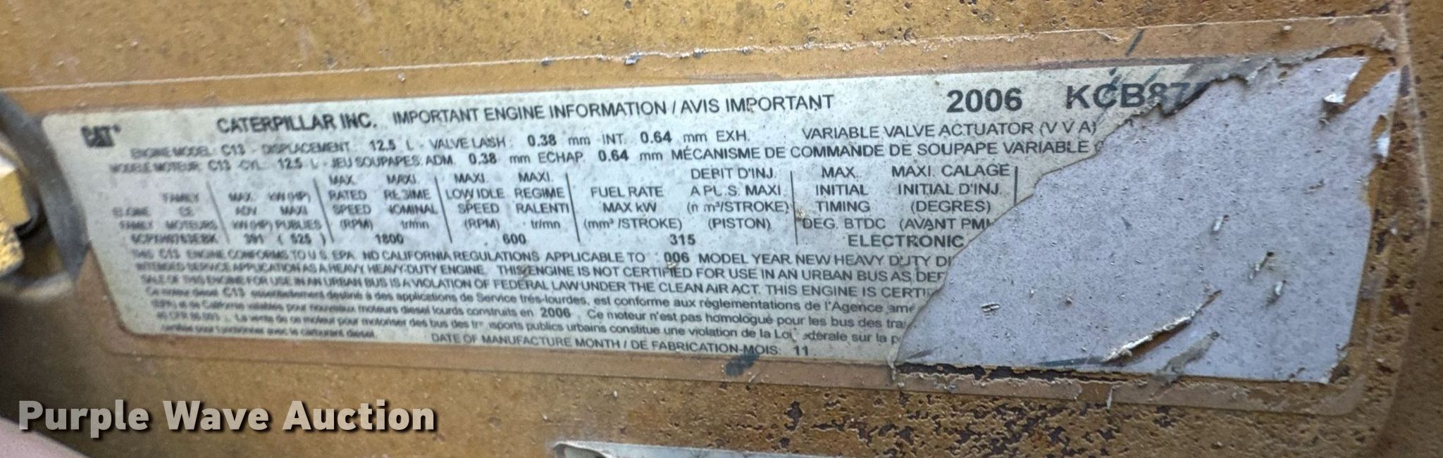 2007 Peterbilt 379 semi truck. Miles: 869,919 on odometer, Hours: 26,998 on meter, VIN: 1XP5DU9X97D689667. Engine Caterpillar C13 Acert, Displacement: 12.5L, Cylinders: 6, Fuel type: Diesel, Engine brake. Transmission Eaton Fuller, Manual, Speed: 10. Chassis Axles: Tandem, Differential lock: Inter-axle, Suspension: Air Dump valves, Brakes: Air, PTO, Wet kit, GVWR: 48,000 lbs FAWR: 12,000 lbs, IAWR: 18,000 lbs, Lift axle GAWR: 18,000 lbs. Interior AC, Heat, Heated mirrors, Power windows, Cruise control, Air ride cab, Sleeper Sleeper length: 48", Beds: Single, Rear climate control. Features Deck plate: Aluminum, Fifth wheel type: Air operated, Sliding, Fuel tank: Single. Tires Size: 11R24.5. Notes Windshield chipped or cracked. Kansas title. Title distribution may be delayed up to 14 days from verification of funds. Venture Corp. Great Bend, KS 67530