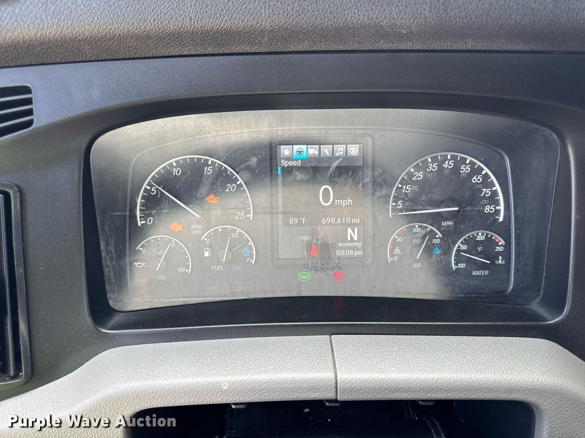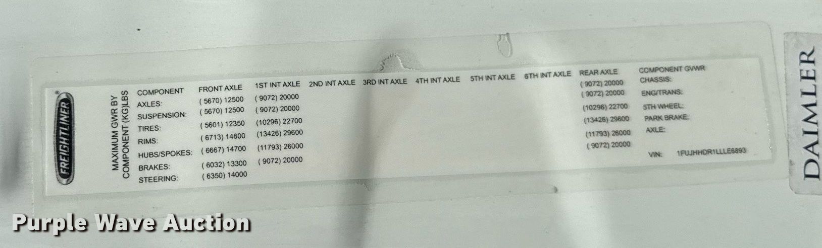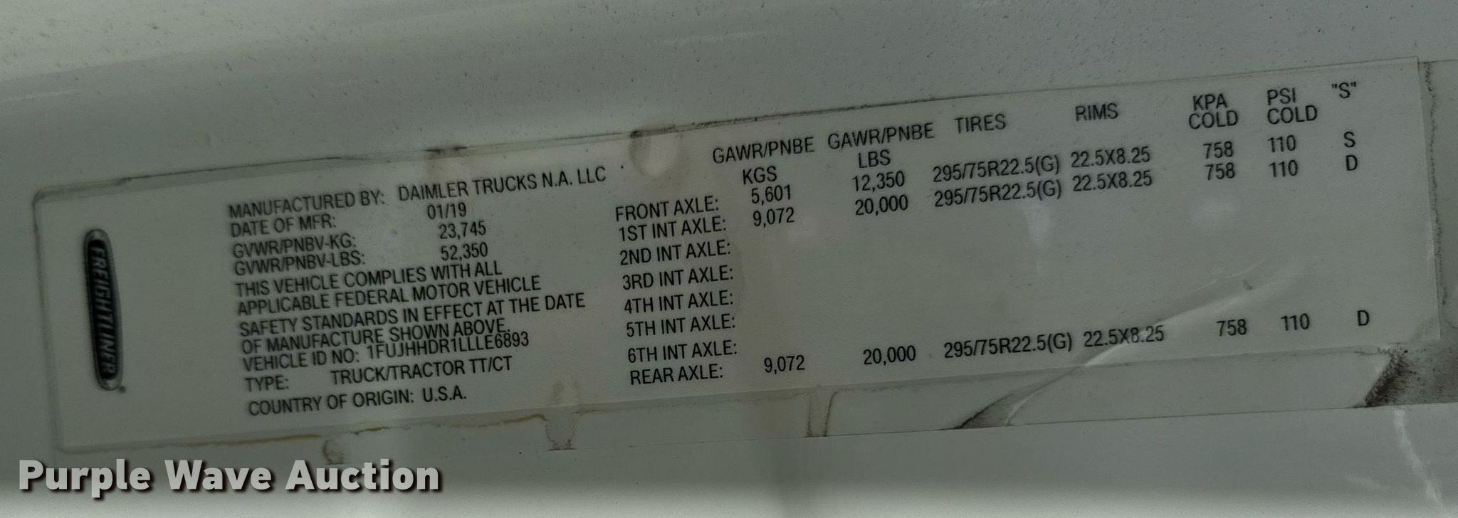 2020 Freightliner Cascadia 126 semi truck. Miles: 698,610 on odometer, Hours: 18,988 on meter, VIN: 1FUJHHDR1LLLE6893, Unit #: 55219495. Engine Detroit Diesel DD15, Serial: 472910S0649088, Displacement: 14.8L, Cylinders: 6, Fuel type: Diesel, Engine brake. Transmission Automated manual. Chassis Axles: Tandem, Differential lock: Inter-axle, Suspension: Air Dump valves, Brakes: Air, GVWR: 52,350 lbs FAWR: 12,350 lbs, IAWR: 20,000 lbs, RAWR: 20,000 lbs. Interior AC, Heat, Heated mirrors, Power windows, Power locks, Cruise control, Air ride cab, Sleeper Sleeper length: 72", Beds: Double bunk. Features Deck plate: Aluminum, Fifth wheel type: Air operated, Sliding, Fuel tank: Dual. Tires Front: 295/75R22.5, Rear: 275/80R22.5. Notes Dash warning indicator: Check engine, Electrical fault. Repossessed item, stored at a secured facility. Please review REQUIRED REMOVAL INSTRUCTIONS. Titles will be distributed after confirmation of payment and removal. Indiana title. Title distribution may be delayed up to 60 days from verification of funds. Lender Owned. Des Moines, IA 50317
