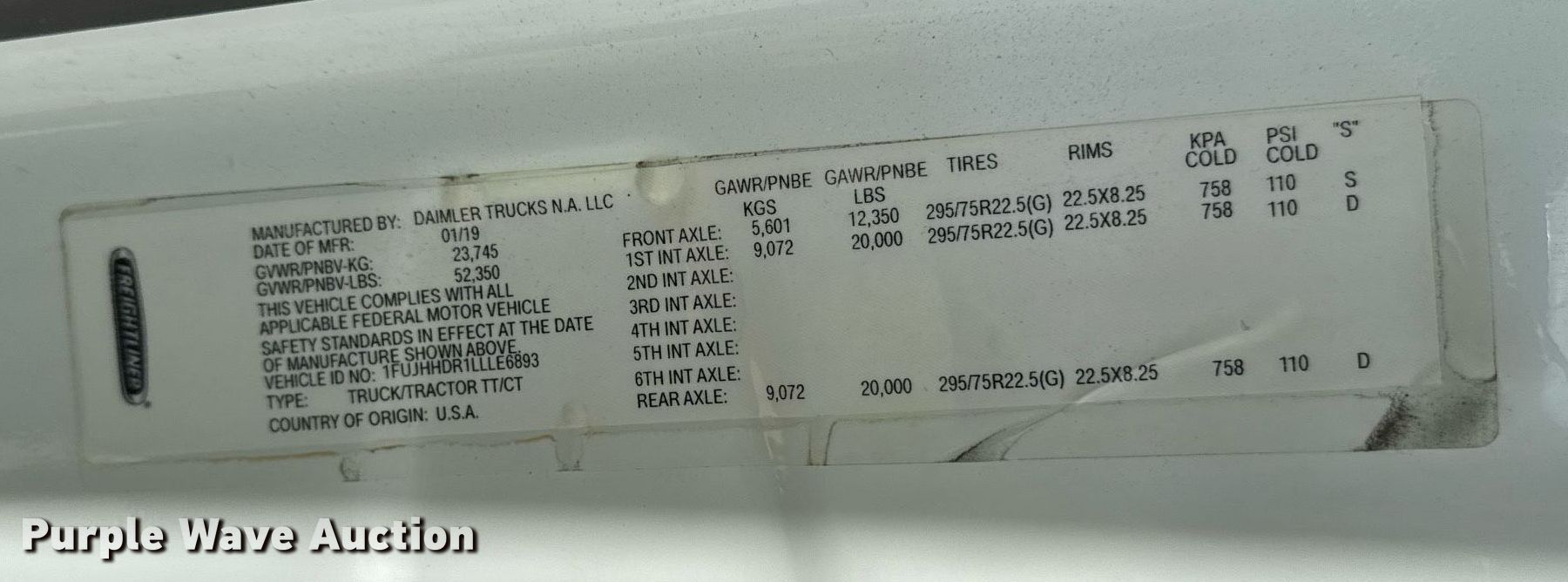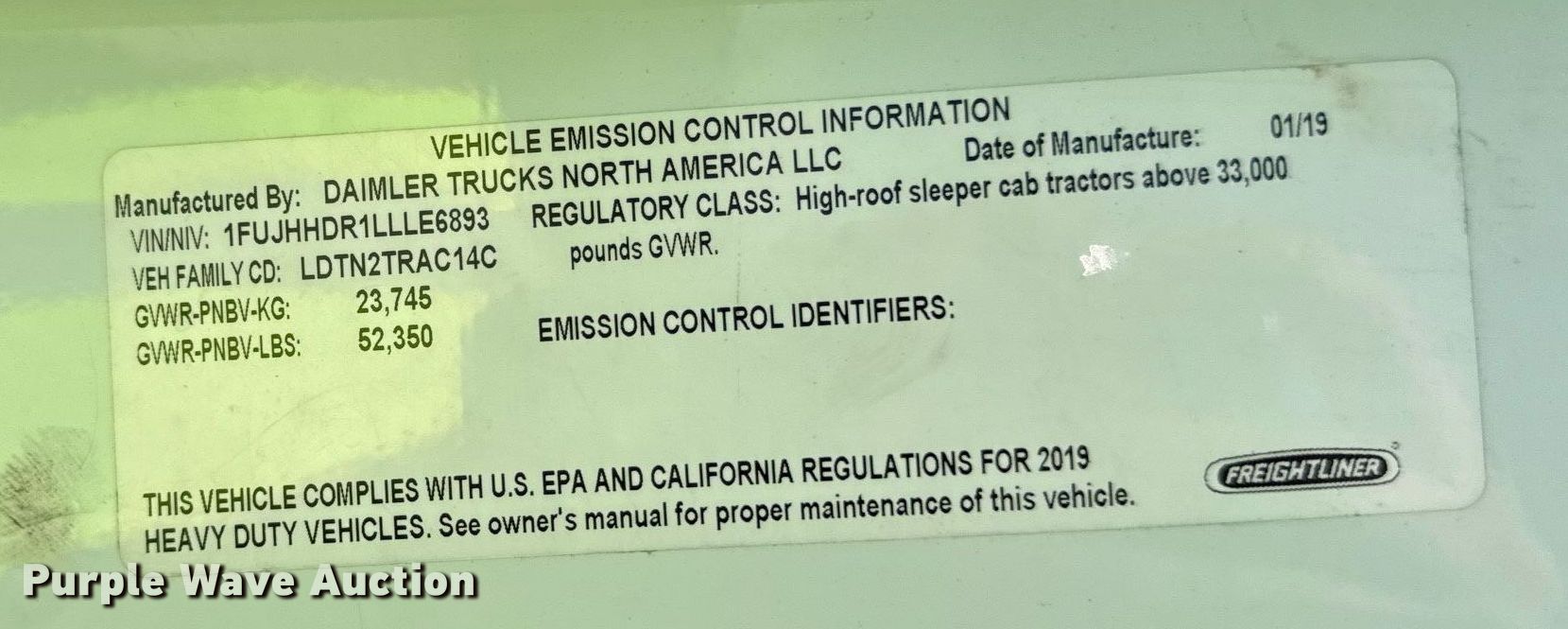 Purple Wave is selling a used Truck Tractor in Iowa. This item is a 2020 Freightliner Cascadia 126 semi truck with the following: Miles: 698,610 on odometer, Hours: 18,988 on meter, VIN: 1FUJHHDR1LLLE6893, Unit #: 55219495