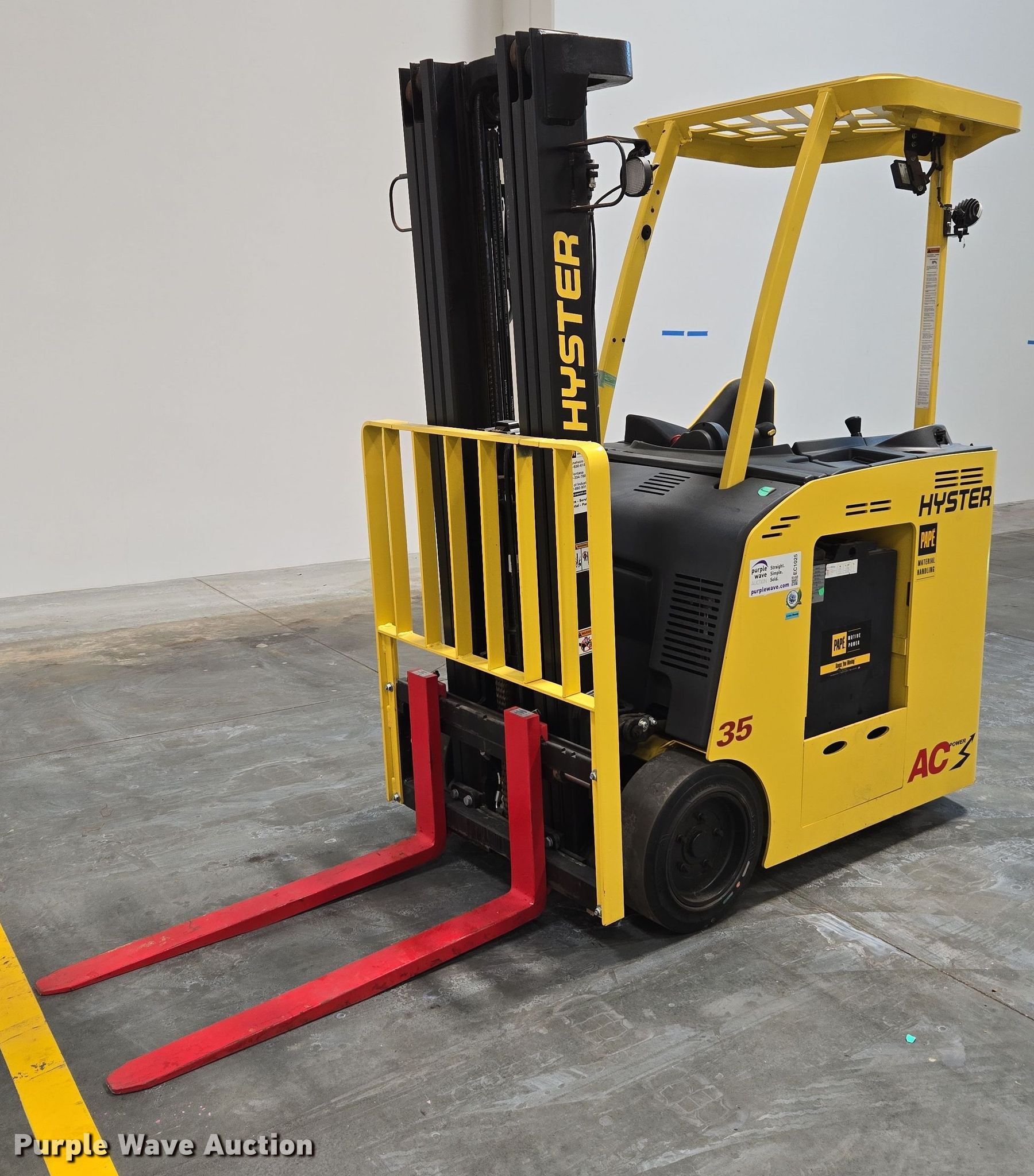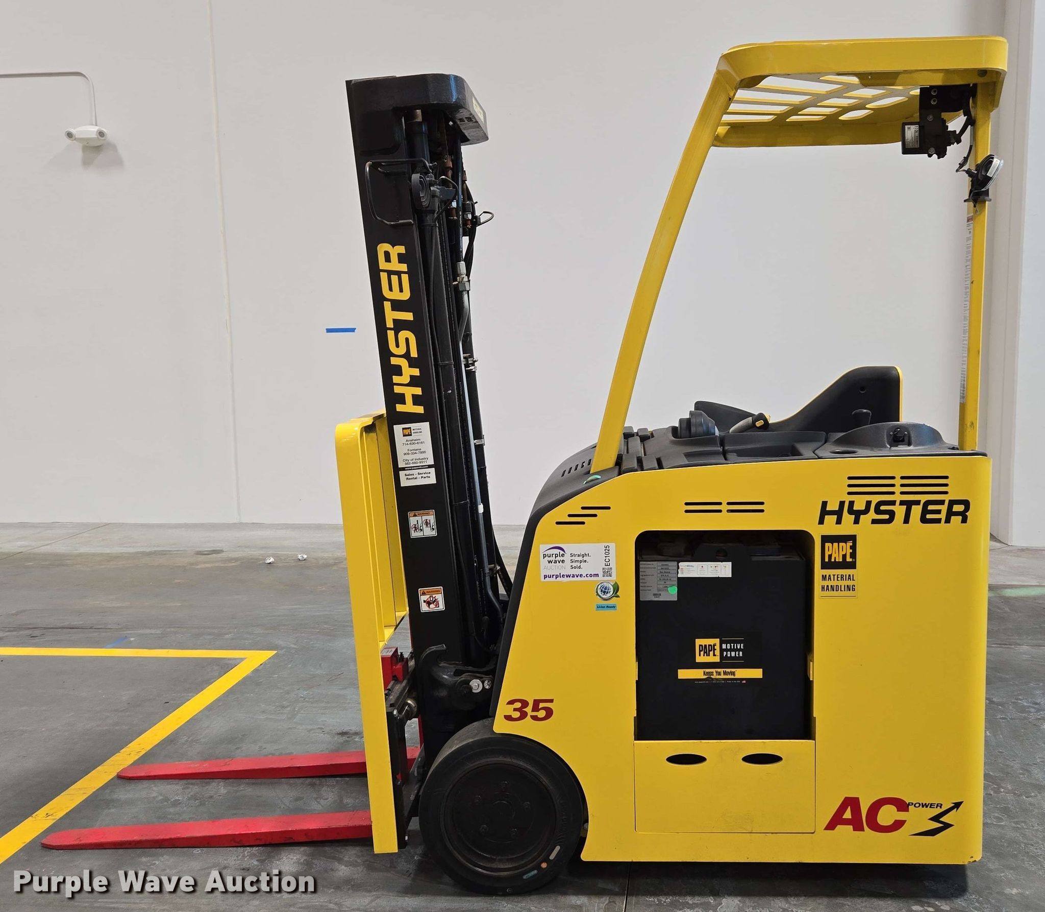 Purple Wave is selling a used Warehouse Forklift in California. This item is a 2023 Hyster E35HSD3-18 forklift with the following: Hours: 1 on meter